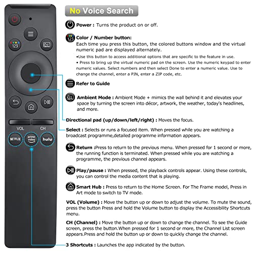 I was so mad when my son lost my remote and I saw a replacement is almost 100$ from Samsung. How do you lose a remote for more than a few minutes?!?! Where the heck is it?!?!I reluctantly ordered this knowing Amazon is the Walmart of the internet and you frequently get junk that doesn’t work or the sales description is misleading.No instructions came with it…. It turns out you don’t need them…. If you can put AA batteries in it, it just works…. Two remotes came super cheap…. If they don’t last, I dont really care…I couldn’t be happier that it just worked right out of the box and I didn’t have to try to make it work for hours. Most things like this are sold as easy to use but are normally far from it.