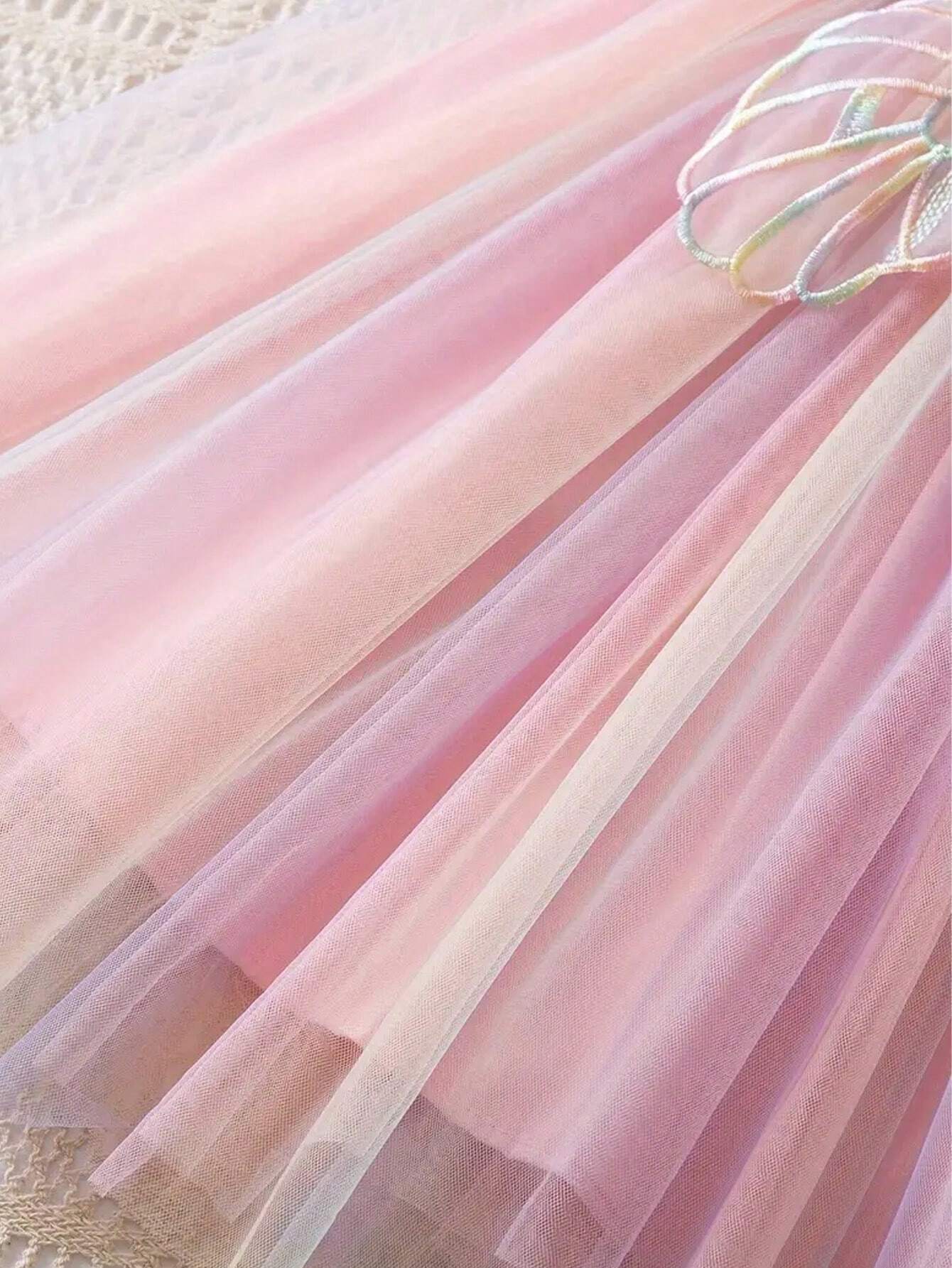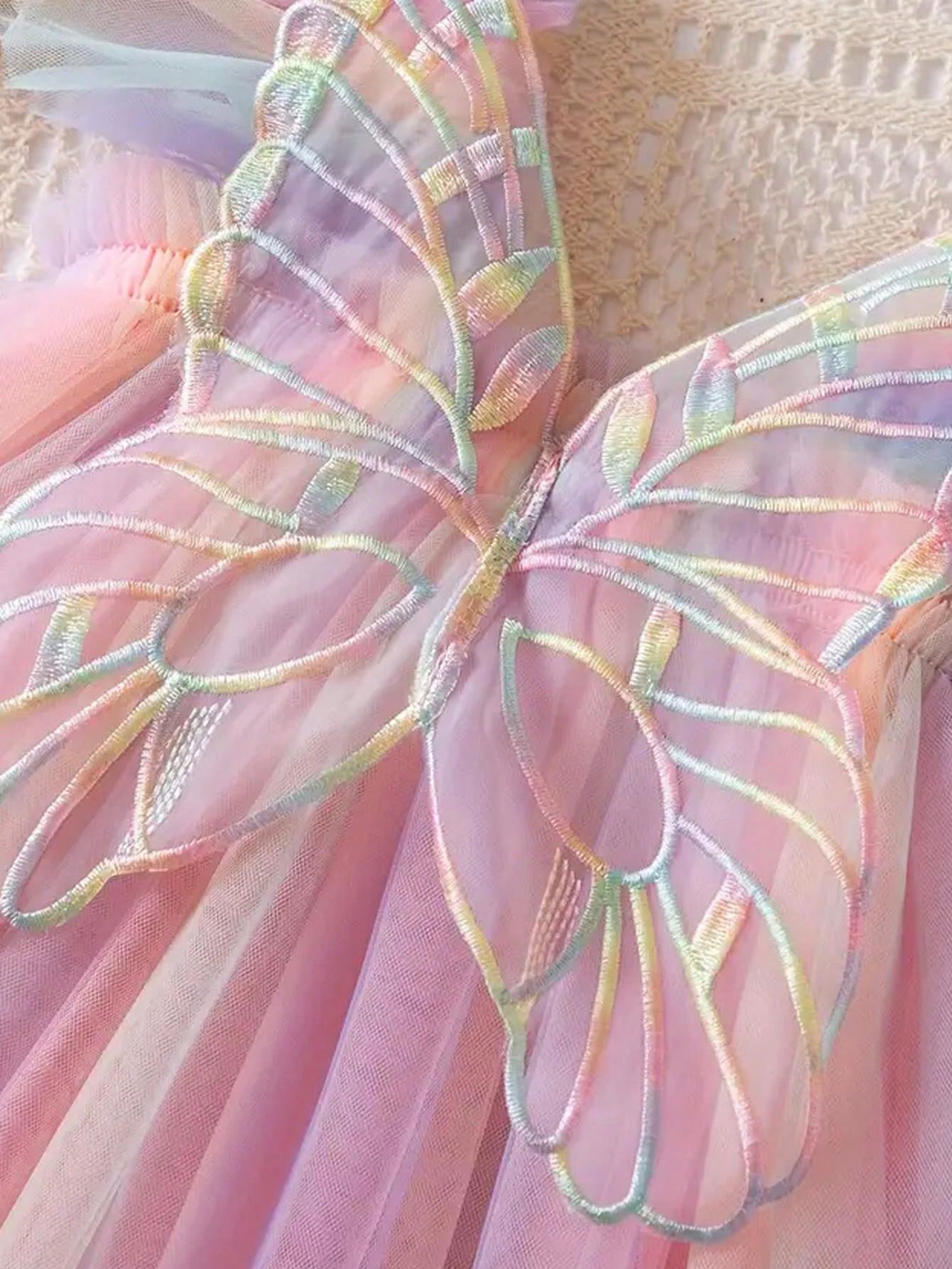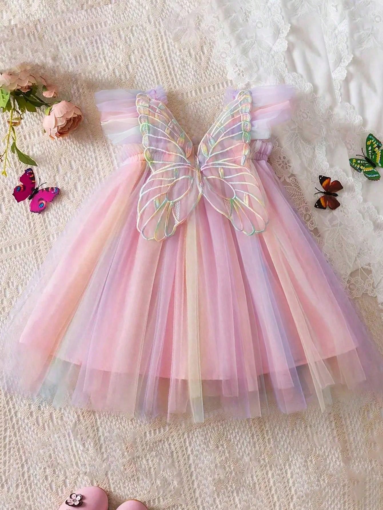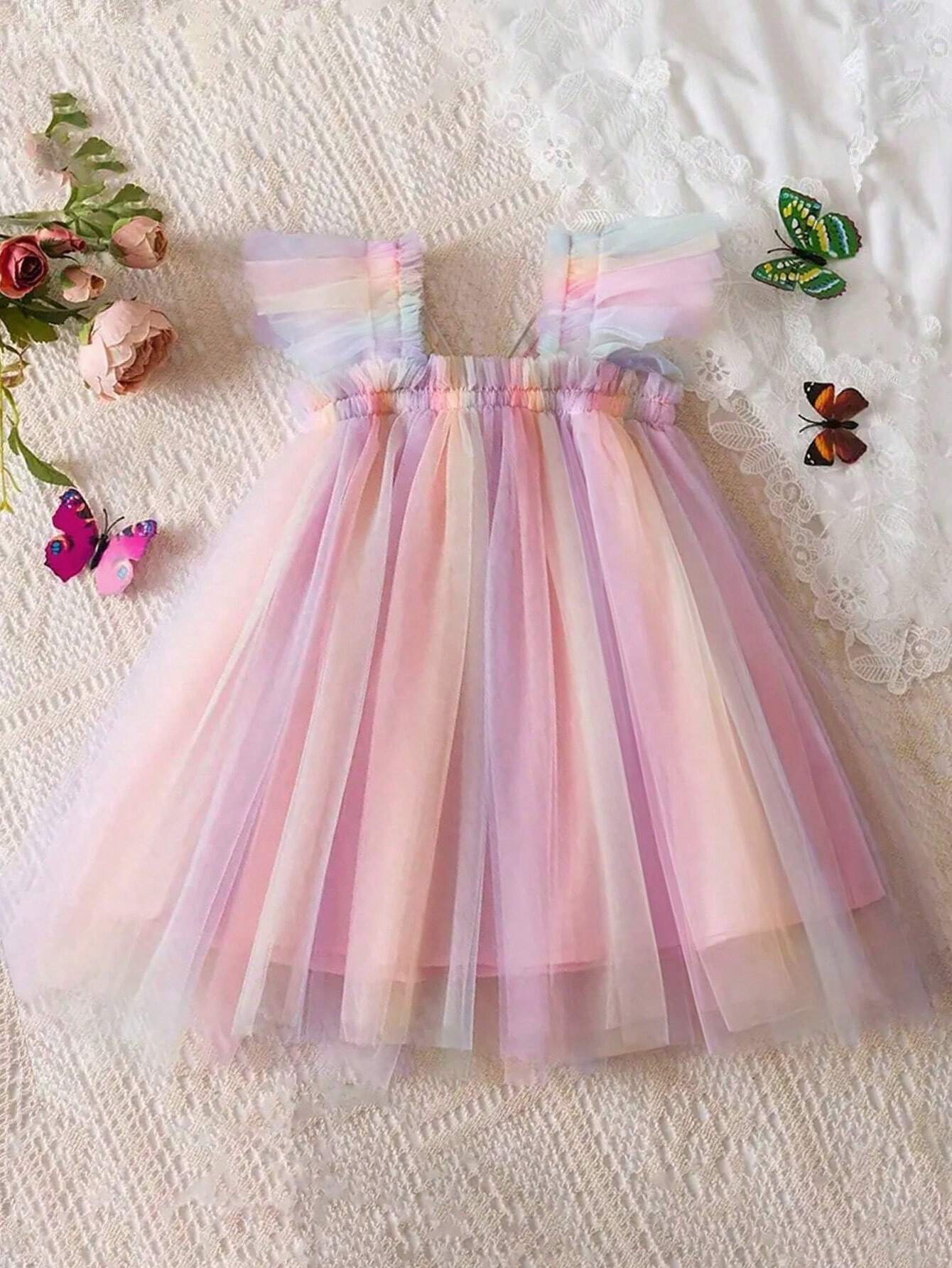 1pc Young Girl Cute Elegant Princess Cap Sleeve Rainbow Tulle Tutu Dress With 3D Butterfly Decoration, Perfect For Parties, Birthdays, Beach And Vacation In Summer Or Autumn