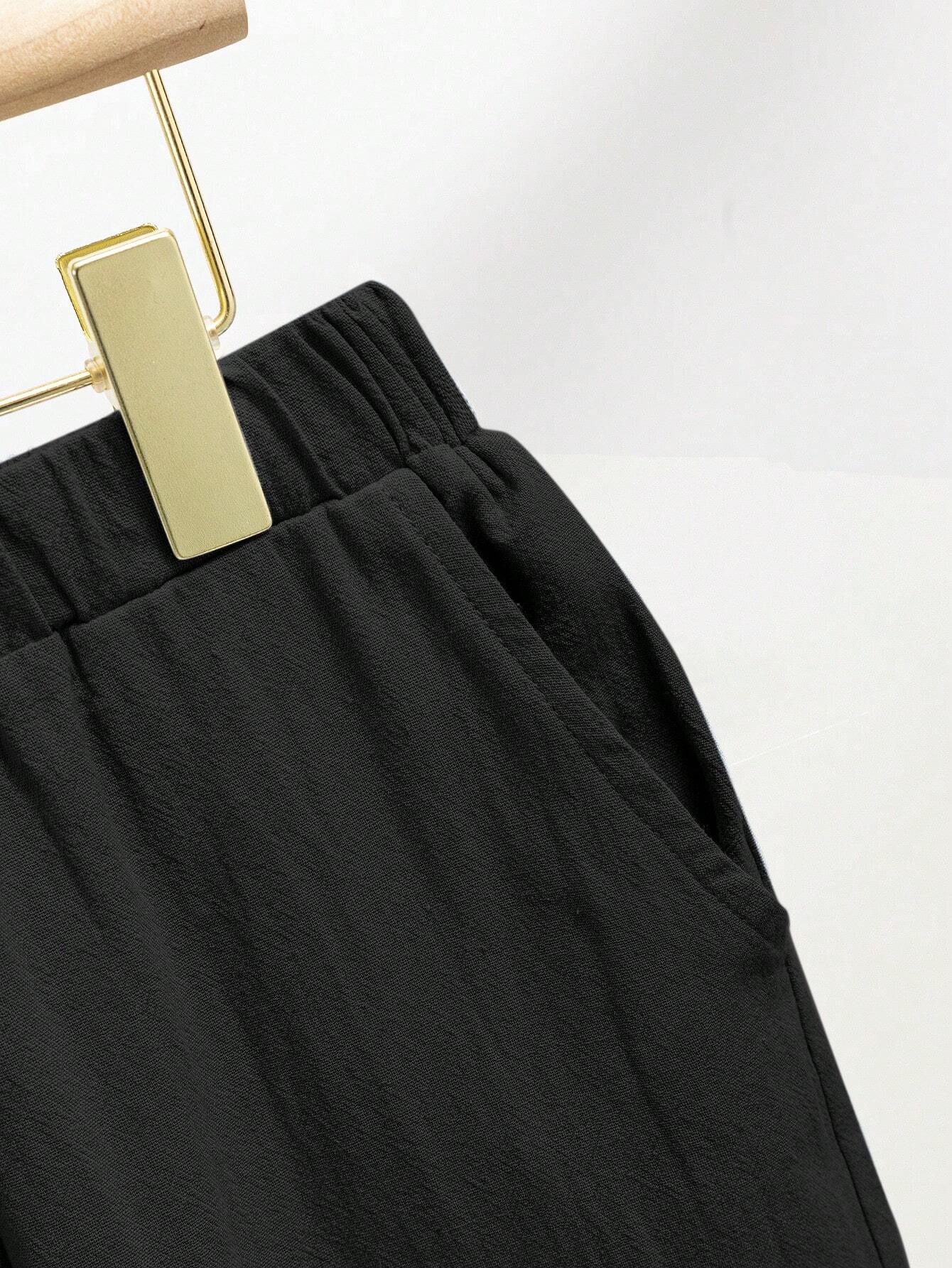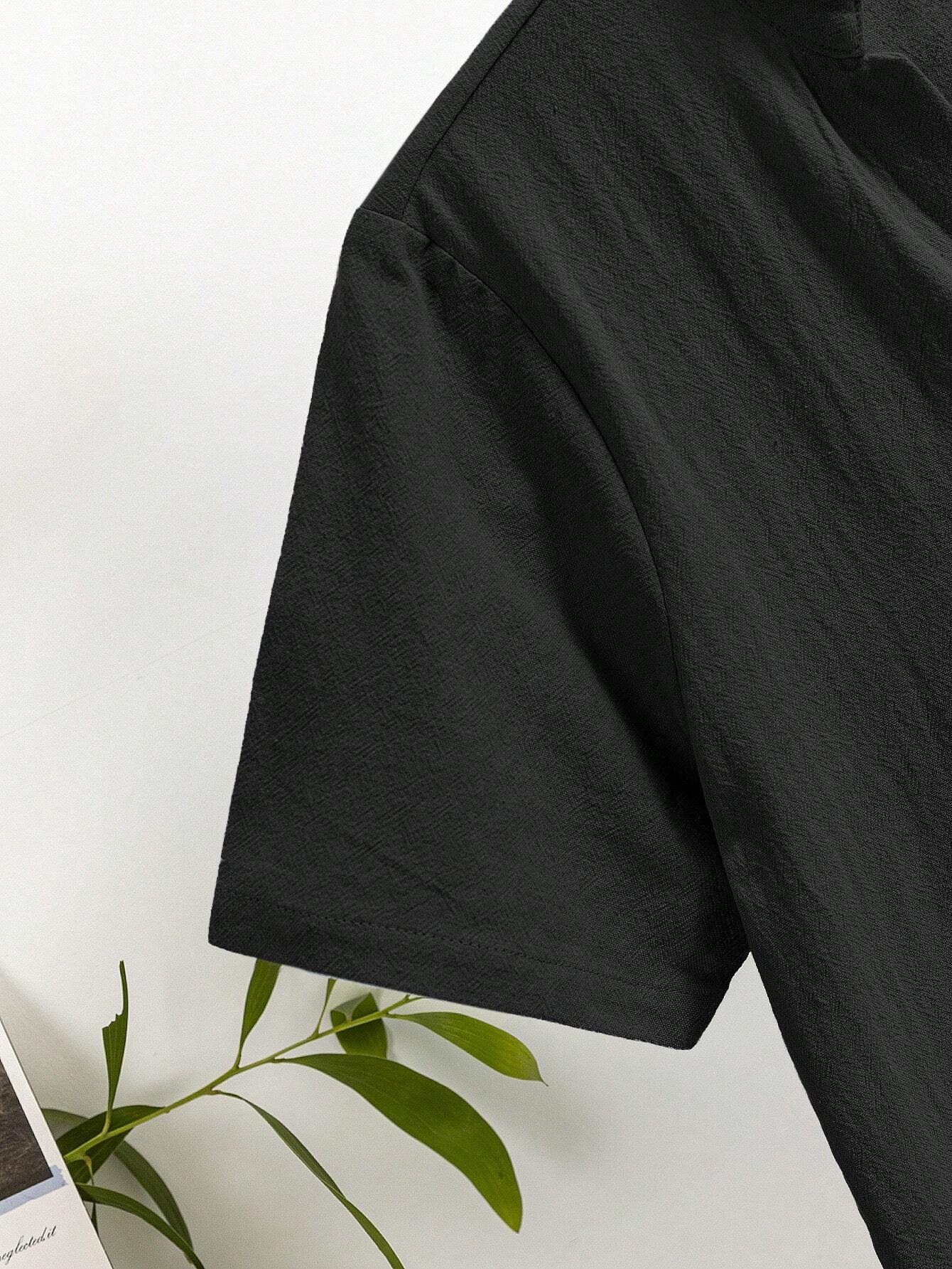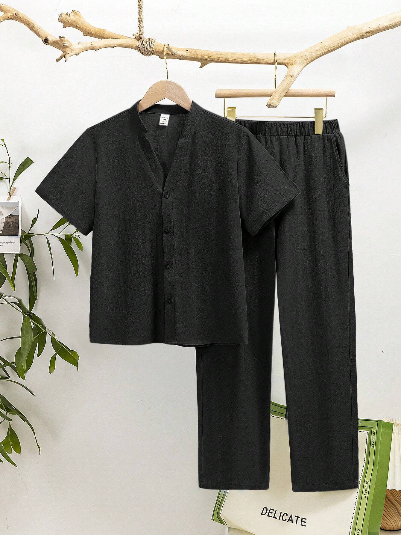 2pcs Tween Boy Loose Fit Stand Collar Solid Color Short Sleeve Shirt And Pants Set