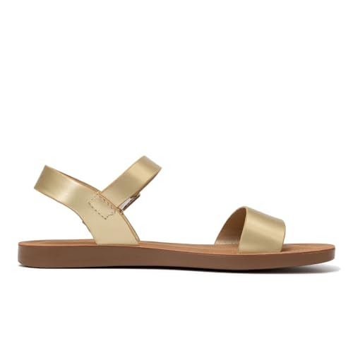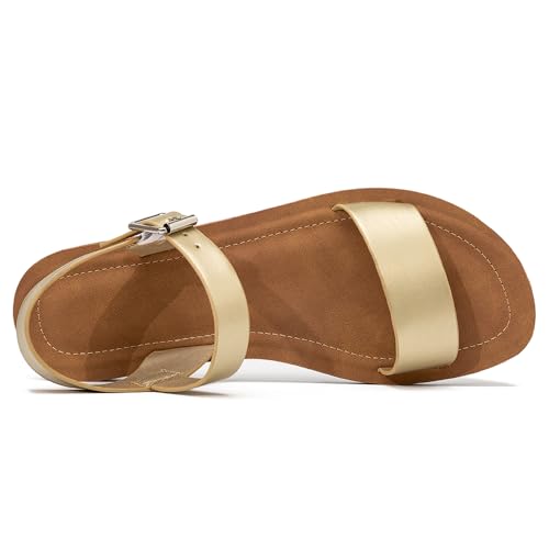 I ordered size 8 in the color Tan.I usually take a 7.5-8. These fit me well. So, Runs true to size. BUT!! If you have wide feet they will NOT work for you! They are narrow.These sandals are uber light with a well padded foot bed. The straps are not leather, unless you are close up you can’t really tell. There is a piece of elastic connected to the buckle for a little give.I like the sandals. When it is really hot and you need to wear shoes but don’t want to, these are a “go-to”. They look great with jeans or a skirt.I have worn them for a couple hours to go to the grocery store. They were comfortable. I don’t know how they would do for all day.