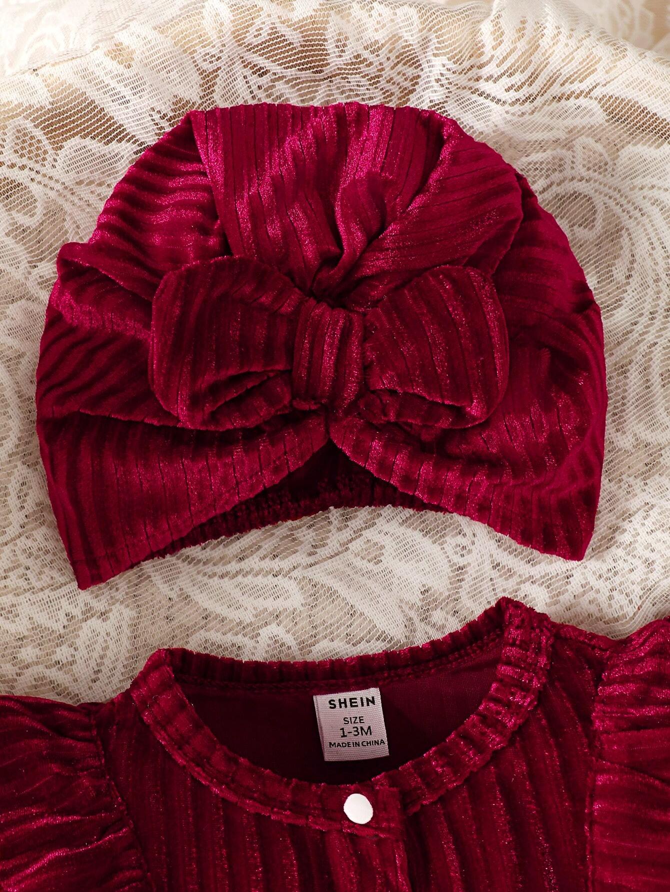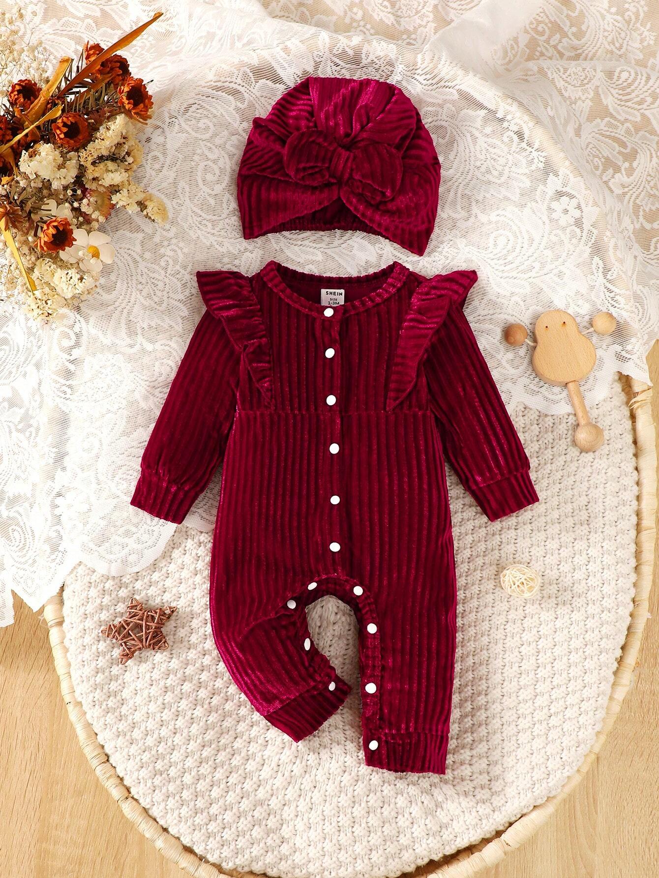 Baby Girls’ Knit Ribbed Plush Comfortable Warm Crawling Suit With Stylish Turban Cap, Autumn & Winter