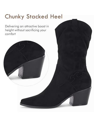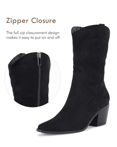 I was looking for some suede mid-calf boots in black and found these Coutgo Women’s Western boots on Amazon.There are a good number of features on these boots that give it the appearance of a cowboy boot but they are anything but. Starting at the top of the boot, they have a nice wide flared opening which allow them to fit against your leg without being too tight. The material is a faux suede with some embroidery on the sides. The heel is tall and chunky giving you the perfect amount of support and a bit extra in height. Unlike cowboy boots, these boots are held in place by a metal zipper that goes from the bottom of the boot all the way up.They arrived early this morning so I put them on to see how they felt. I ended up wearing them for the rest of the day and I have to say that they are extraordinarily comfortable. I wasn’t expecting that but it was a nice surprise. I normally wear a size 8 1/2 but sized up to a 9 to be safe and they fit perfectly (sizing up wasn’t necessary).It is of my opinion that these boots are well made, very attractive, stylish and very comfortable to wear.