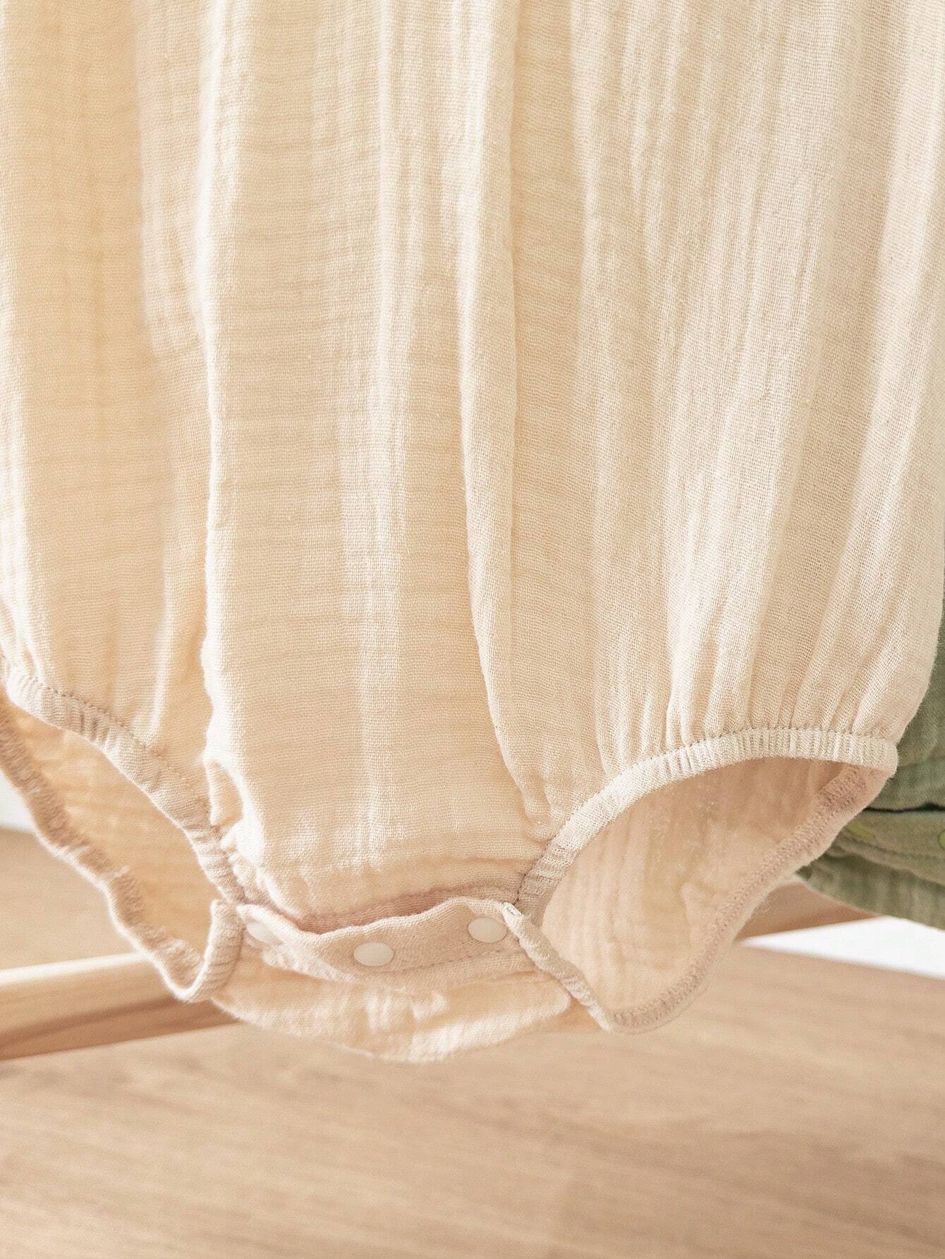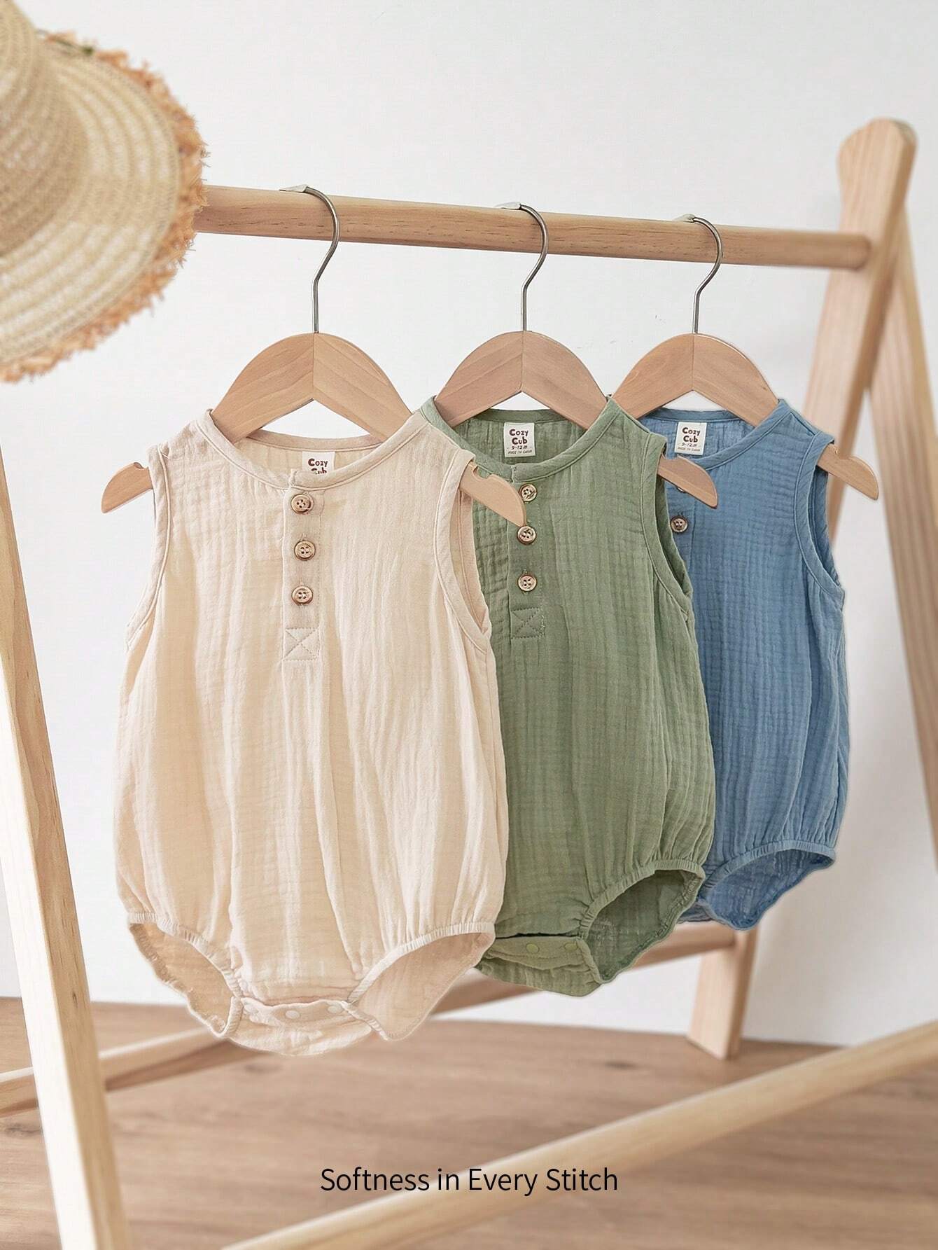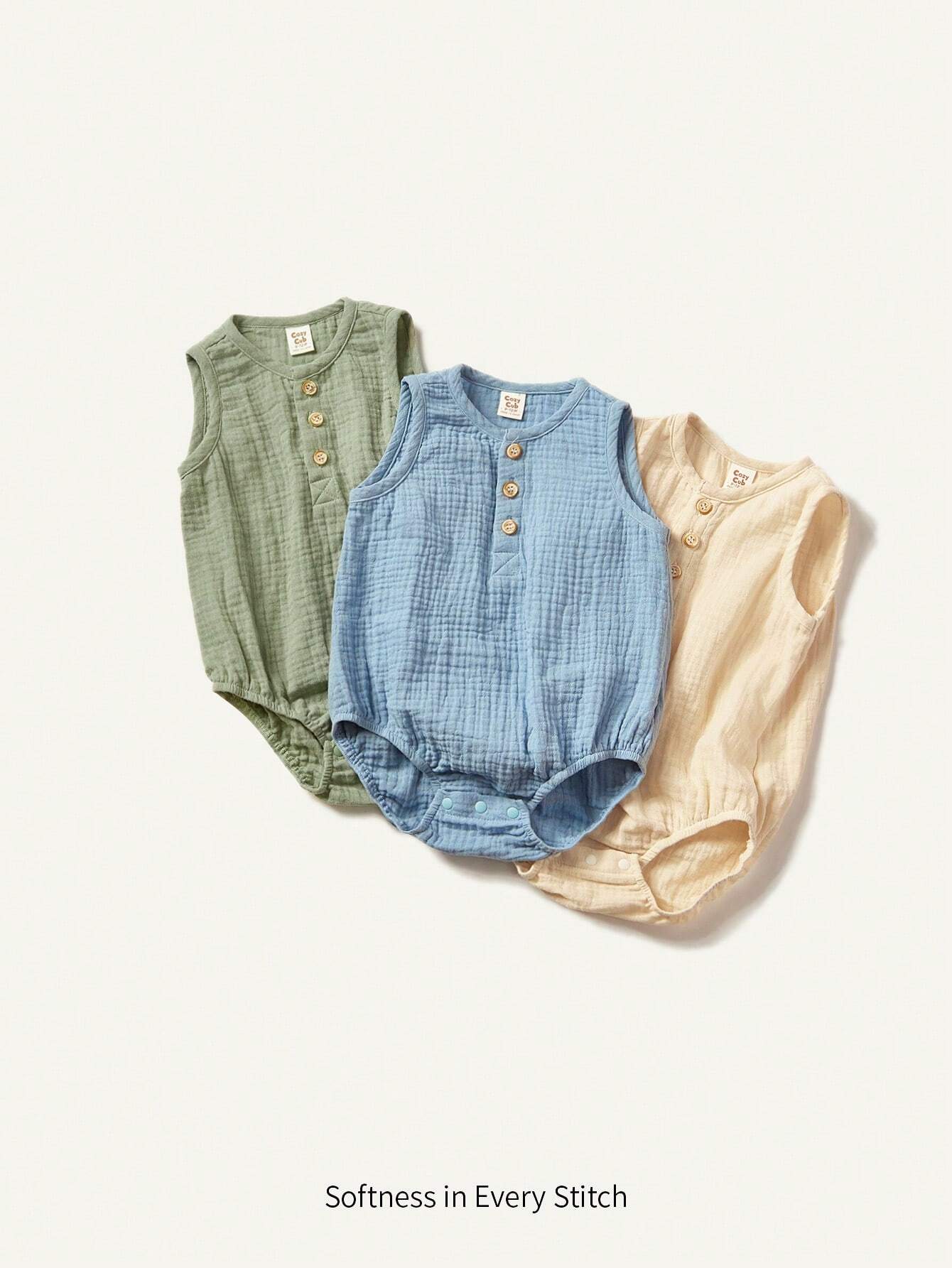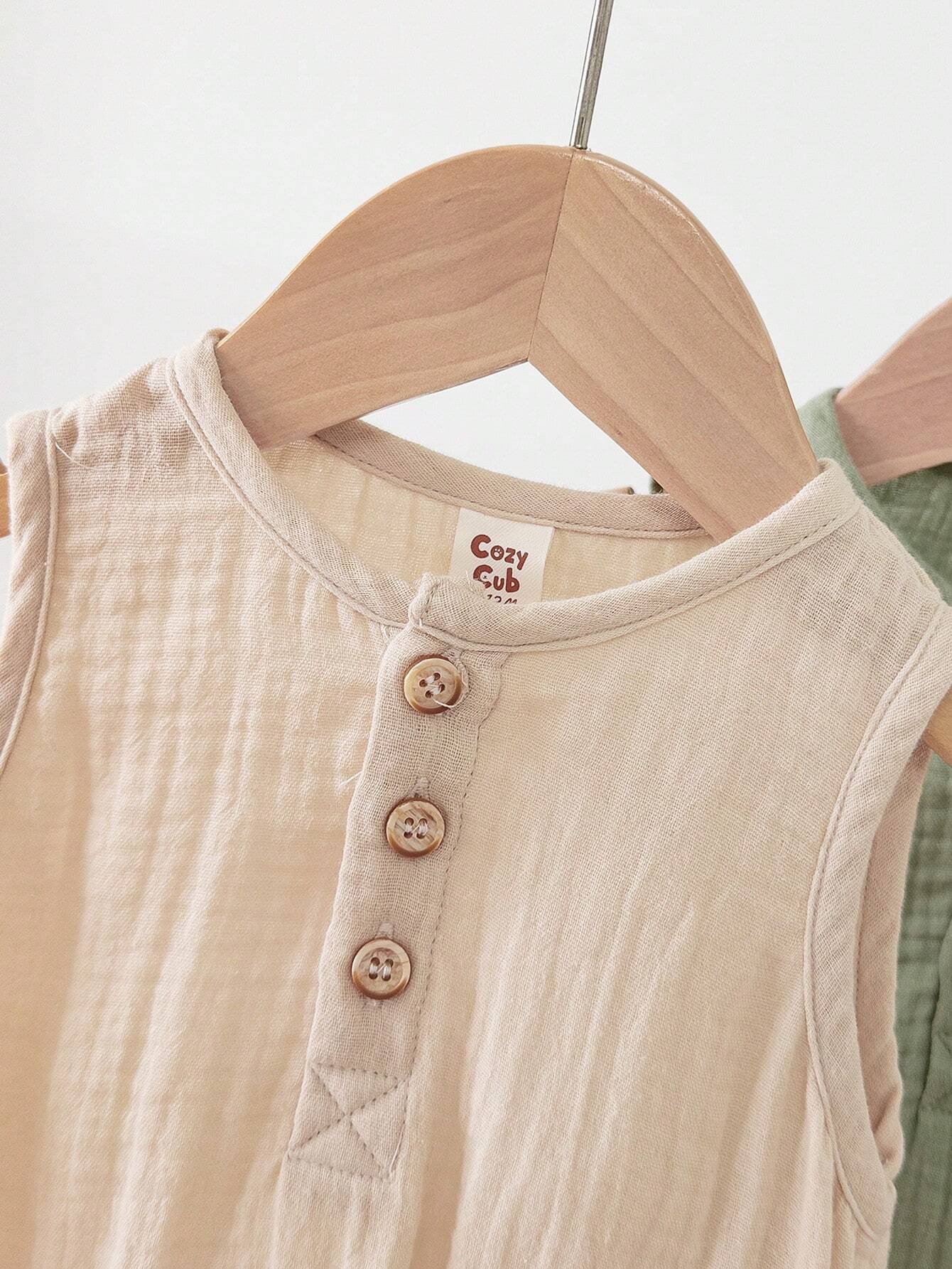 Cozy Pixies Baby Boy Sleeveless Romper Set With Half Placket Front And Button Closure Round Neckline