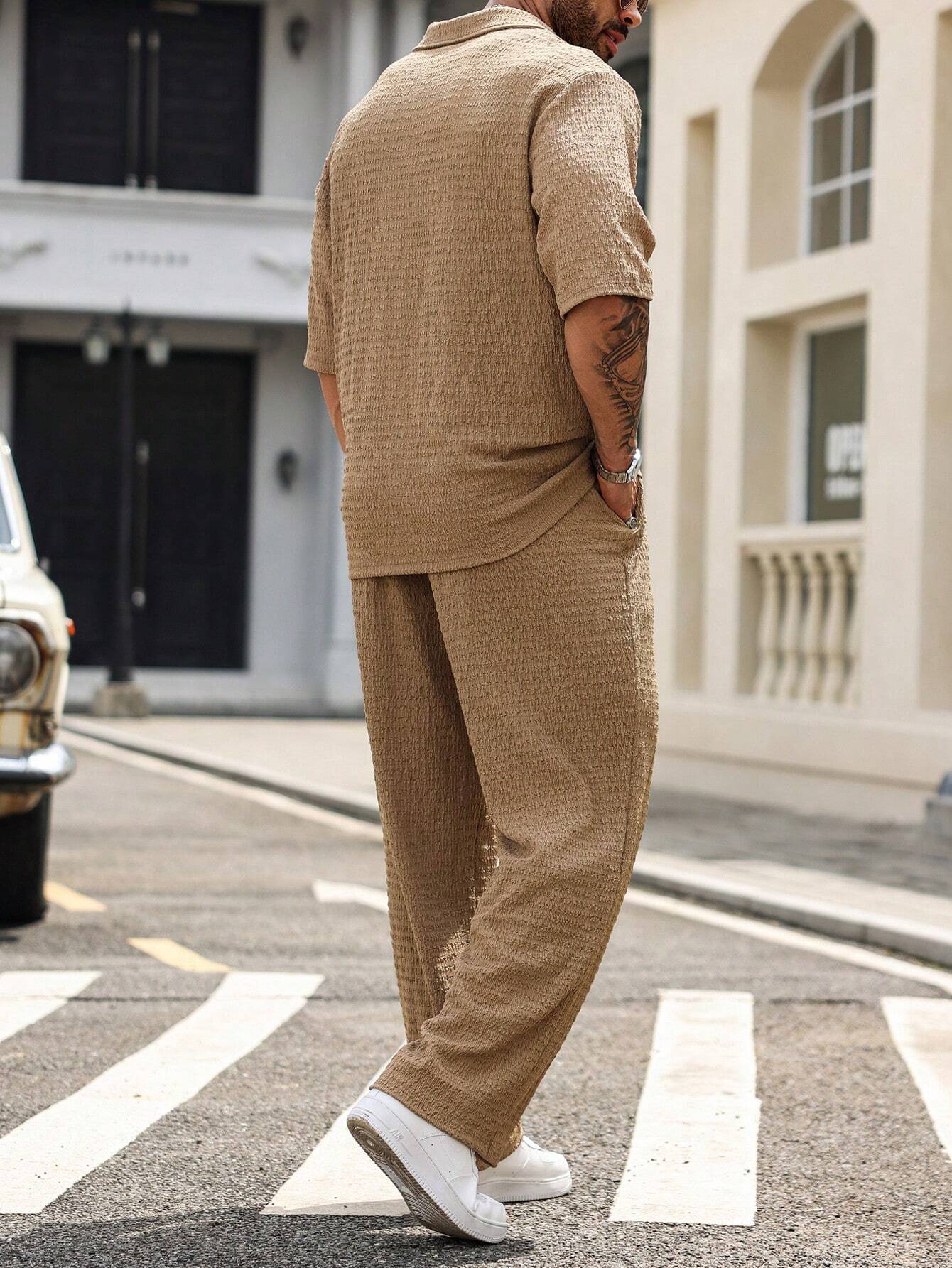 Manfinity Homme Plus Size Men’s Solid Color Simple Daily Short Sleeve Shirt And Long Pants Set