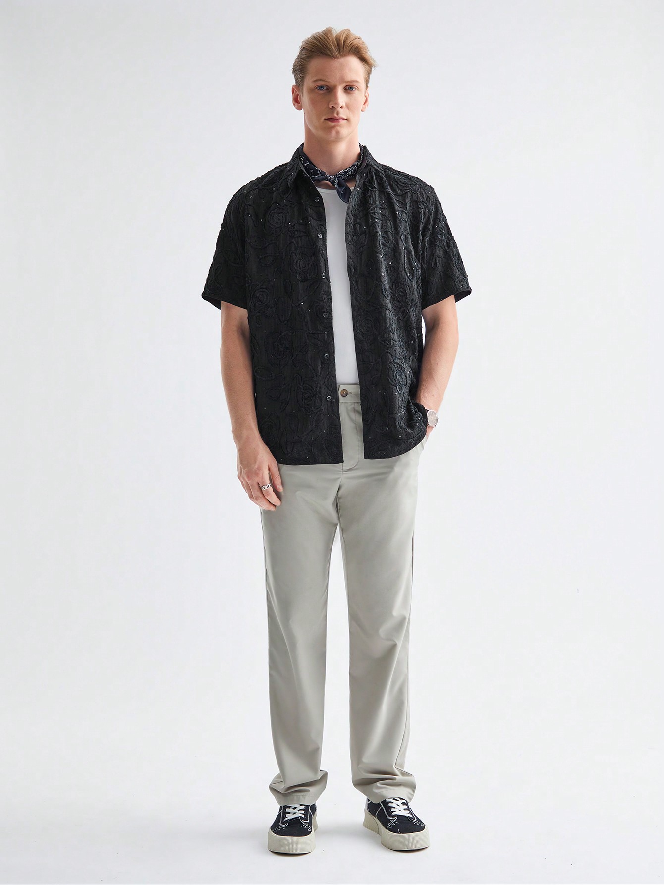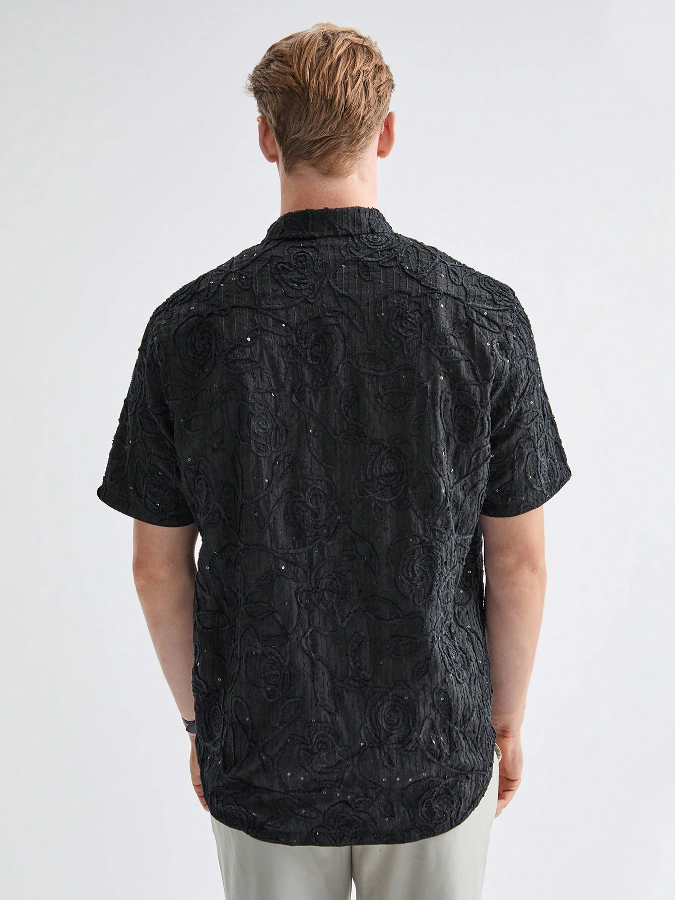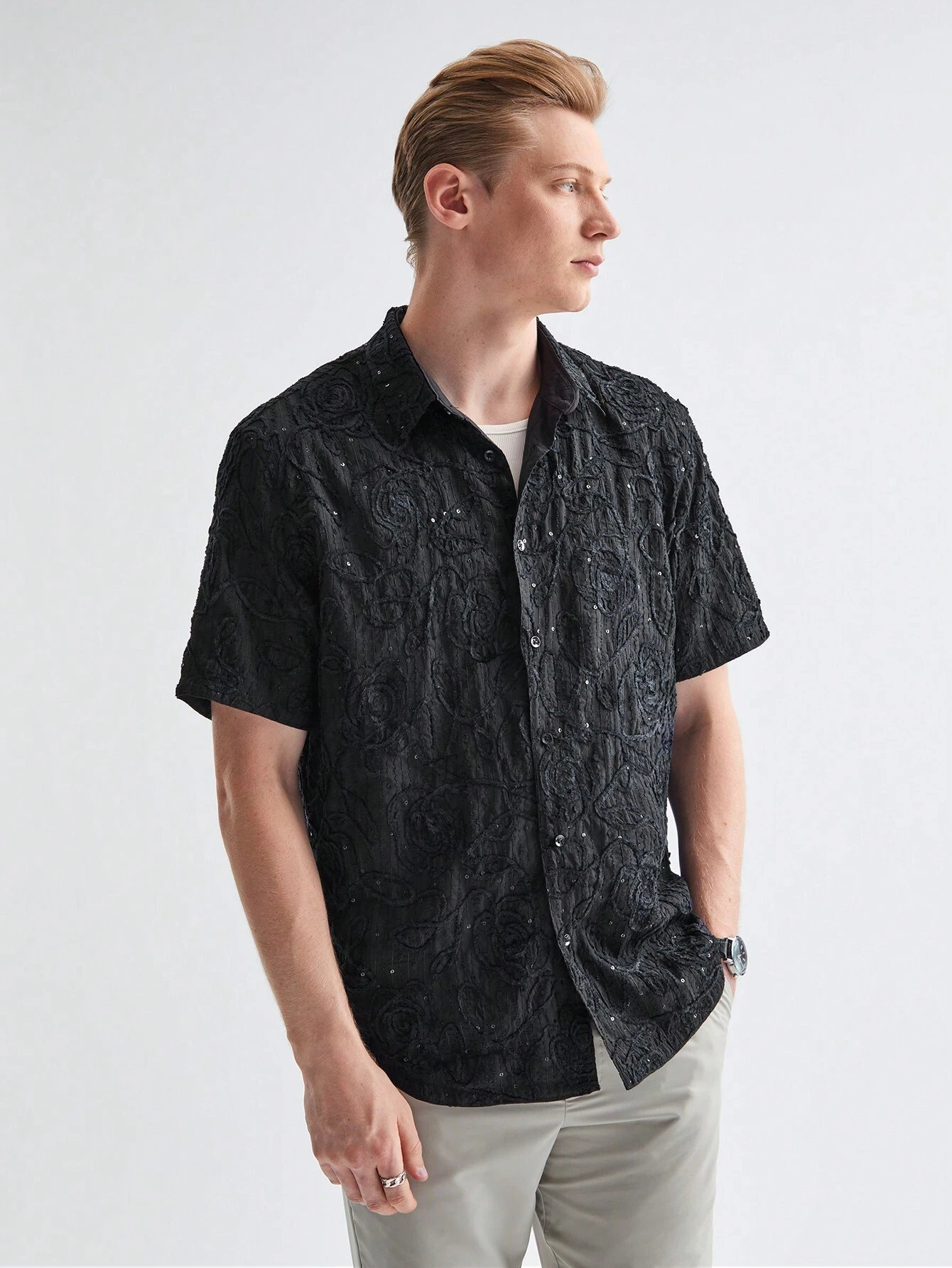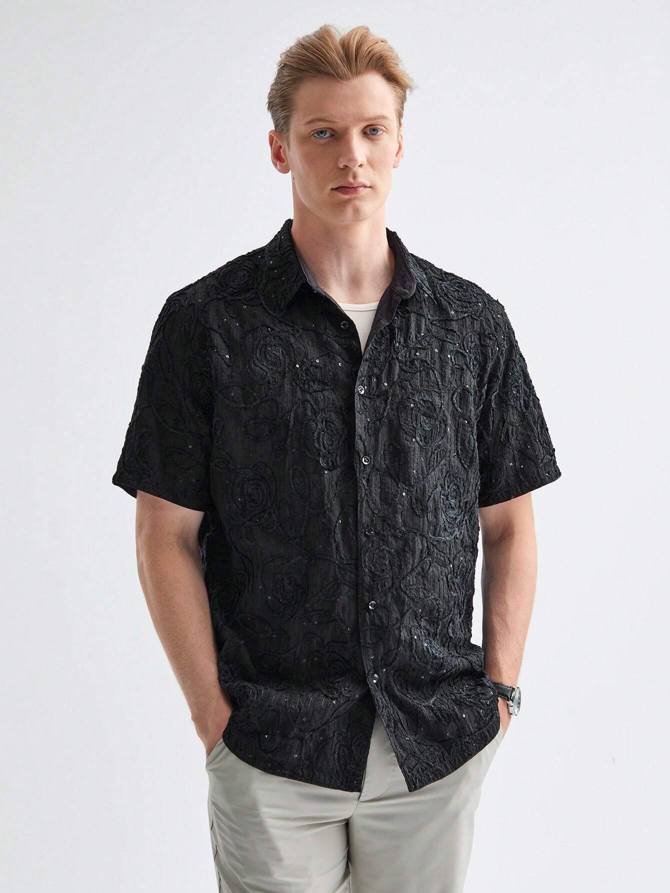 Manfinity ModaGents Men’s Woven Plain Velvet Thread Beaded Embroidery Short Sleeve Regular Fit Casual Shirt, Suitable For Daily Wear In Spring And Summer