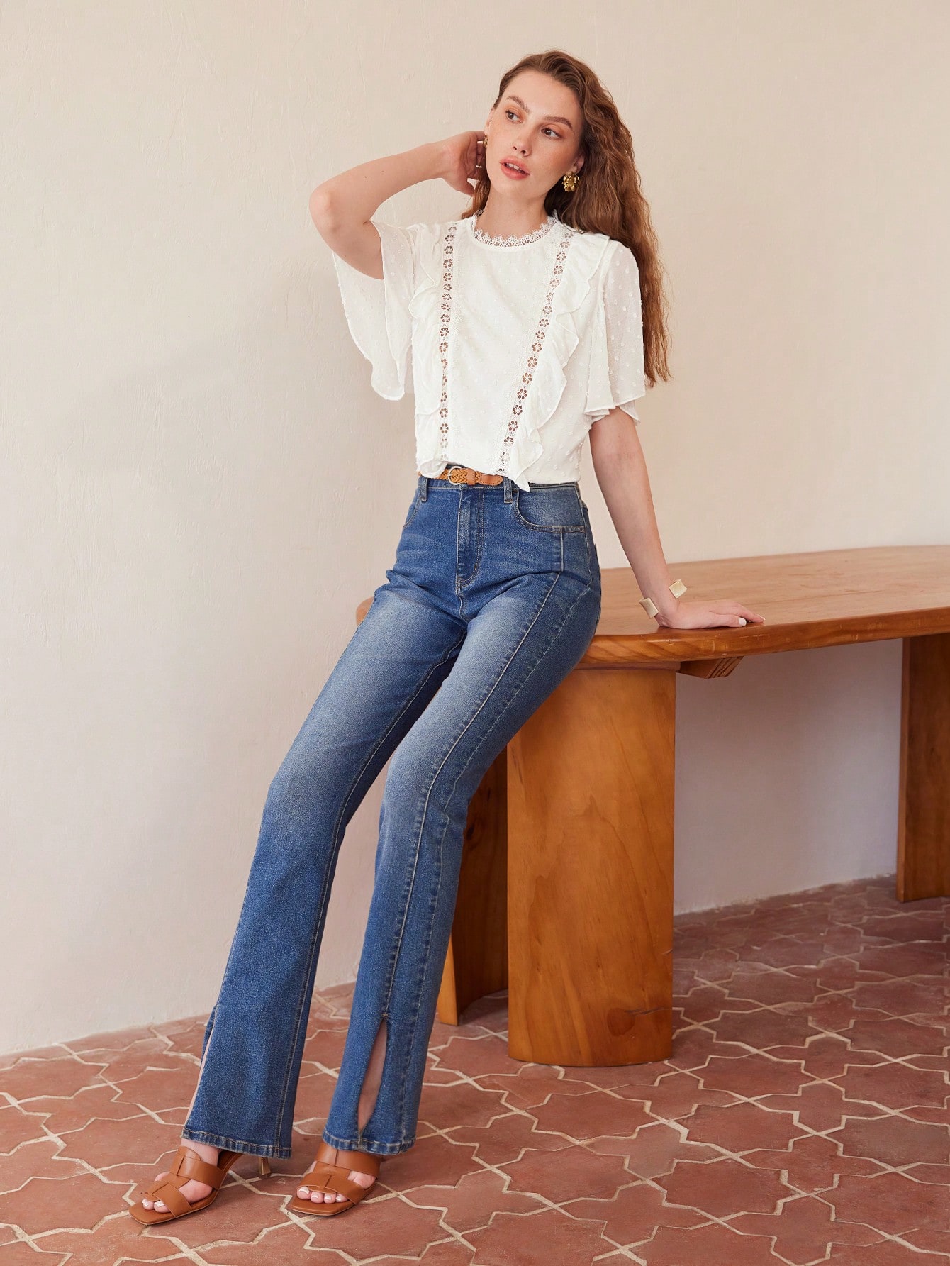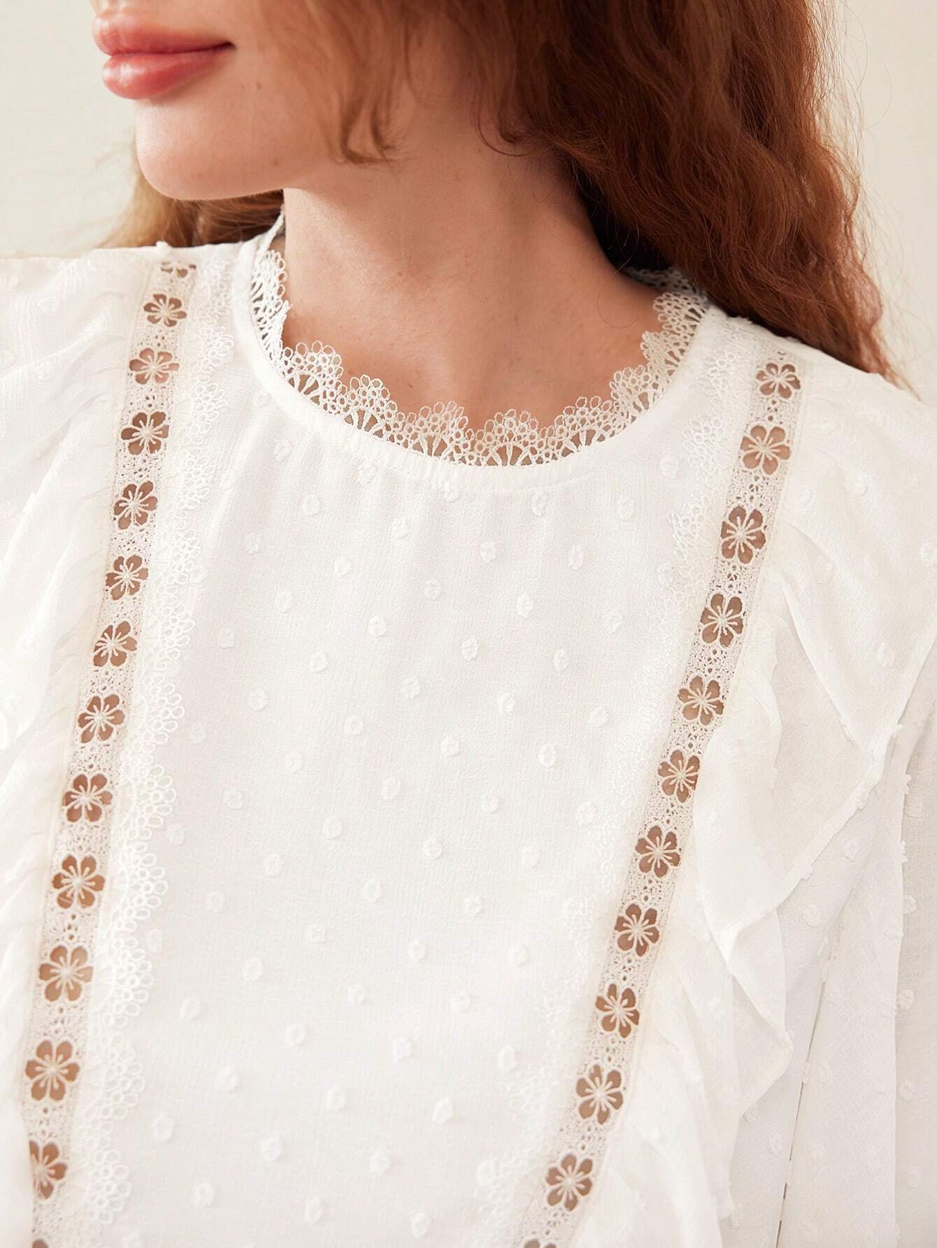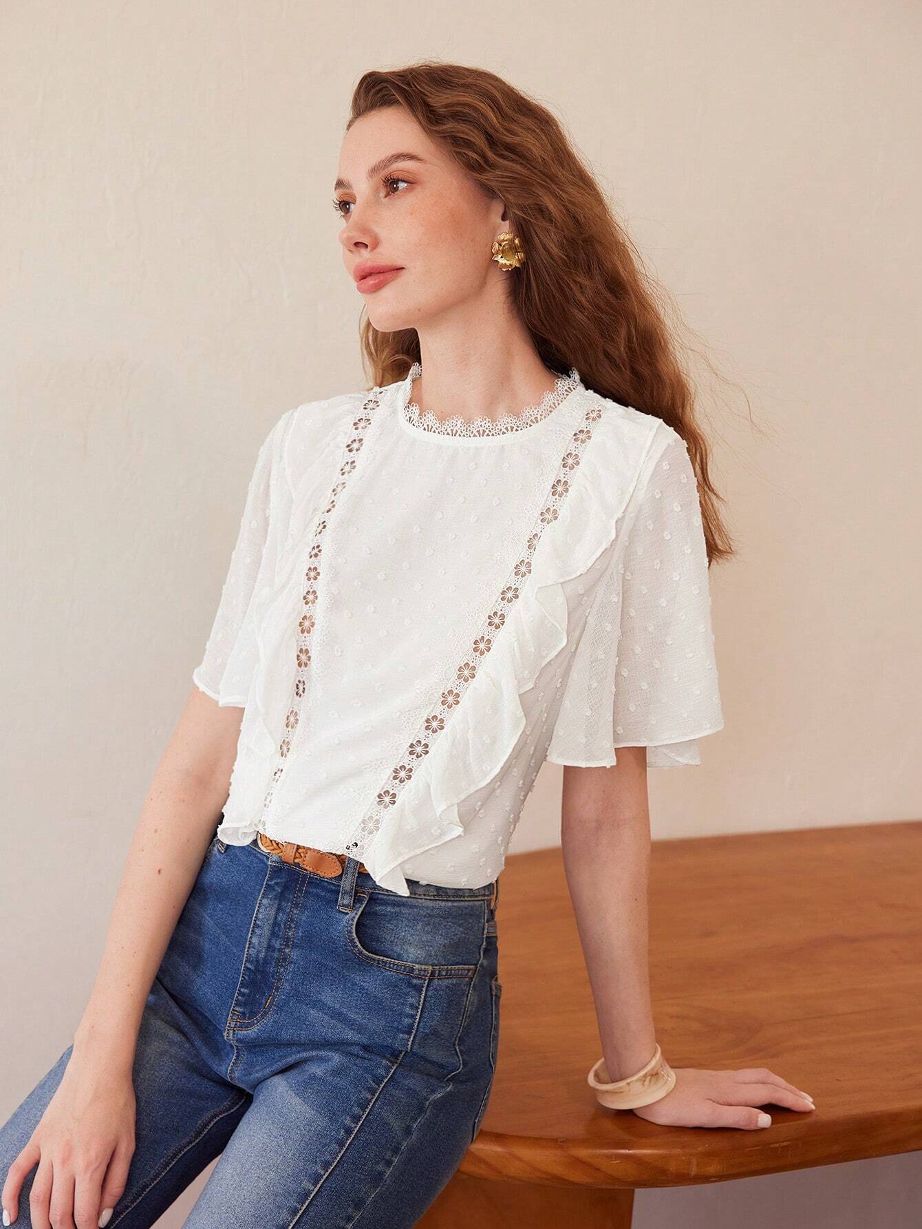 MOTF PREMIUM CHIFFON FLUTTER SLEEVE LACE INSERT RUFFLE TRIM BLOUSE