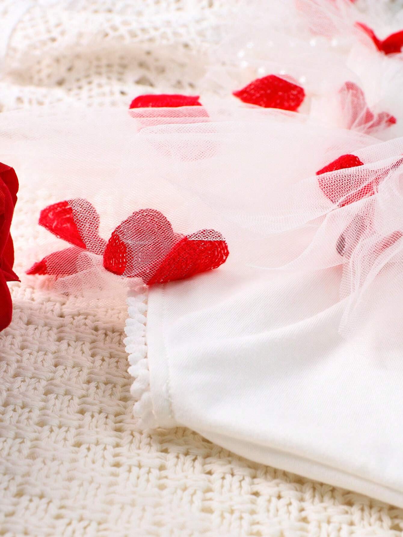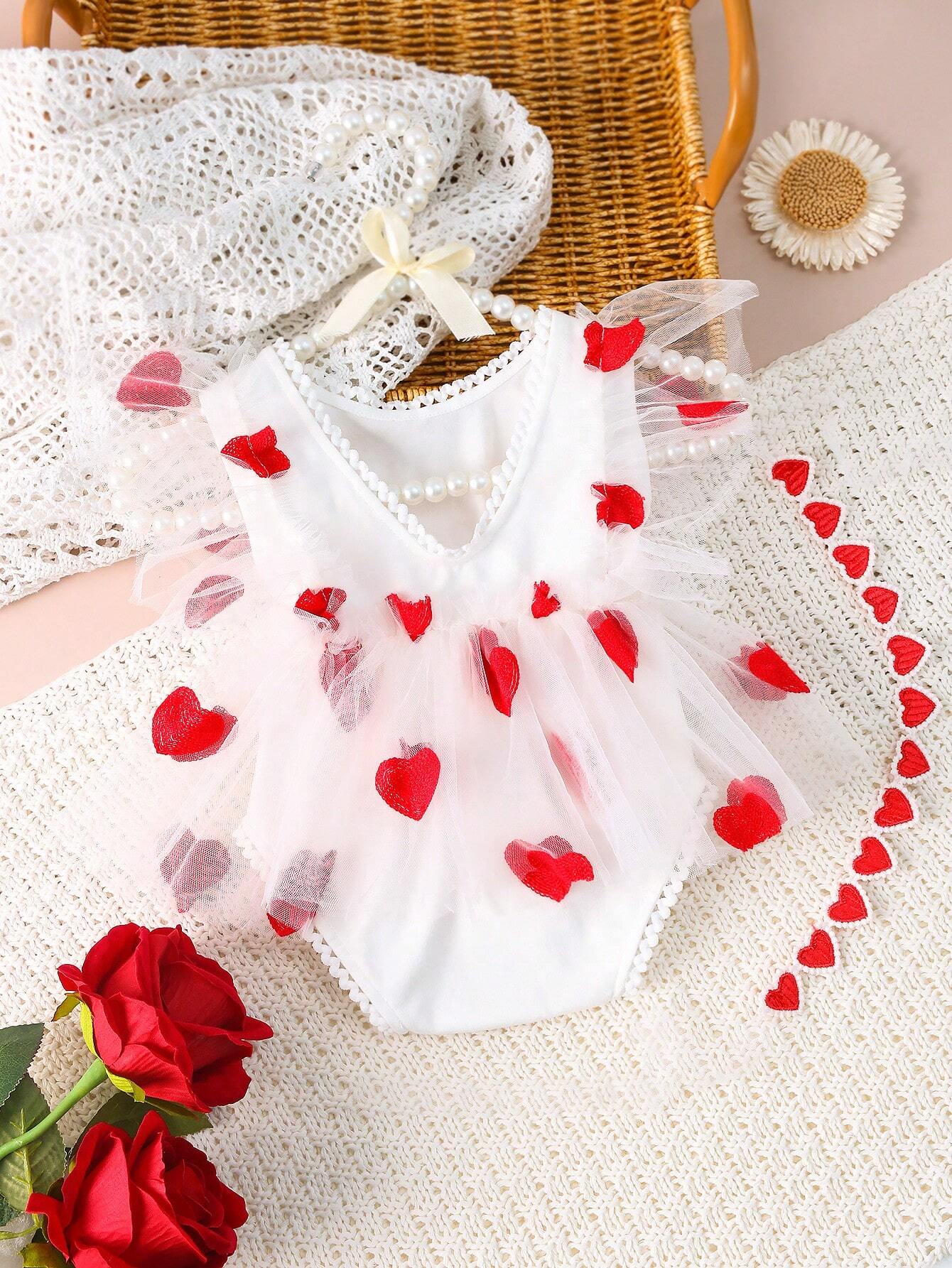 Newborn Baby Girls’ Red Heart Embroidered Mesh Romper With Headband Photography Set