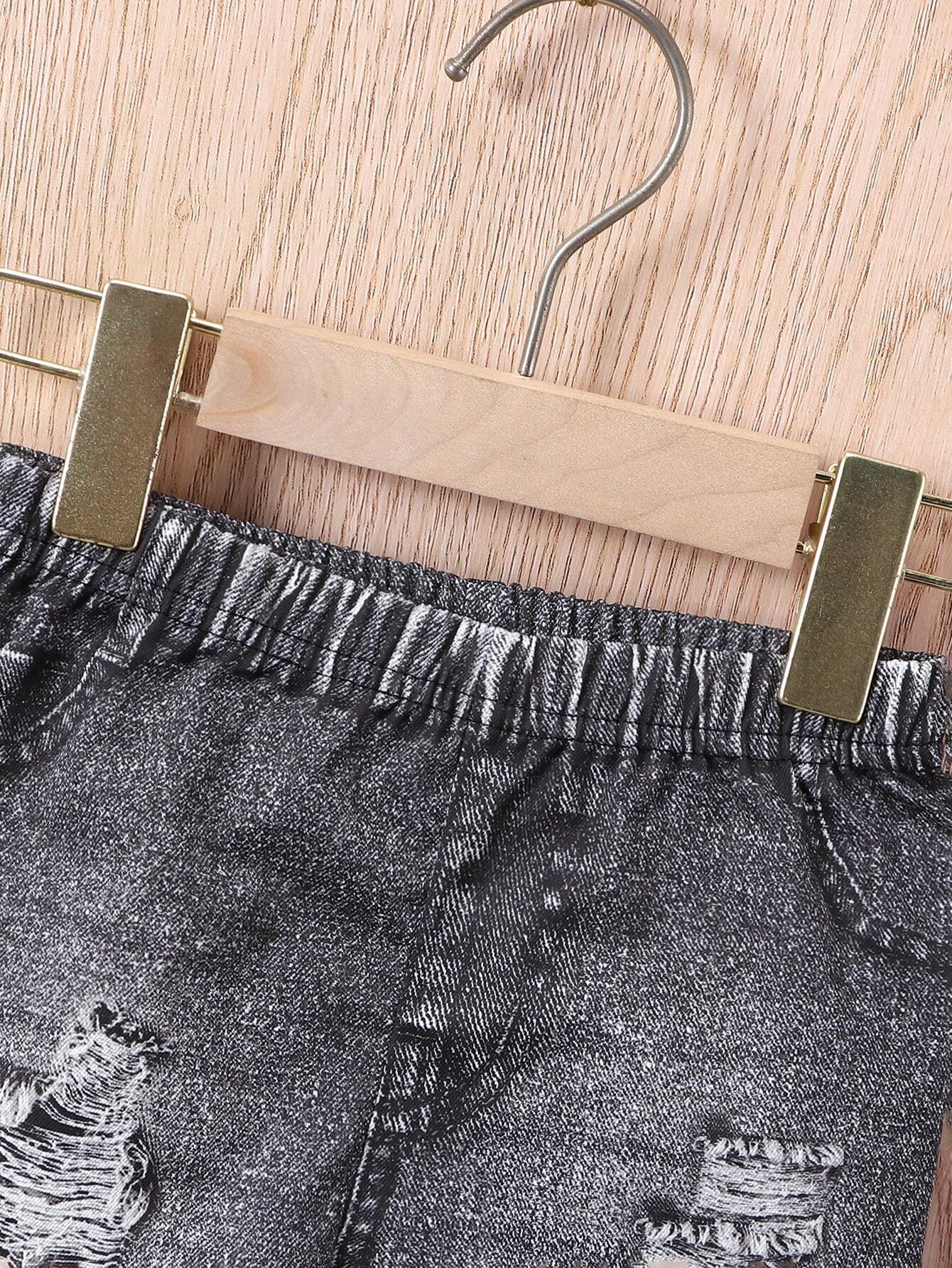 Ribbed Texture T-Shirt And Denim Print Shorts Set With Bucket Hat, Street-Style Fashionable Casual Outfit For Baby Boys