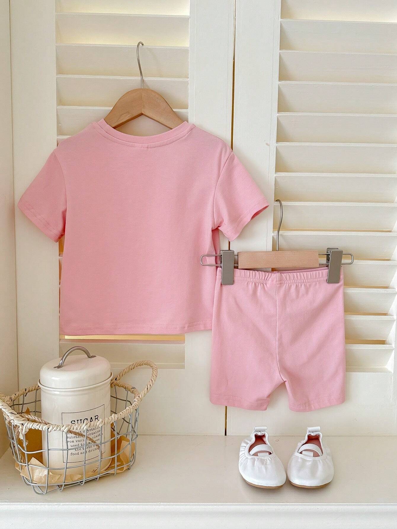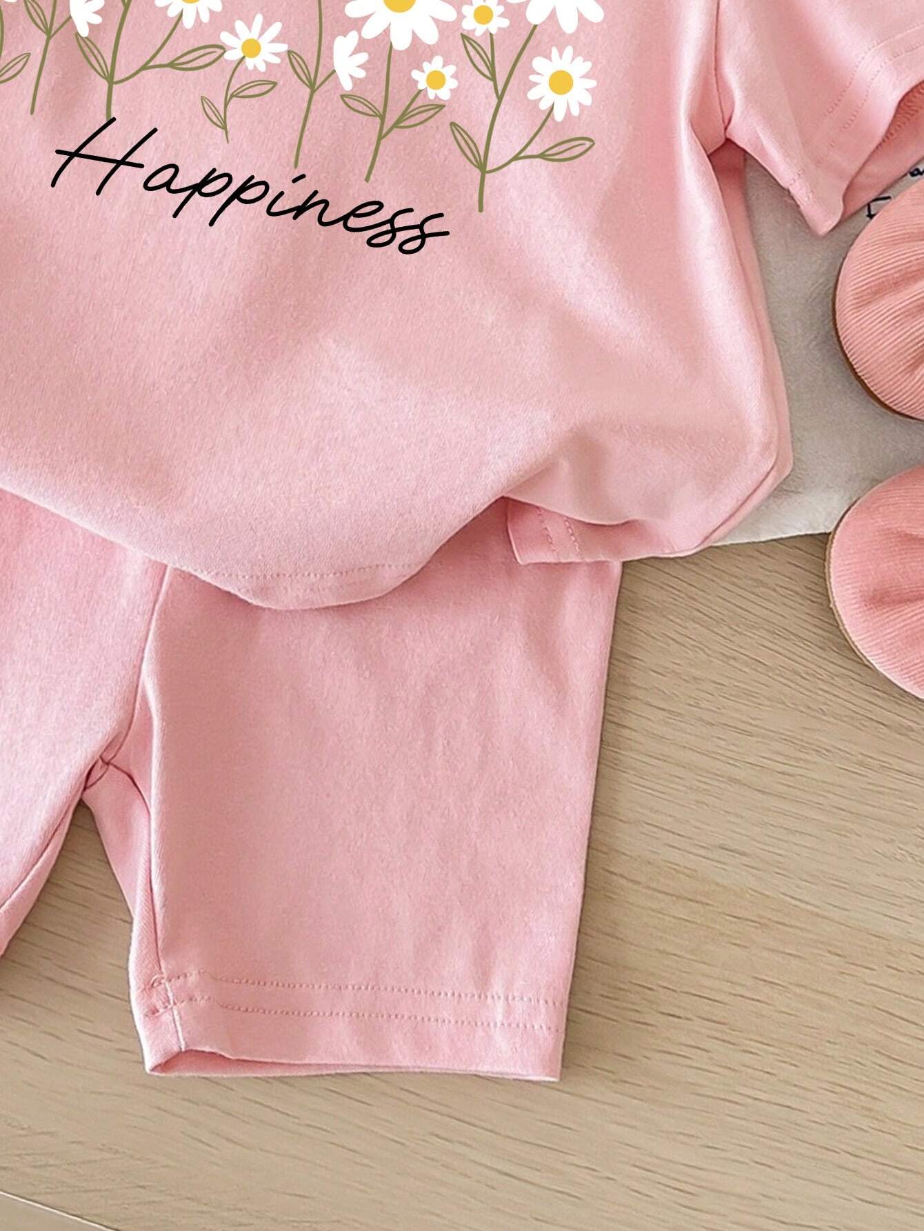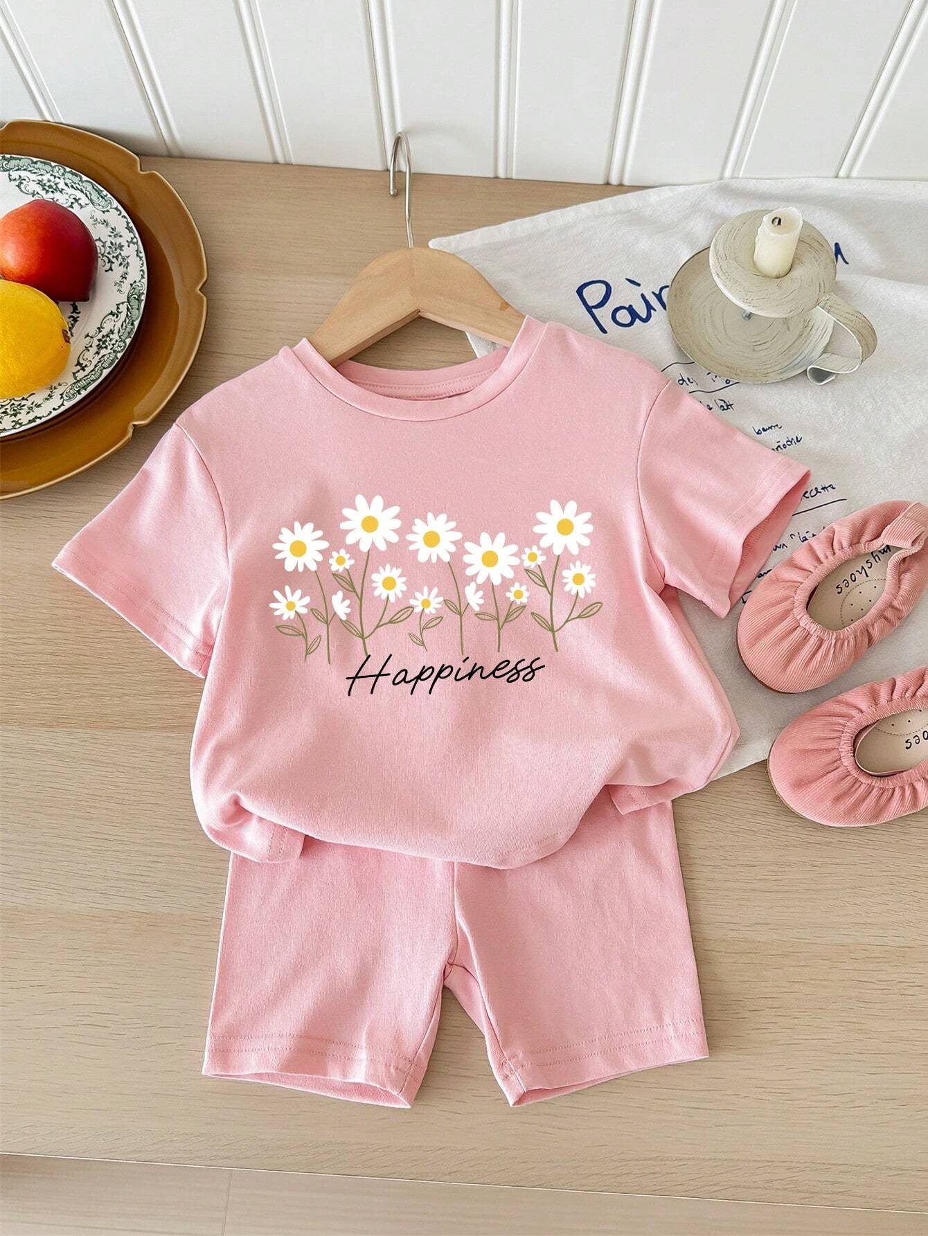 SHEIN 2pcs Floral Baby Girl Casual Minimalist Flower Pattern Crew Neck Short Sleeve Shorts Set, Summer