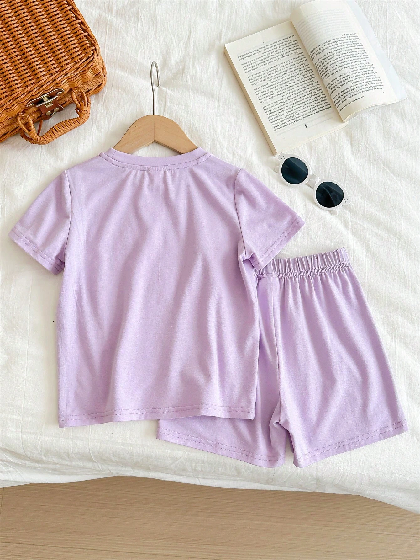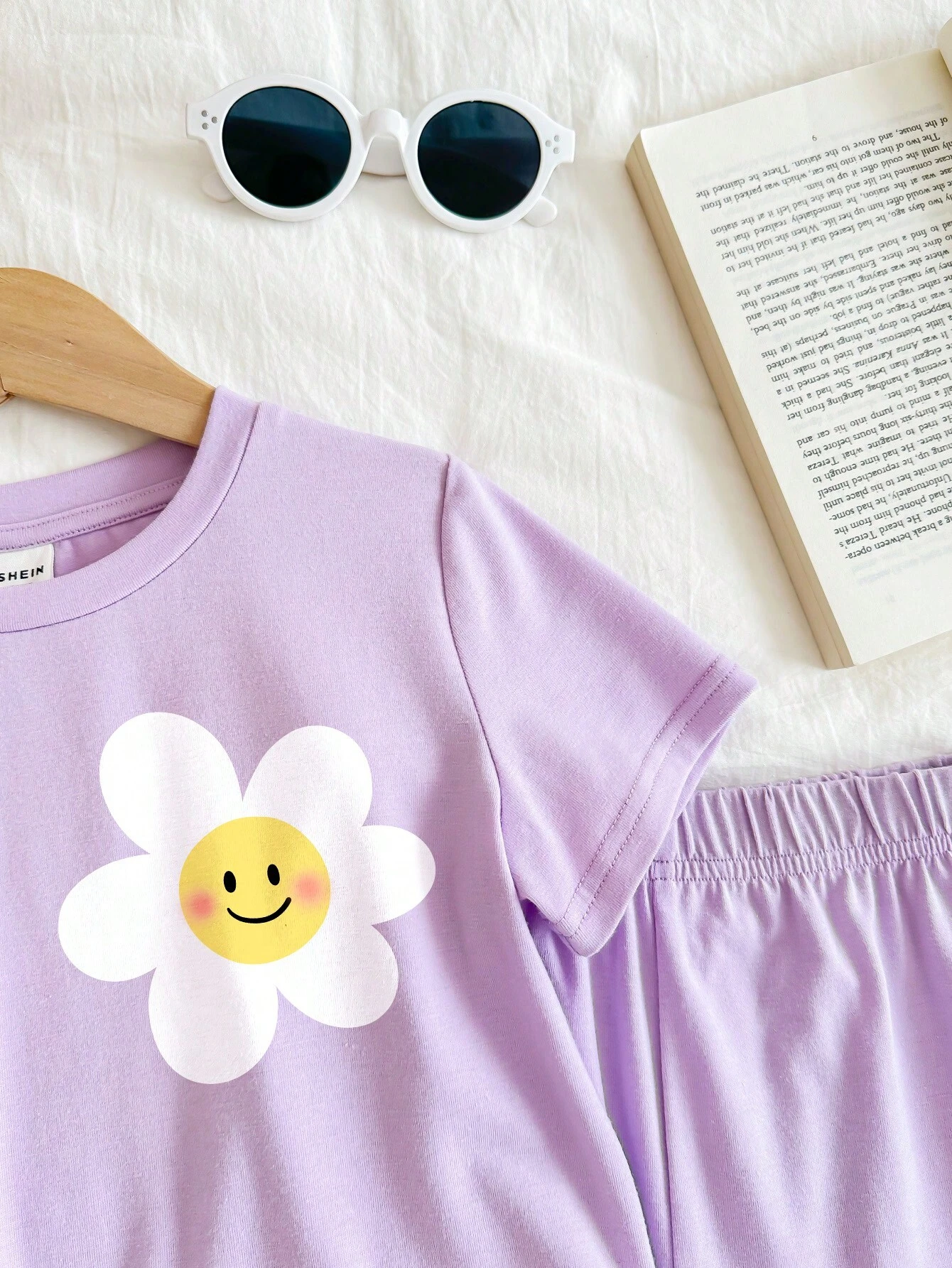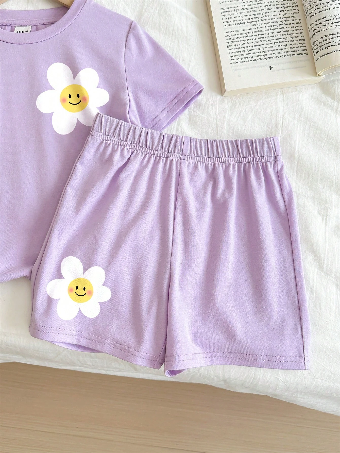 SHEIN 2pcs/Set Summer Purple Flower Print Smile Face Pattern T-Shirt And Shorts Outfit, For Young Girls