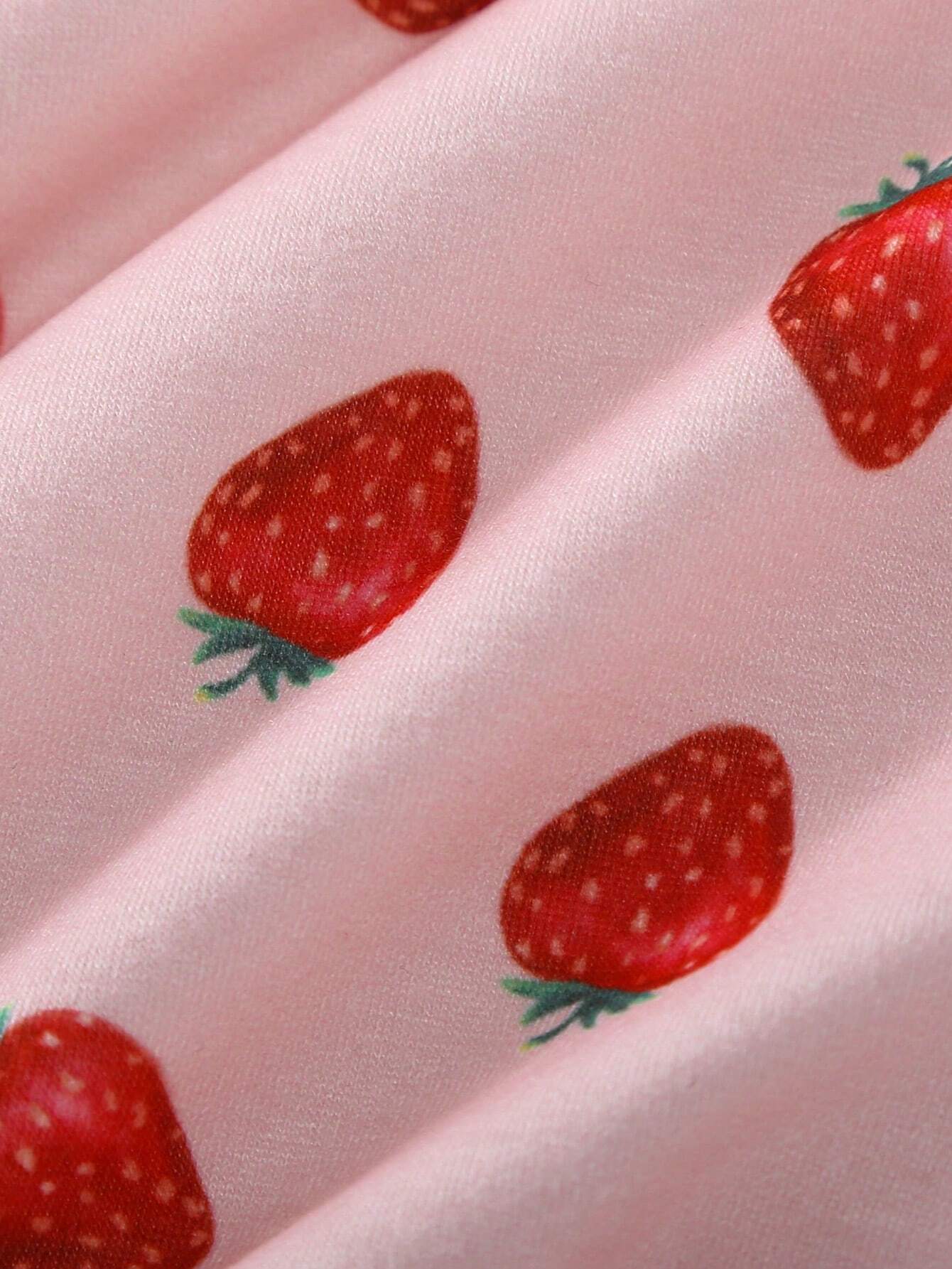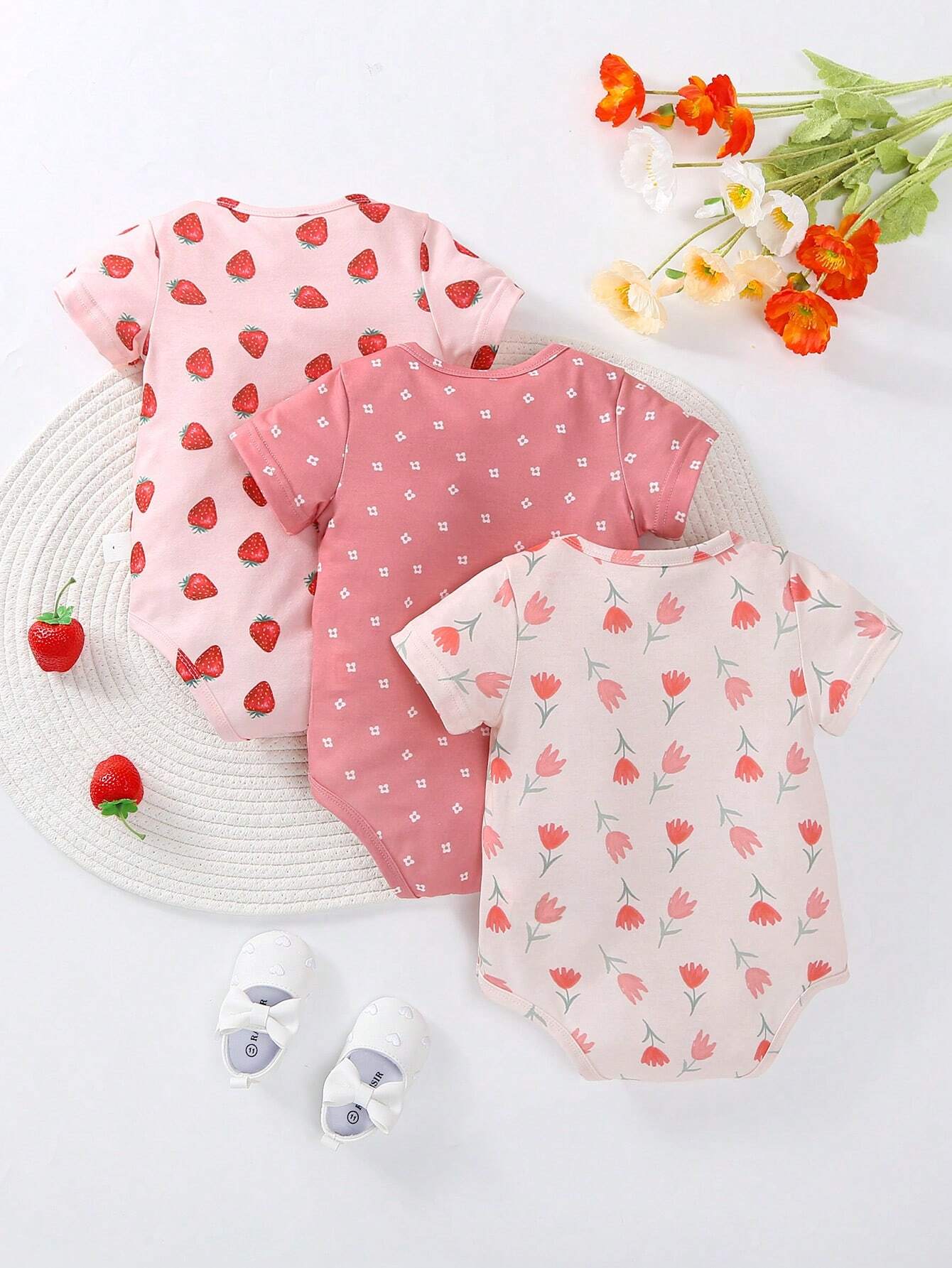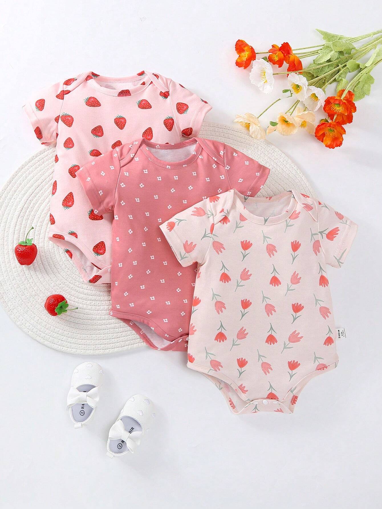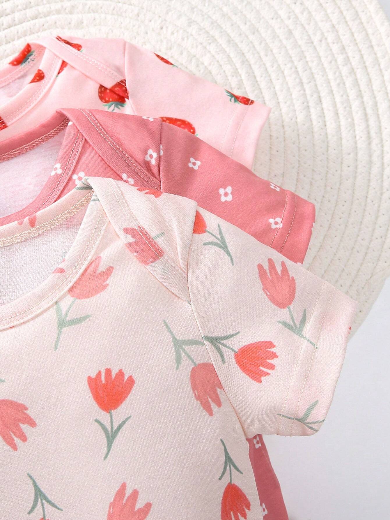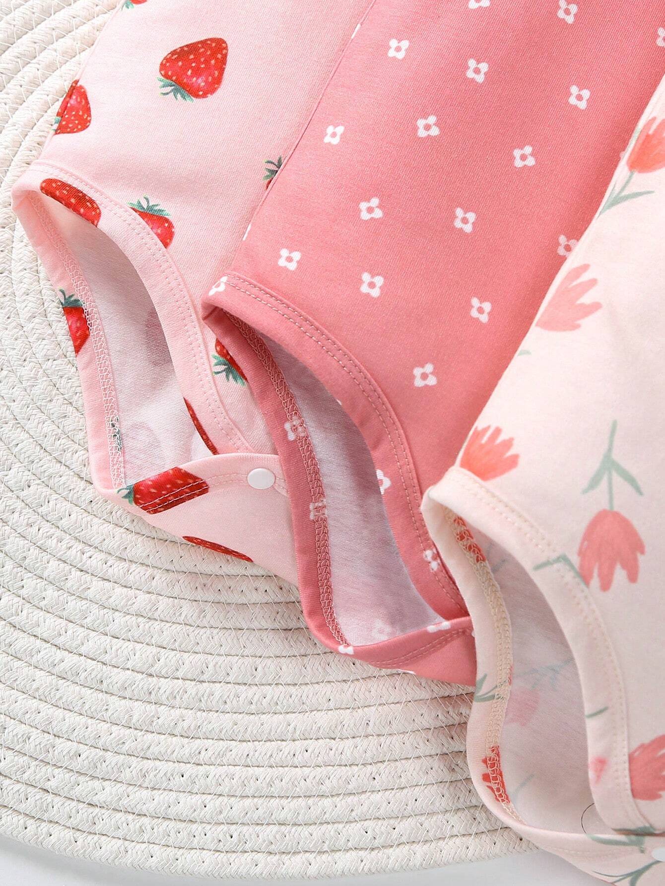 SHEIN Baby Girl 3pcs/Set Casual & Basics Strawberry & Flower Printed Bodysuit For Daily Wear And Home Wear, Spring & Summer