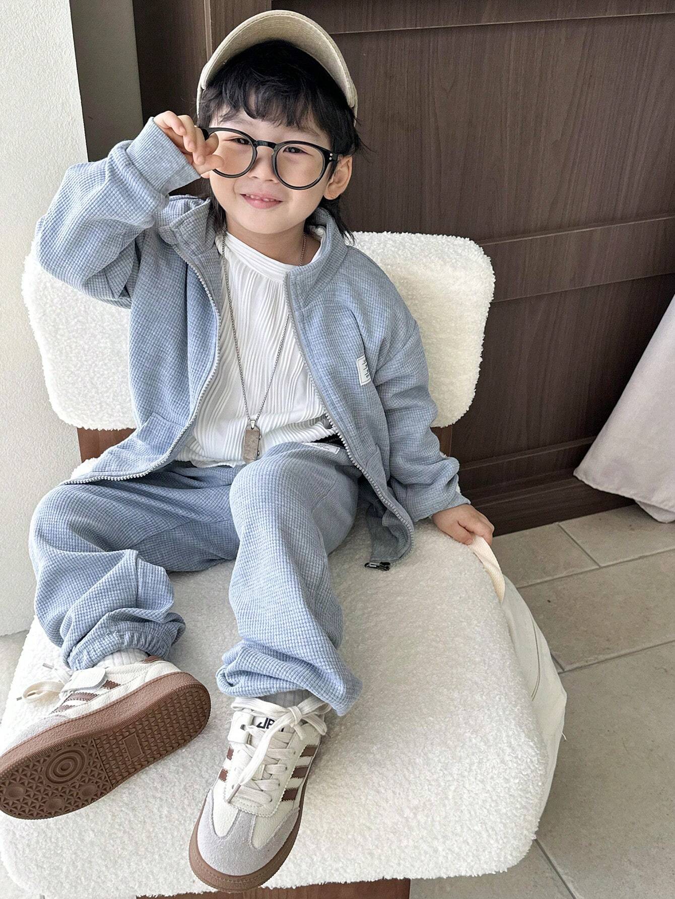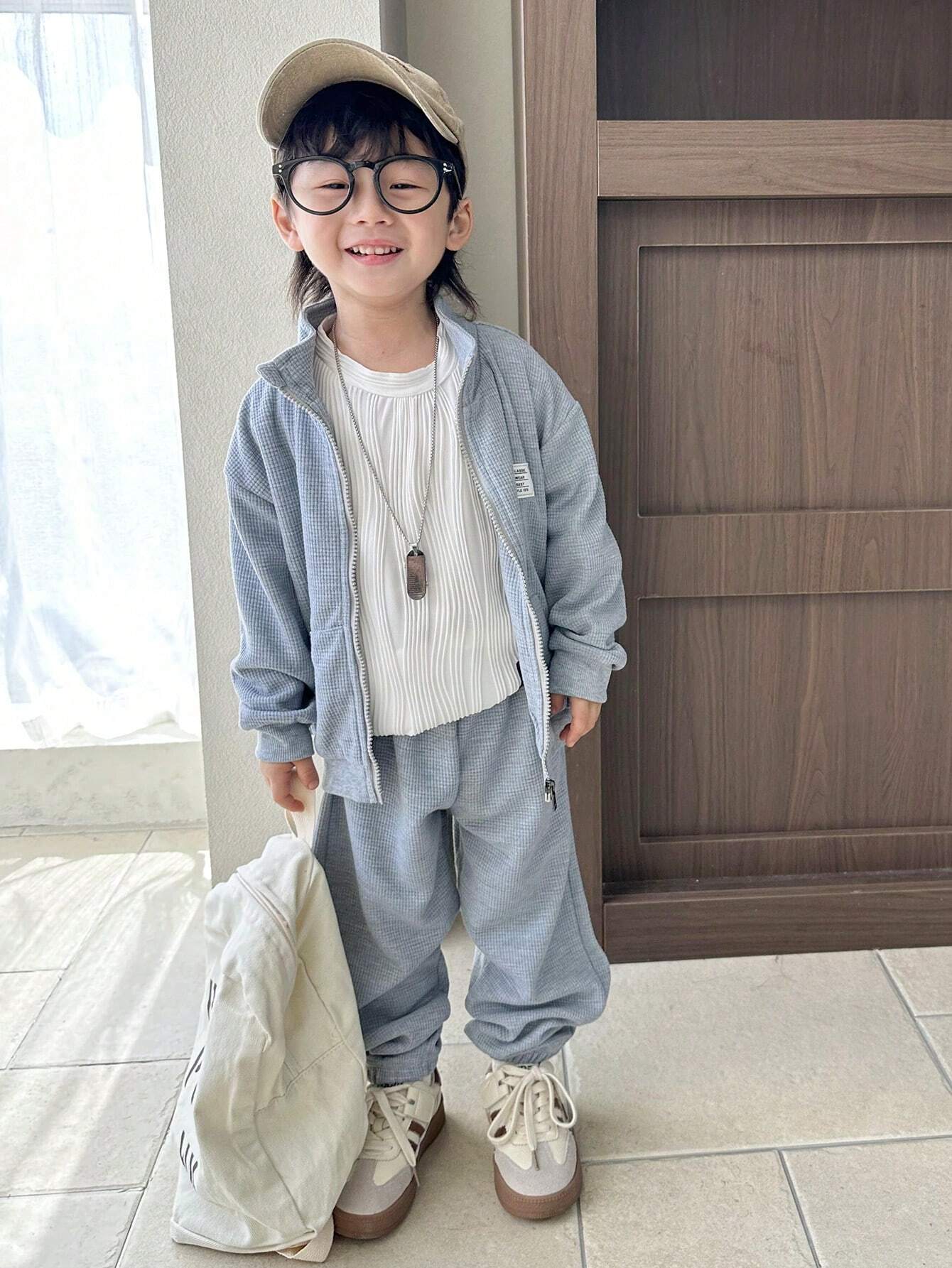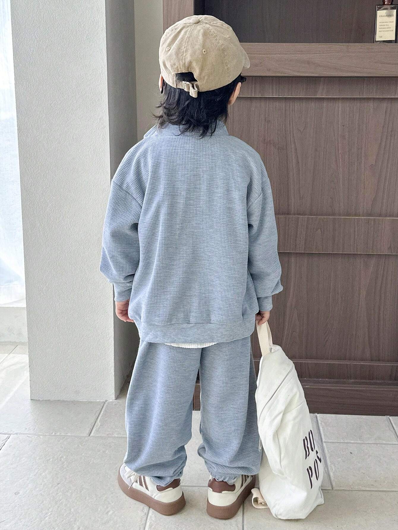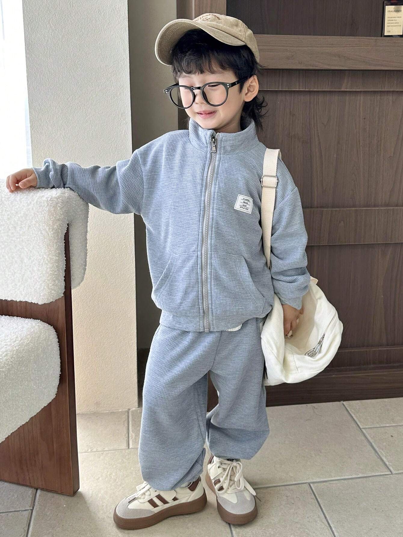 SHEIN Genkimix Kids 2pcs Young Boy Casual Waffle Pattern Zip-Up Hoodie And Pants Set, Suitable For Fall, Winter, School, Sports, Halloween, Christmas