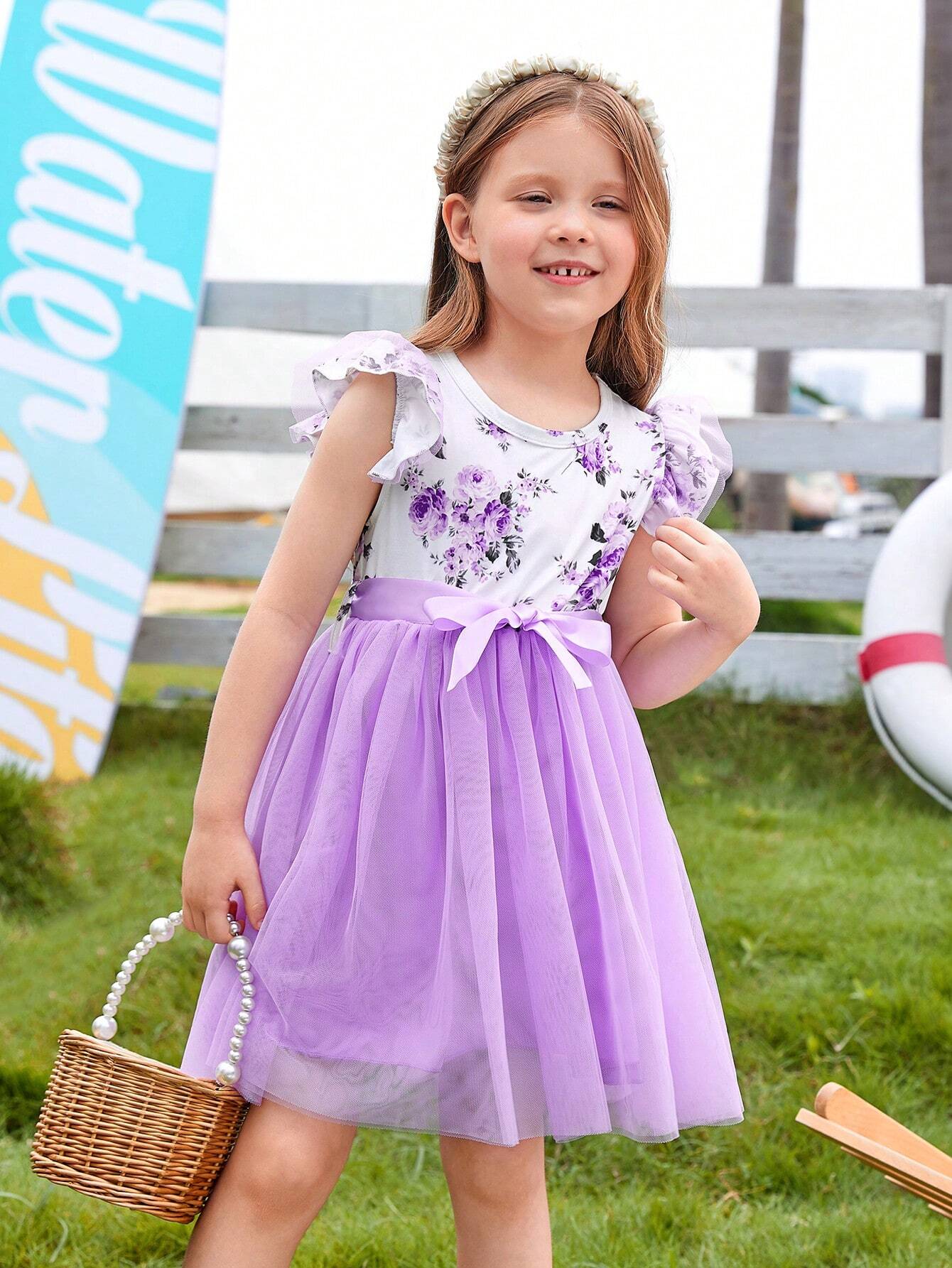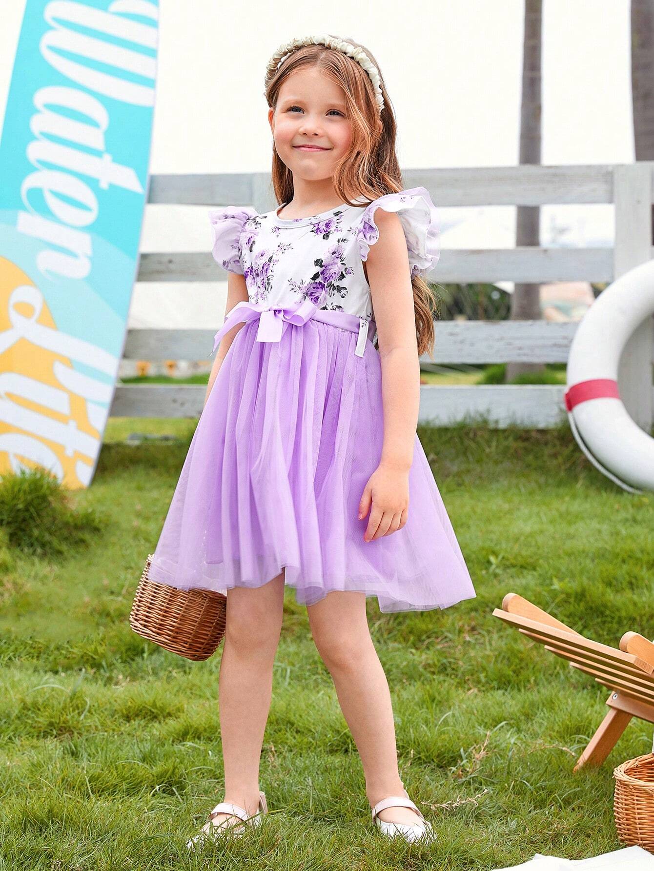SHEIN Glamorique Kids Young Girl Floral Printed Flutter Sleeve Mesh Patchwork Dress With Bowknot Belt, Summer