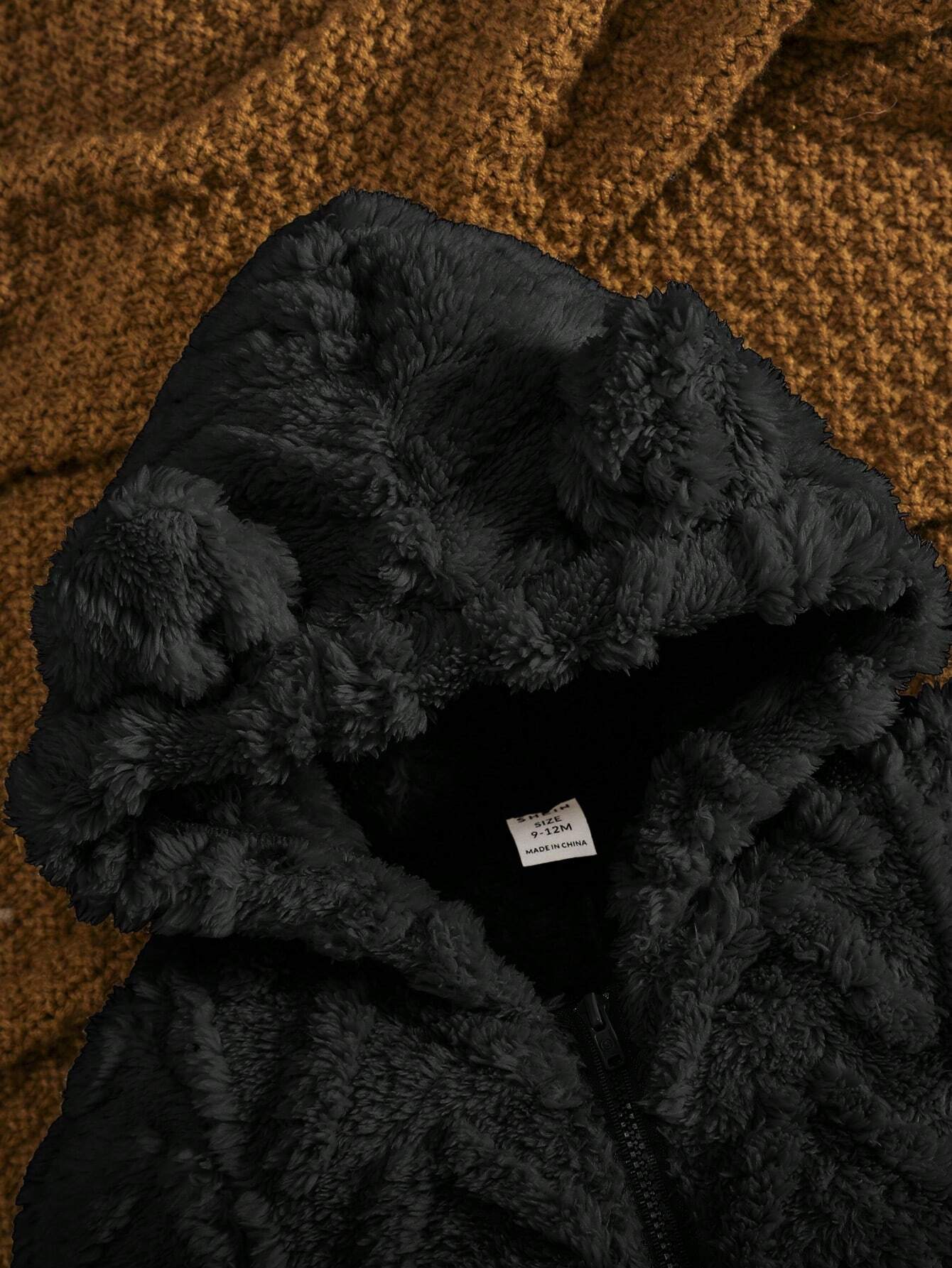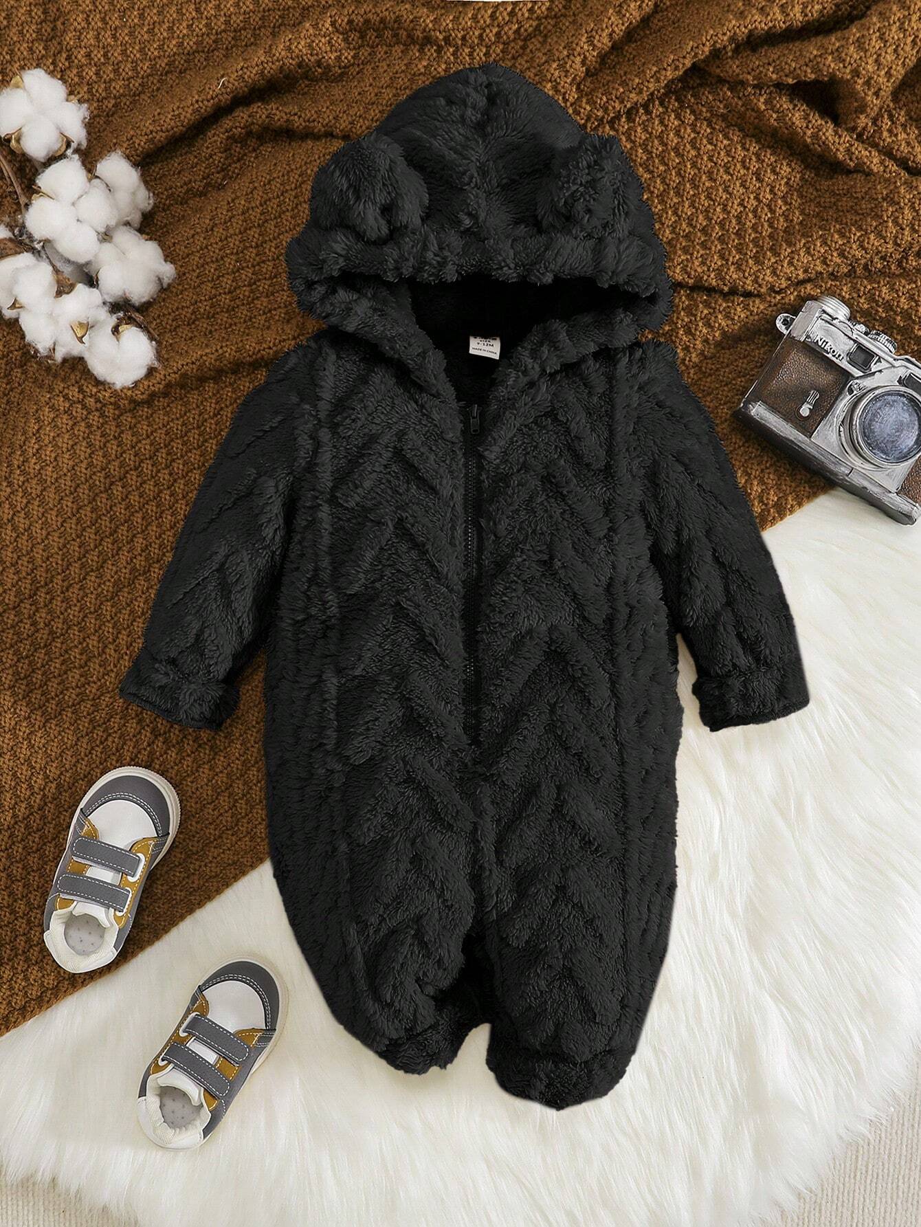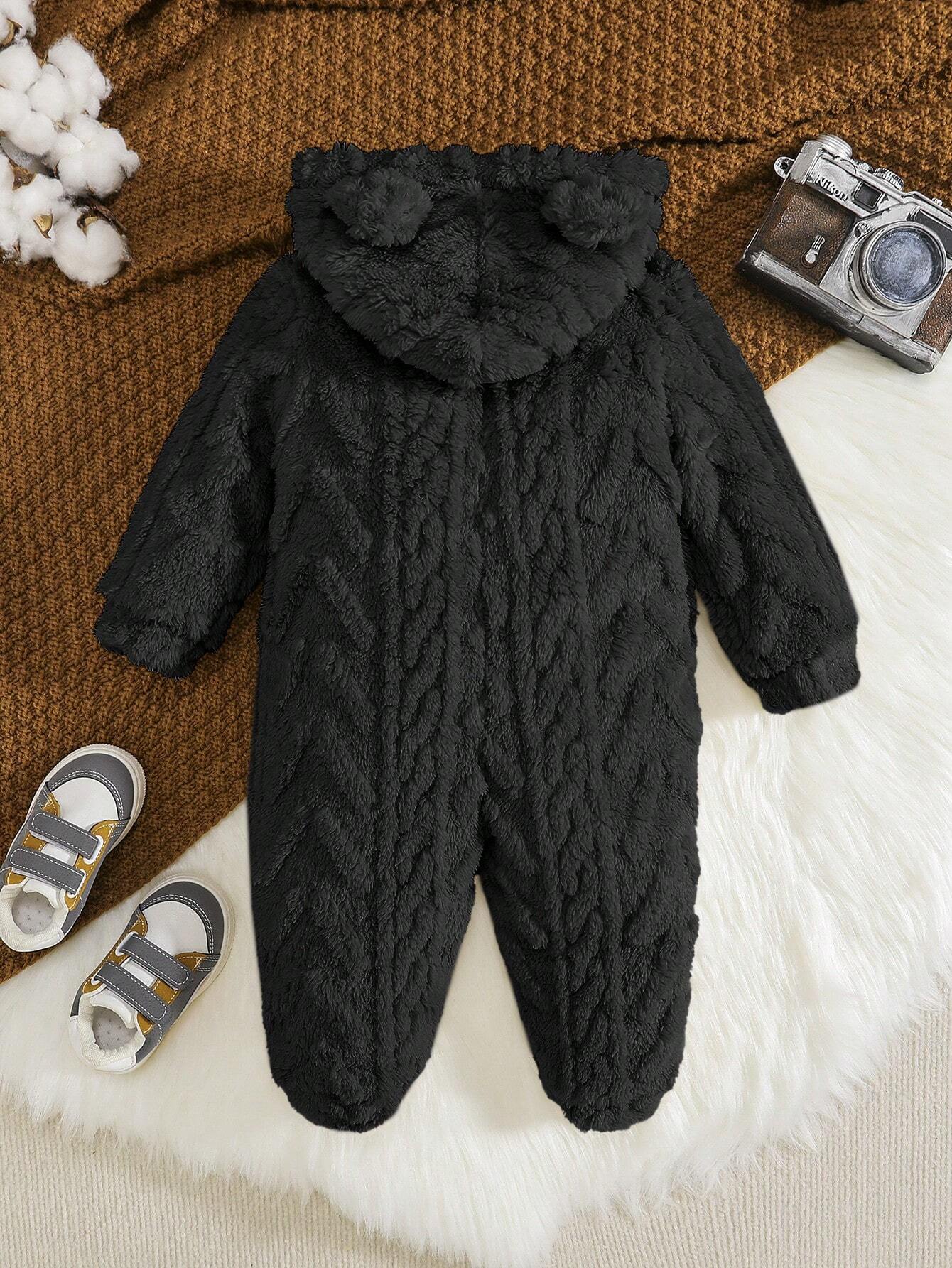 SHEIN Infant Baby Boy Cute Bear Ear Hooded Reversible Fleece Jumpsuit, Warm & Comfortable For Indoor & Outdoor Wear, All-Match And Fashionable