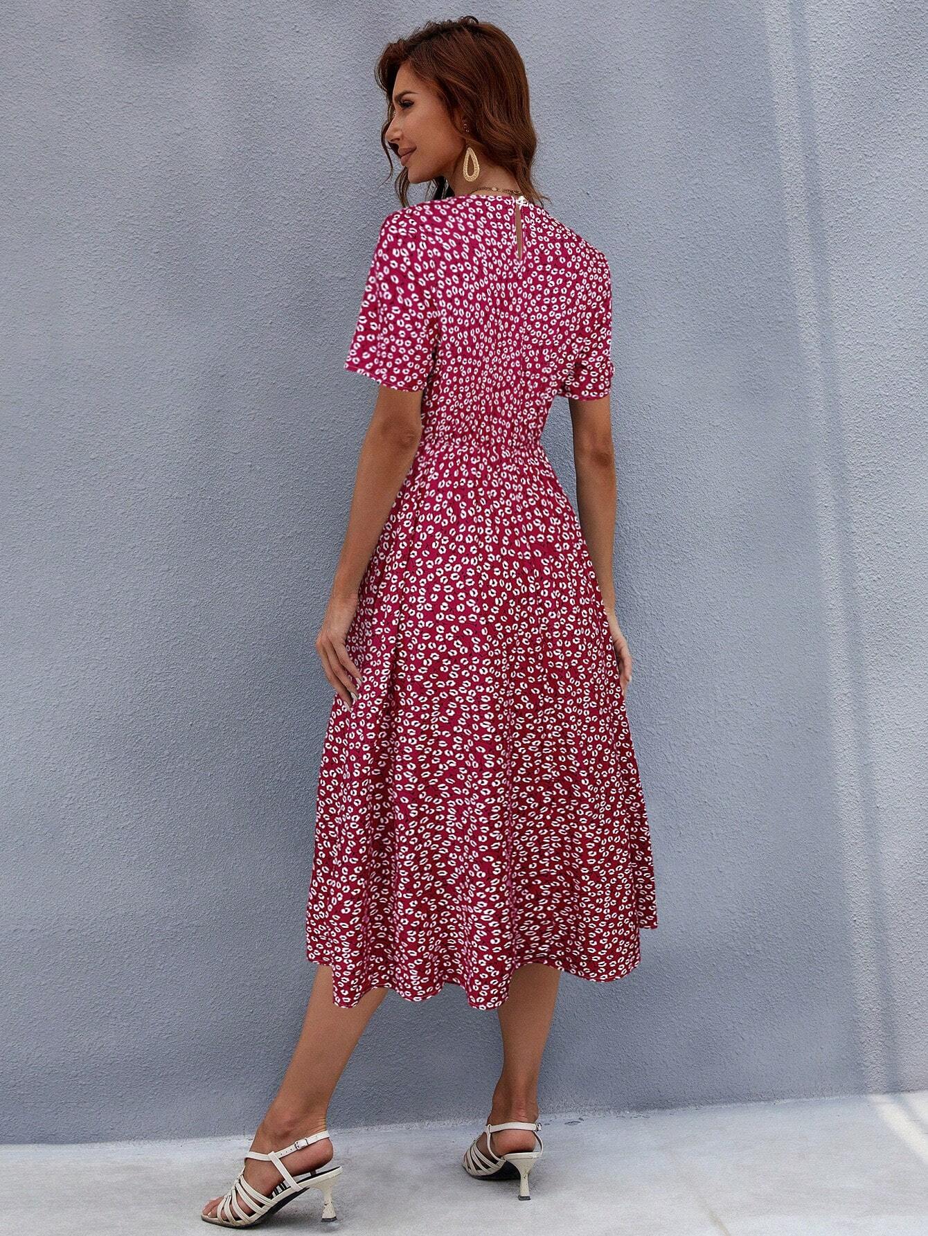 SHEIN LUNE Summer Trendy Red Printed Mid-Length Dress With Round Neckline, Layered Design, Easy Care And Durability, Suitable For Women’s Casual Wear