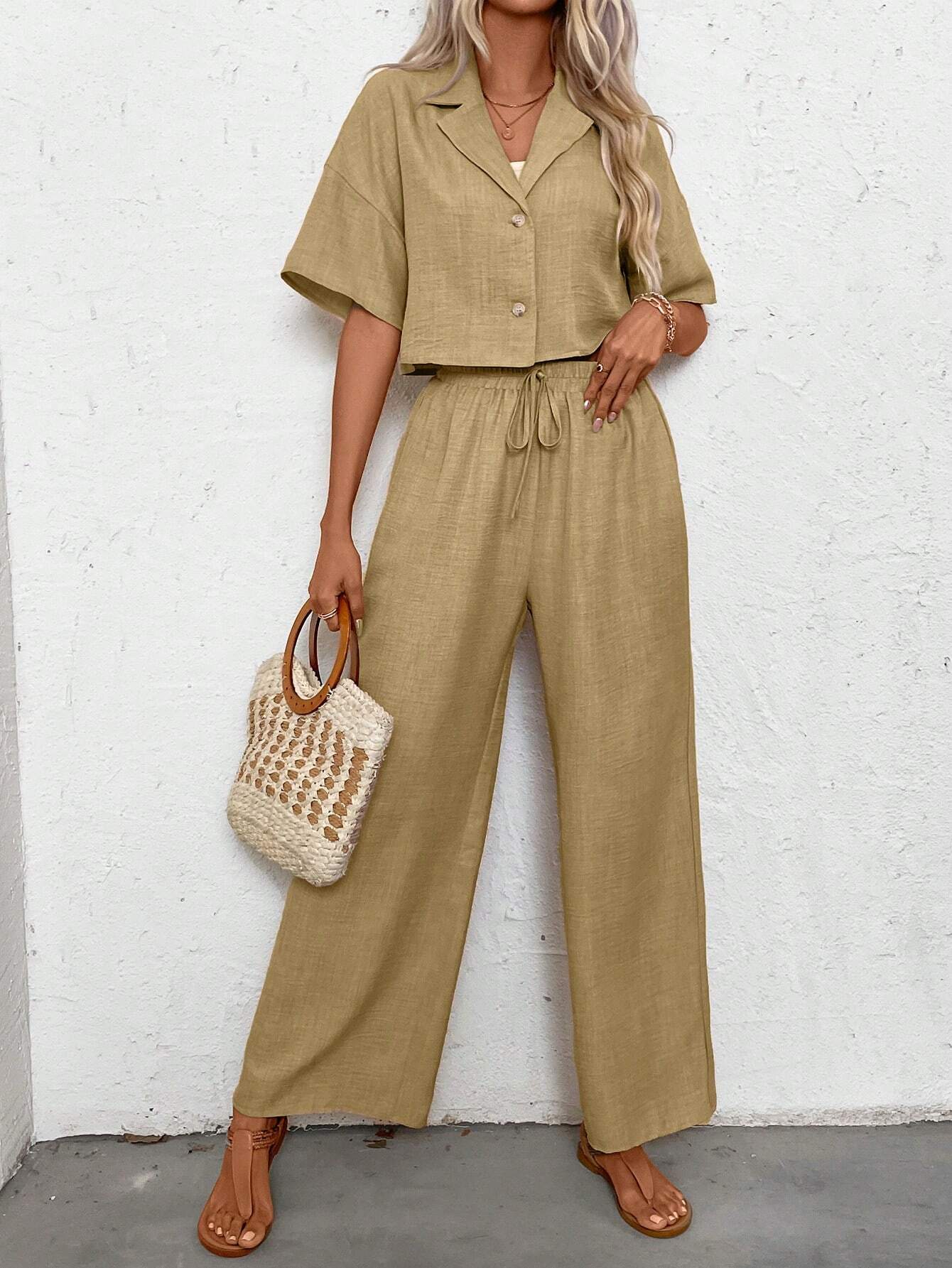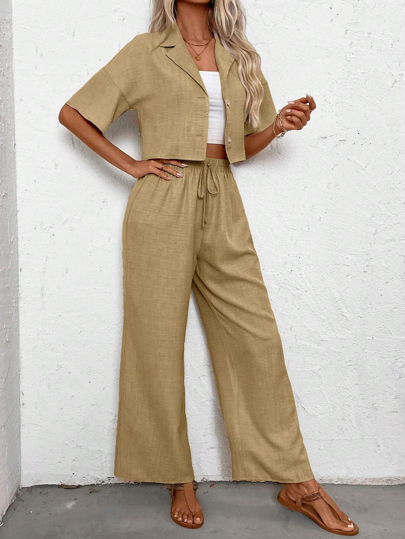 SHEIN LUNE Women’s Linen Short Sleeve Shirt And Long Pants Holiday Casual Two-Piece Set