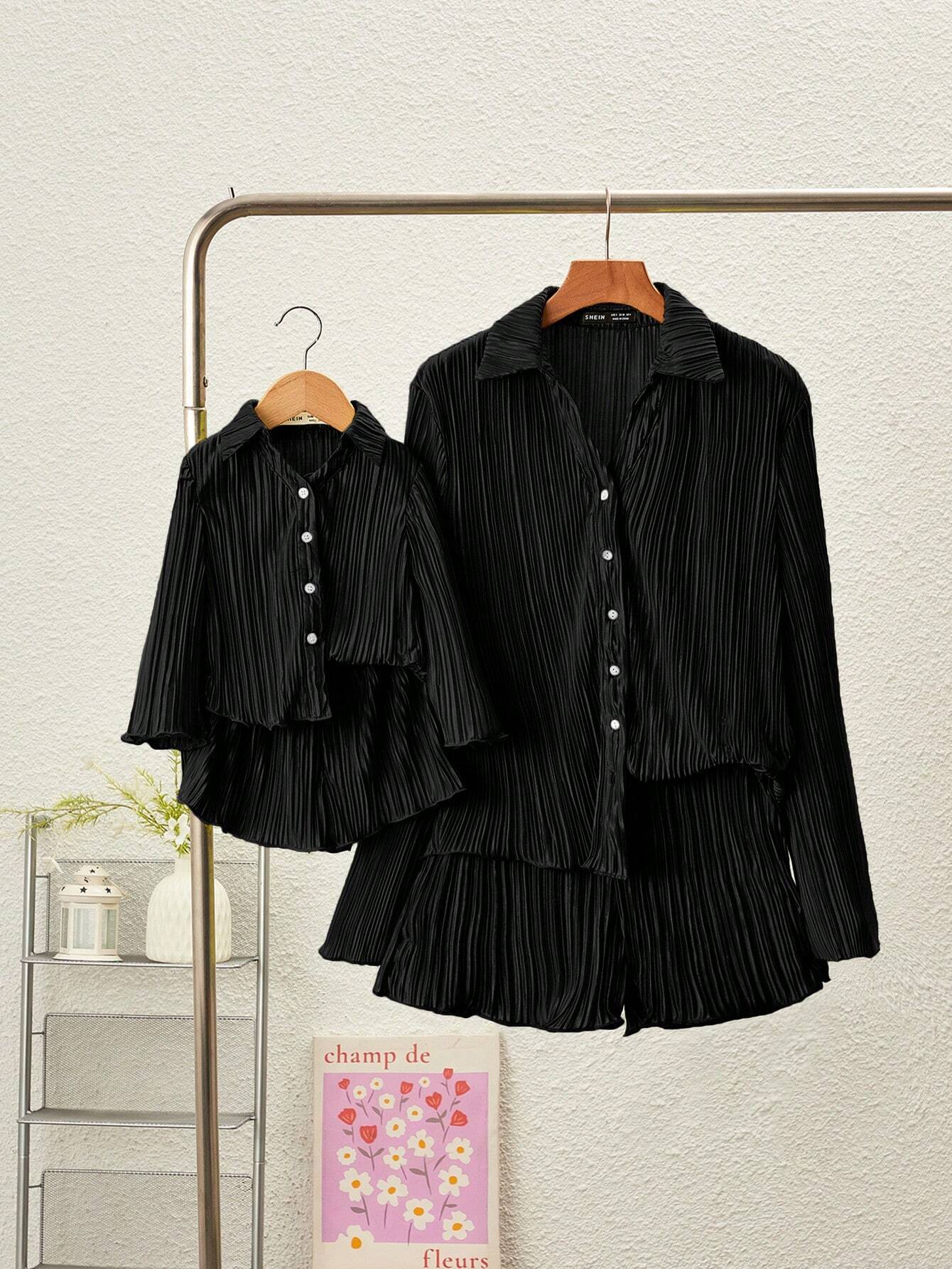 SHEIN Mommy And Me Matching Set, Baby Girl’s Cute Casual Solid Color Matte Pleated Shirt With Turn-Down Collar And Elastic Waist Shorts, Suitable For Outdoor, Vacation And Travel