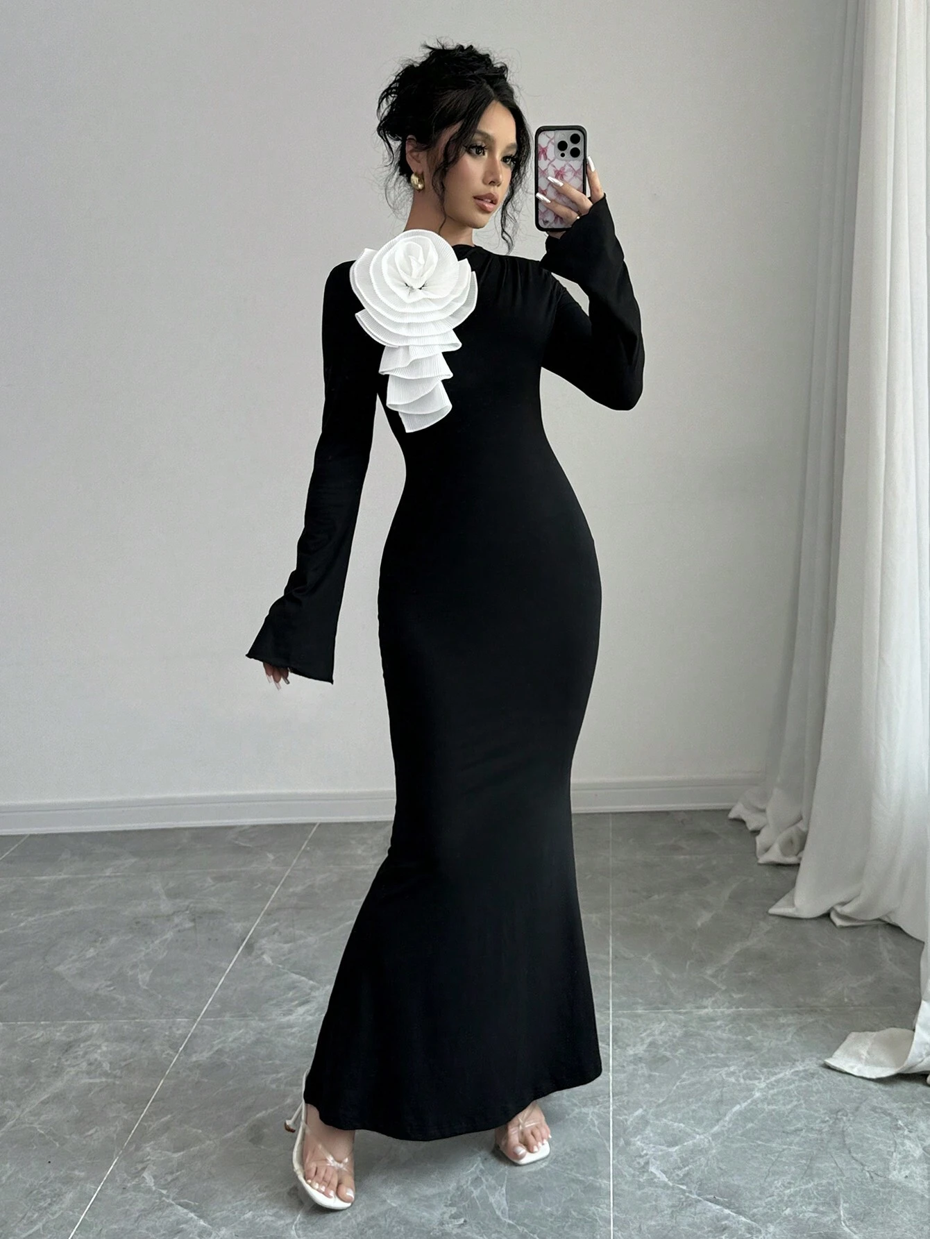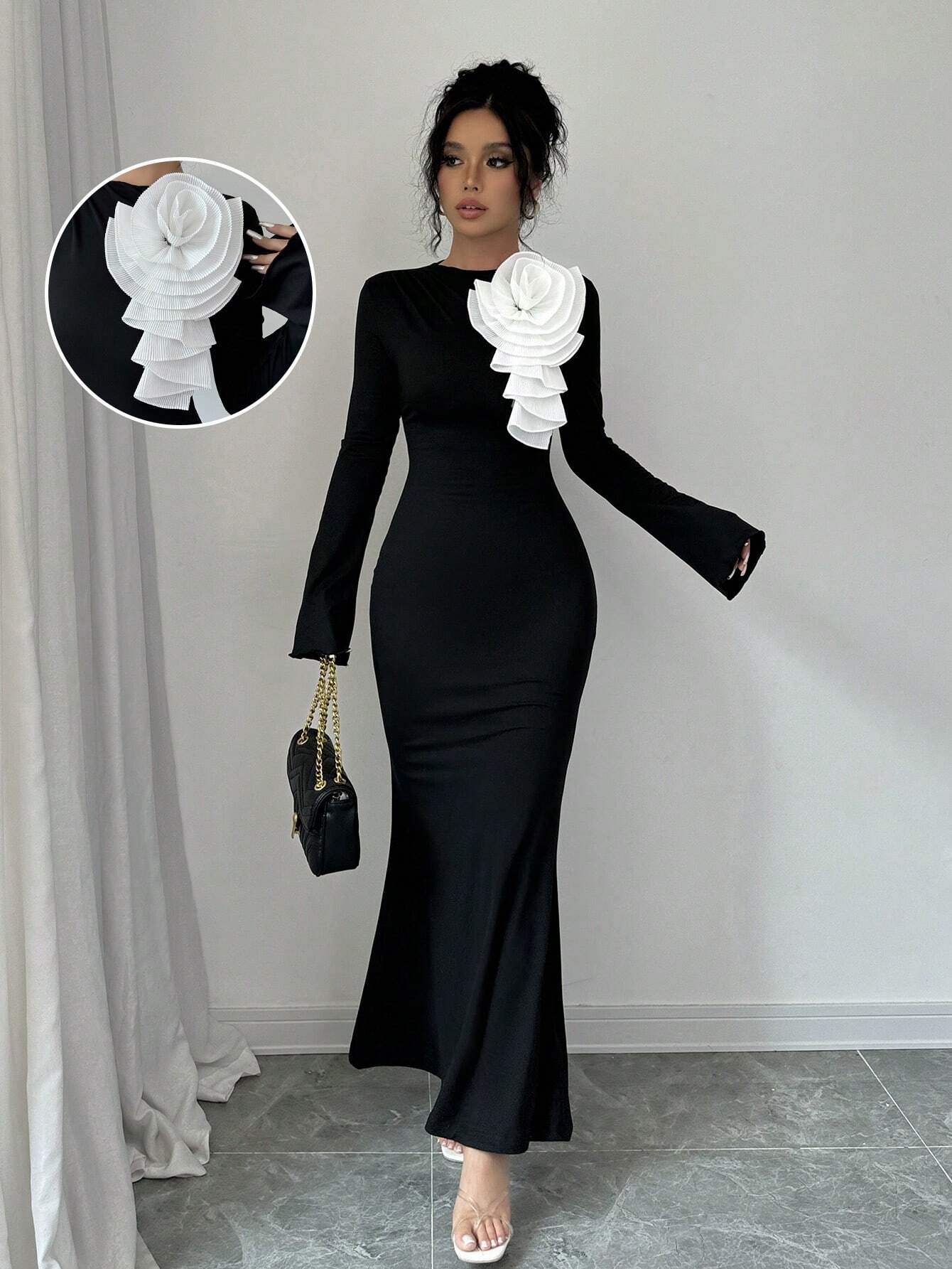 SHEIN Privé Women Spring/Summer 3D Floral Decor Crew Neck Long Sleeve Fishtail Hem Fitted Elegant Dress
