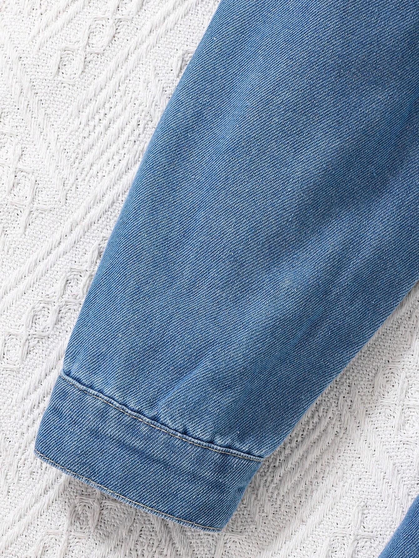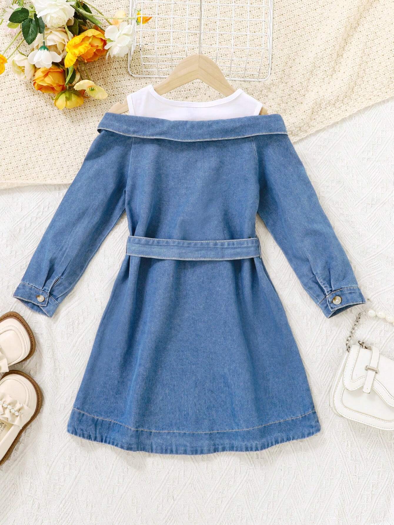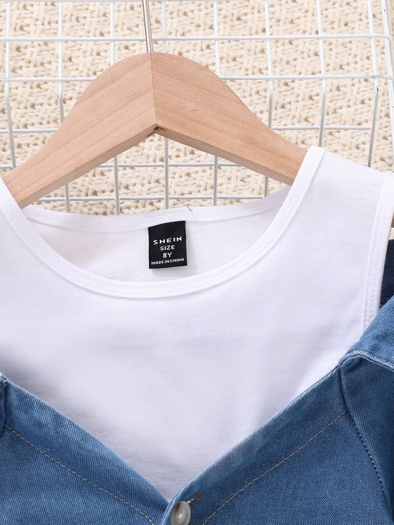 SHEIN Streecool Kids Tween Girls Casual Blue Loose Faux 2-Piece Denim Dress