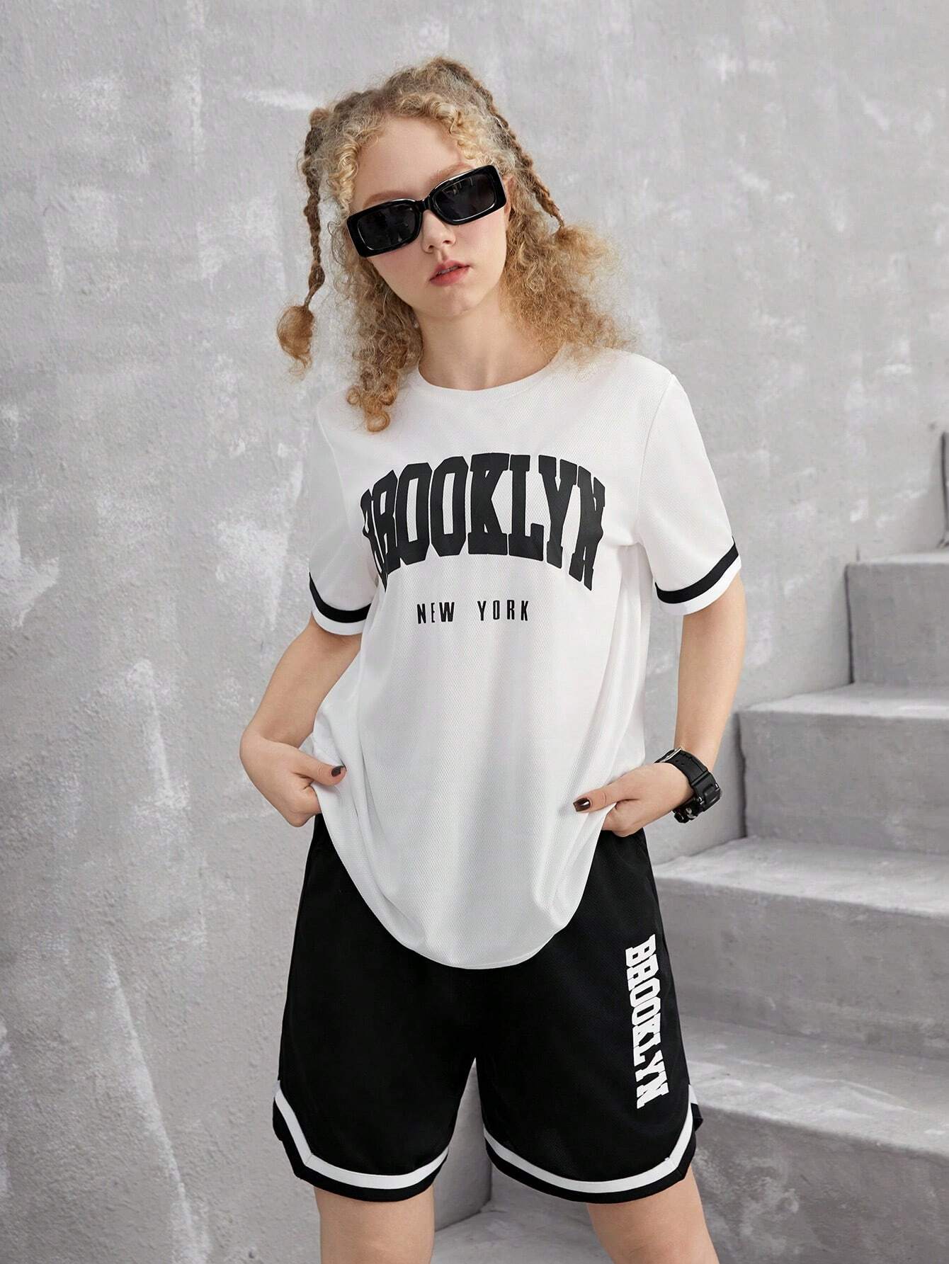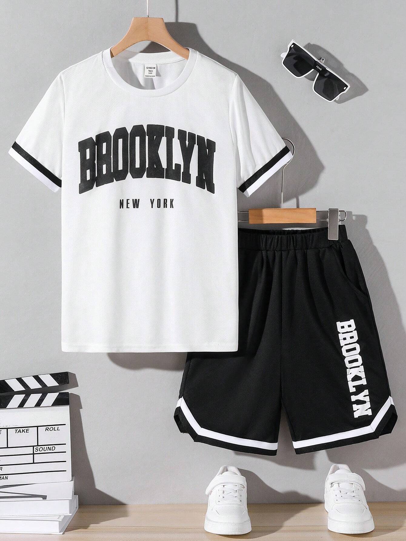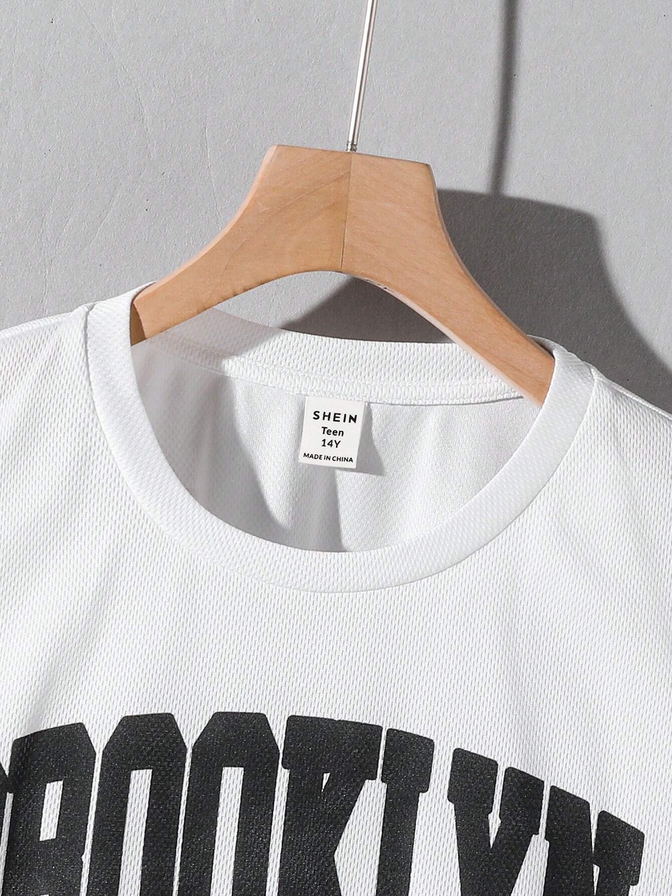 SHEIN Teen Girl Casual 2pcs/Set – Letter Printed Short Sleeve T-Shirt With Patchwork Striped Waistband And Pocket Shorts