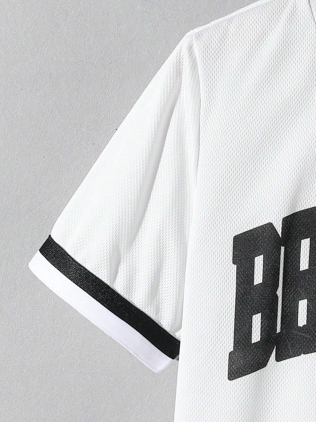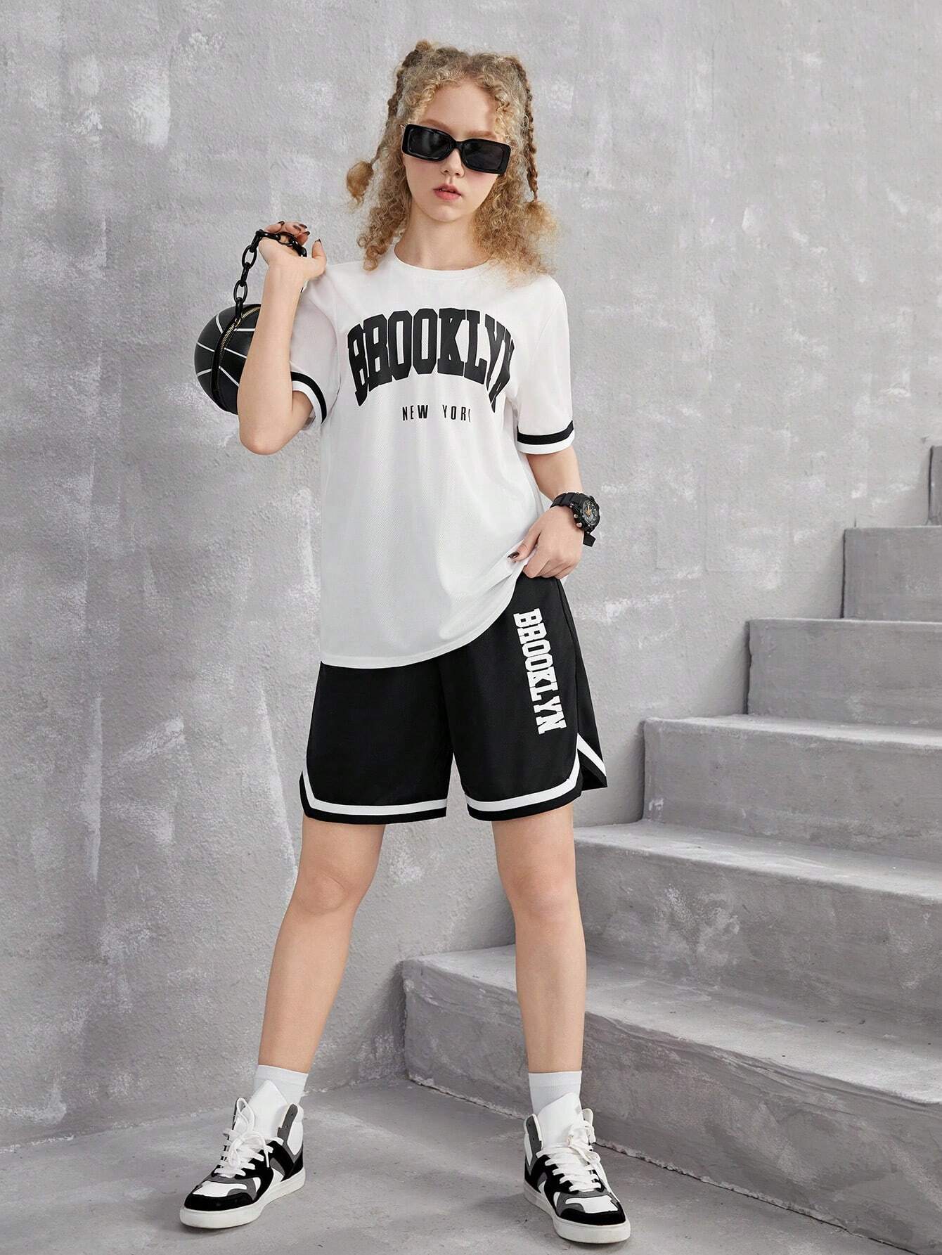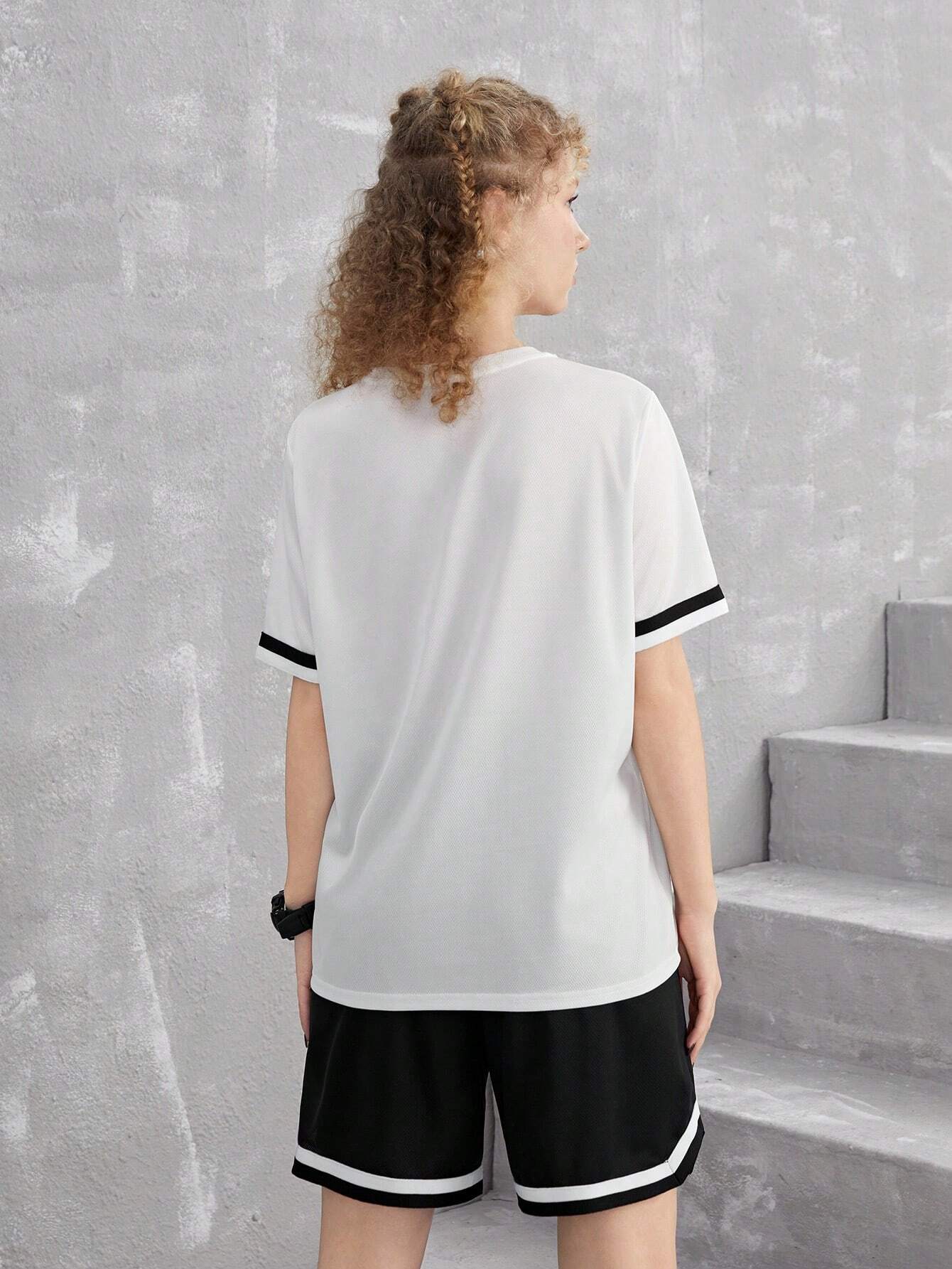 SHEIN Teen Girl Casual 2pcs/Set – Letter Printed Short Sleeve T-Shirt With Patchwork Striped Waistband And Pocket Shorts