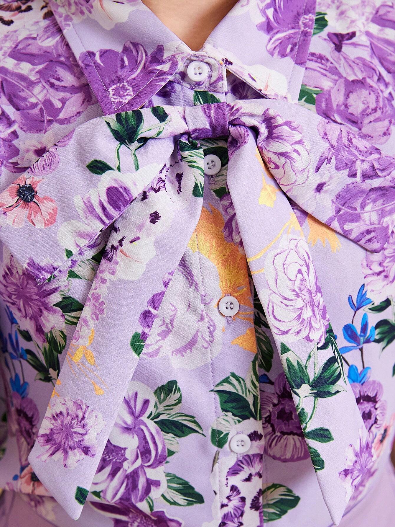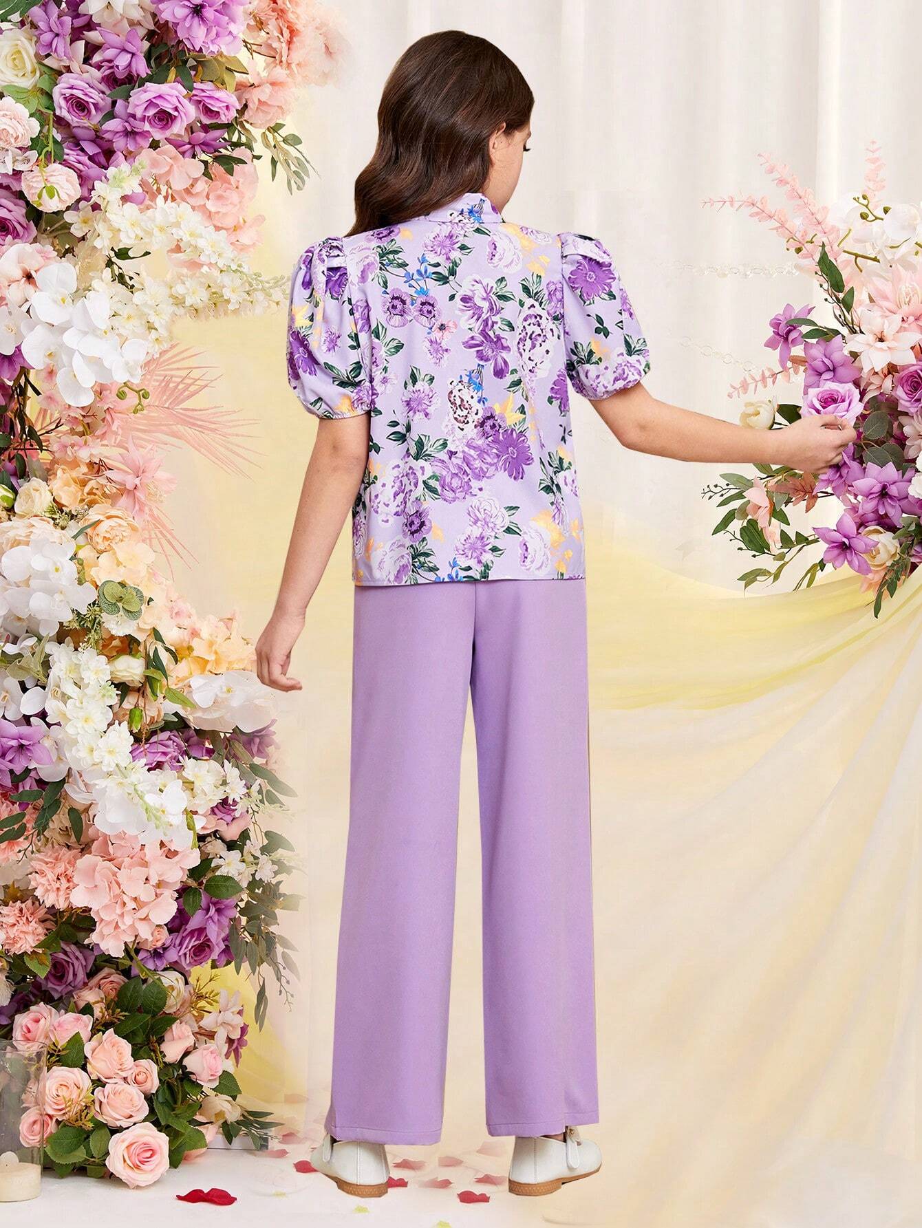 SHEIN Tween Girl Loose And Cute Turn-Down Collar Bubble Sleeve Floral Print Shirt And Pant Set