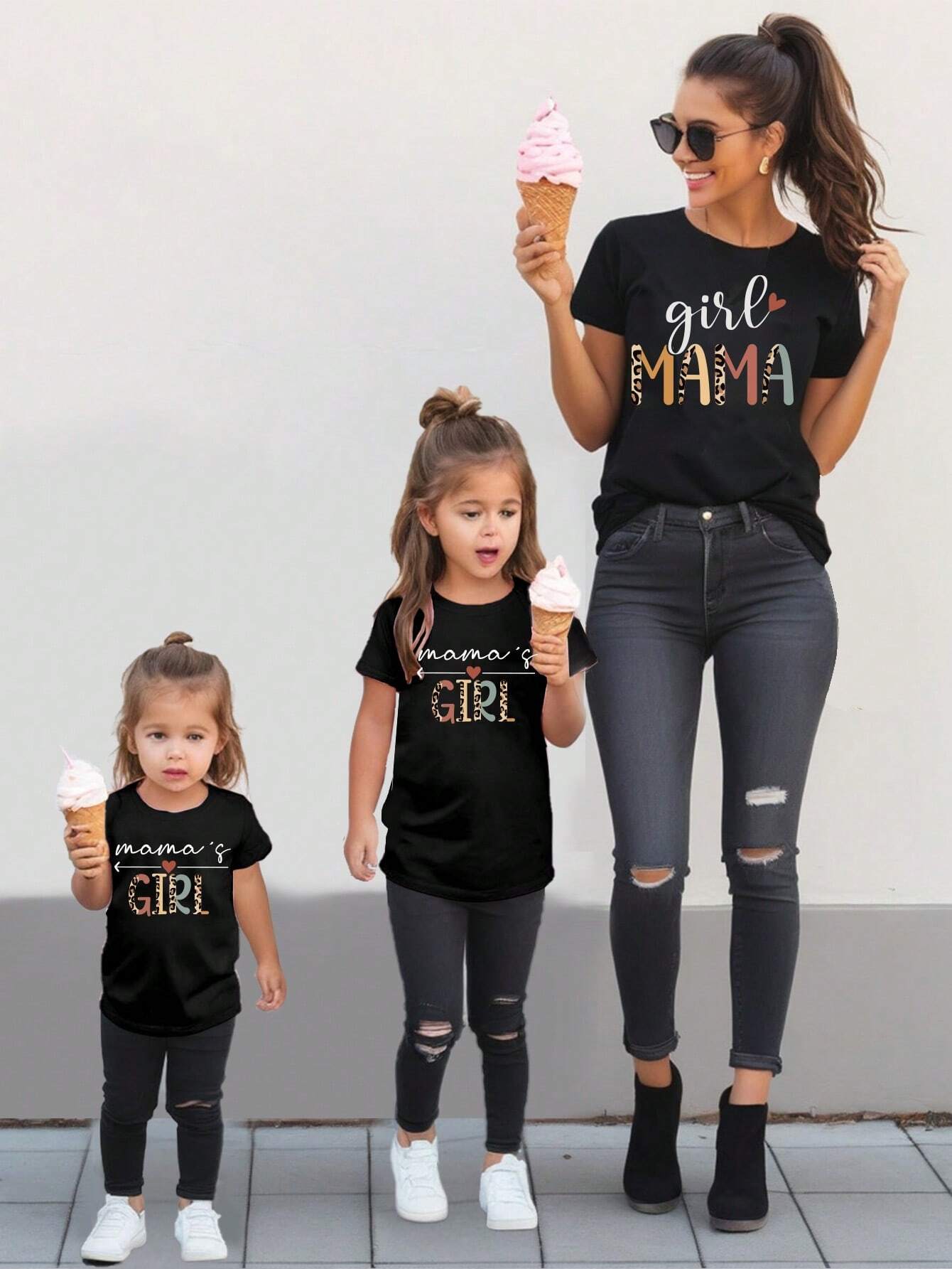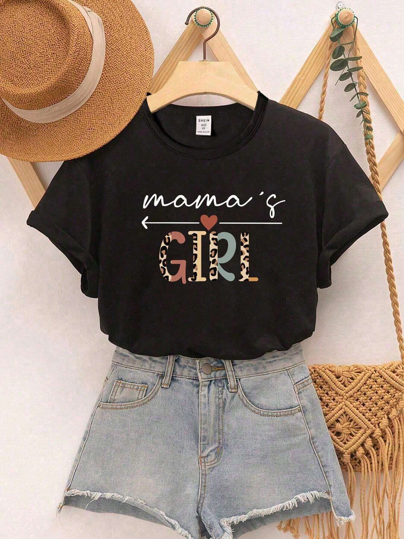 SHEIN Tween Girl Mother Day Casual Leopard Letter Heart Pattern Round Neck Short Sleeve T-Shirt , Mommy And Me Matching Outfits ,3 Pieces Are Sold Separately