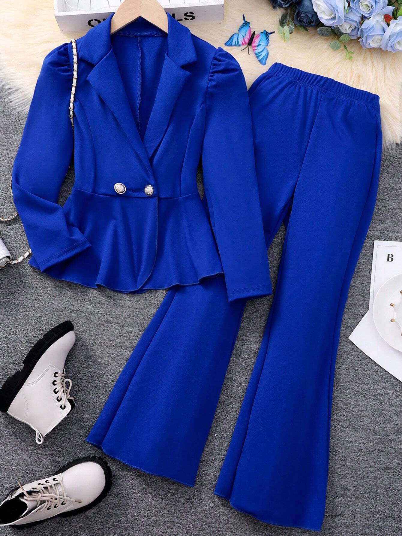 SHEIN Tween Girl Puff Sleeve Double Button Peplum Blazer & Flare Leg Pants