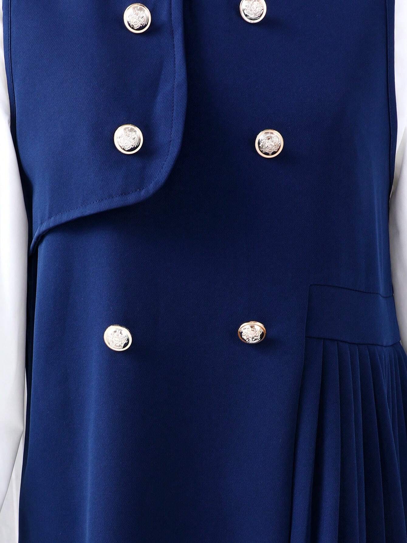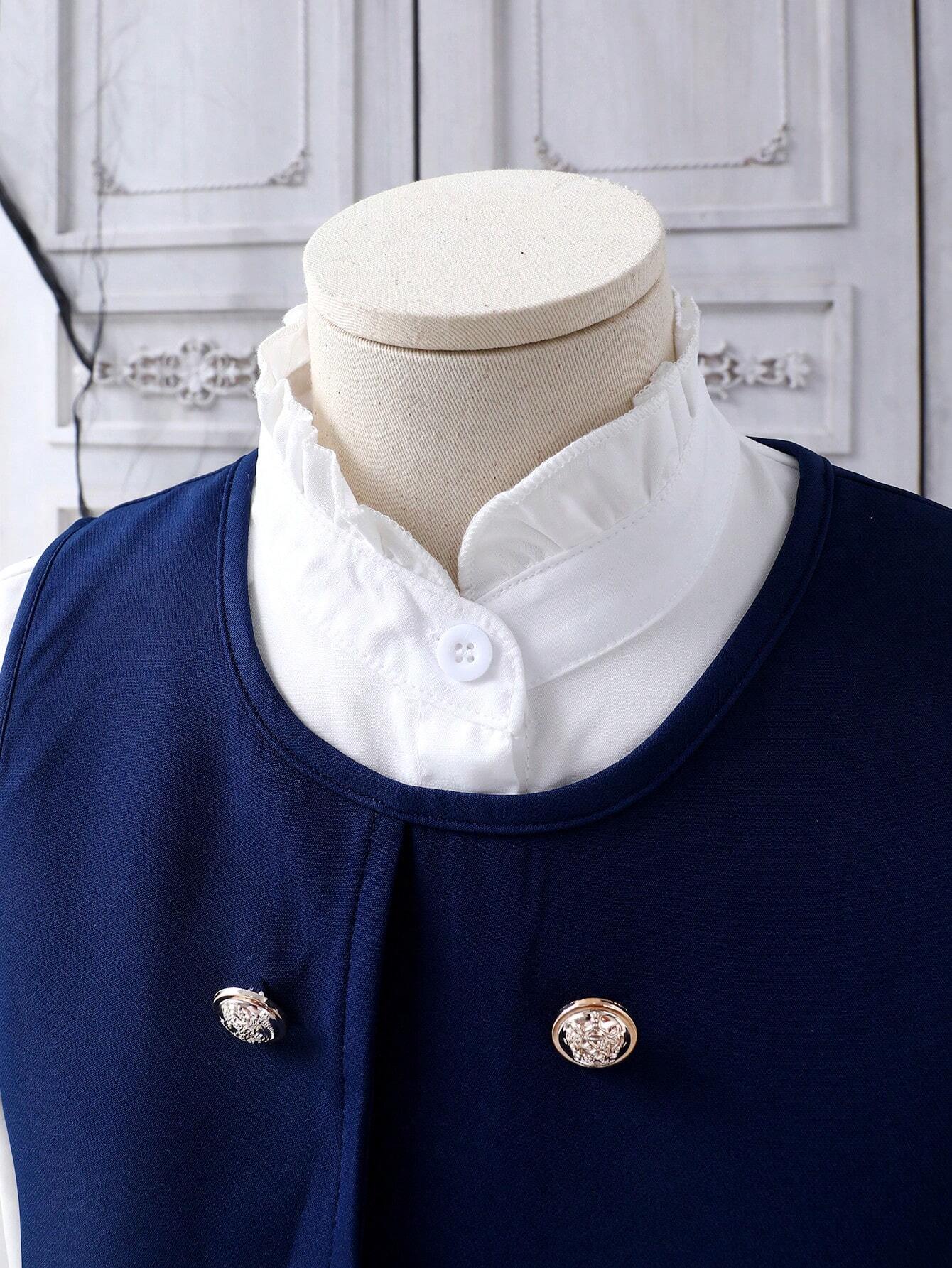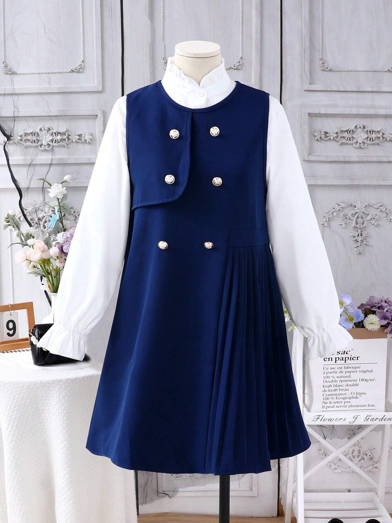 SHEIN Tween Girls’ Elegant Academy Style Double-Breasted Tank Dress And Lace Hem Shirt 2pcs/Set For Back-To-School/Graduation Season