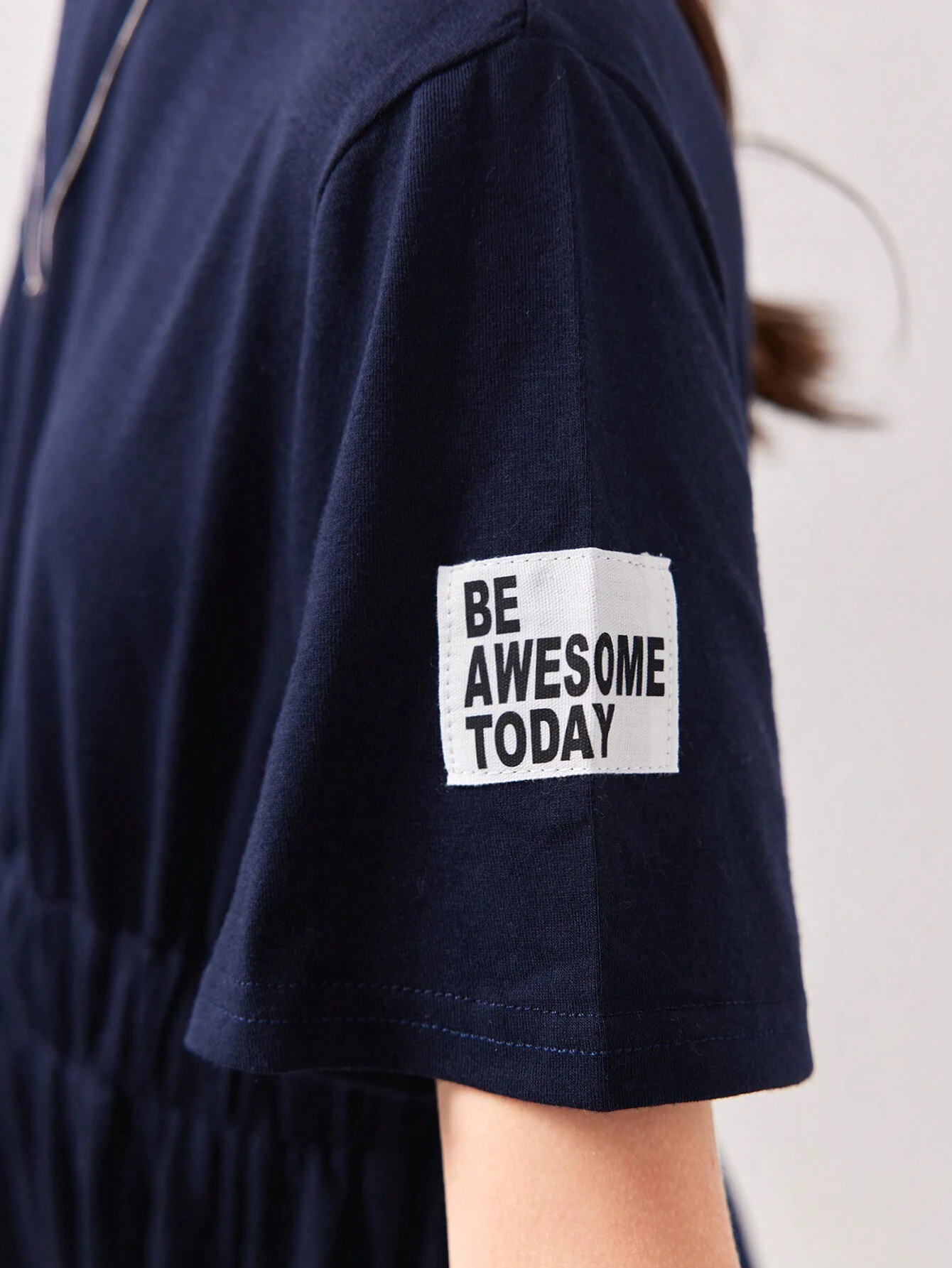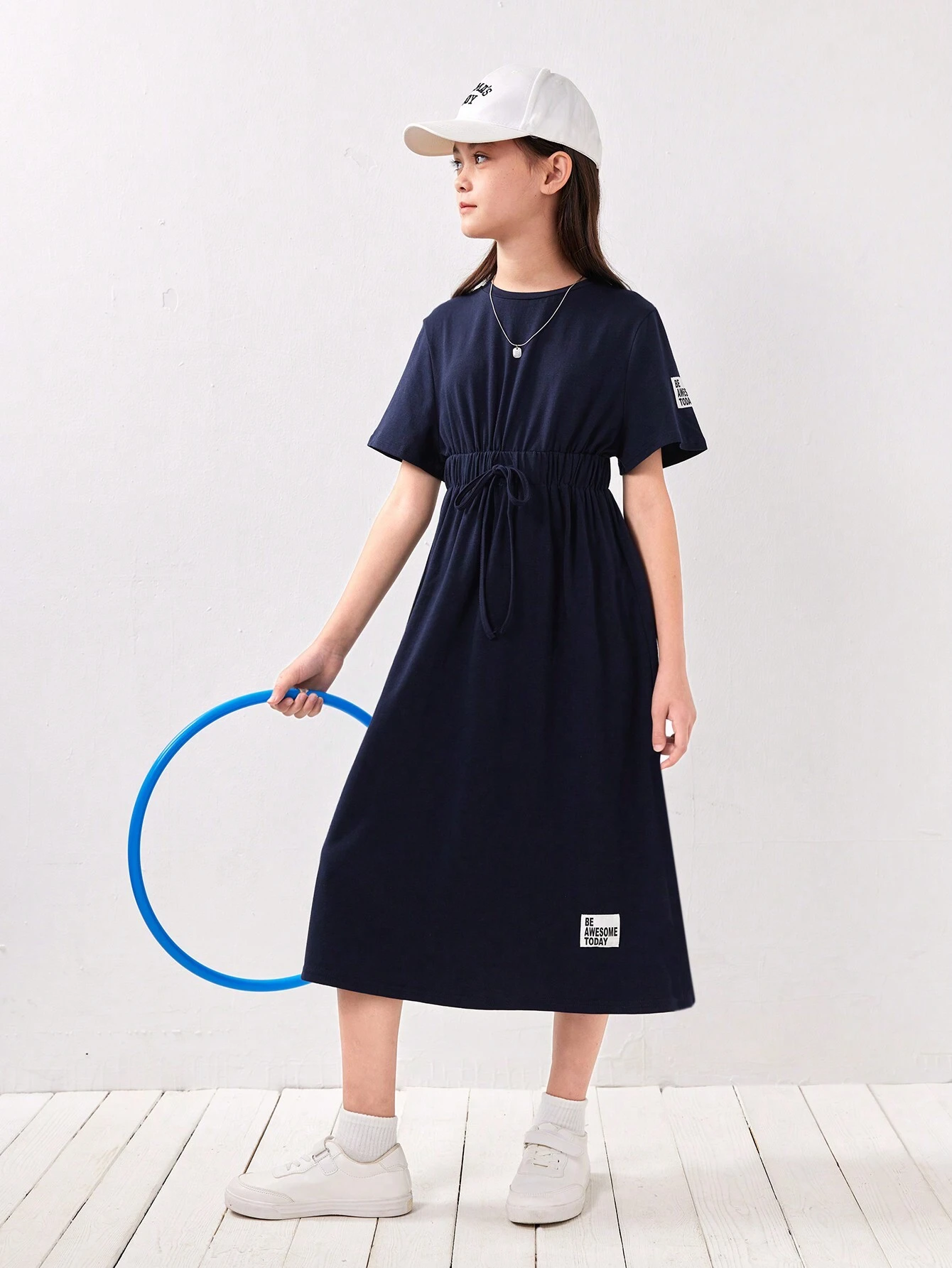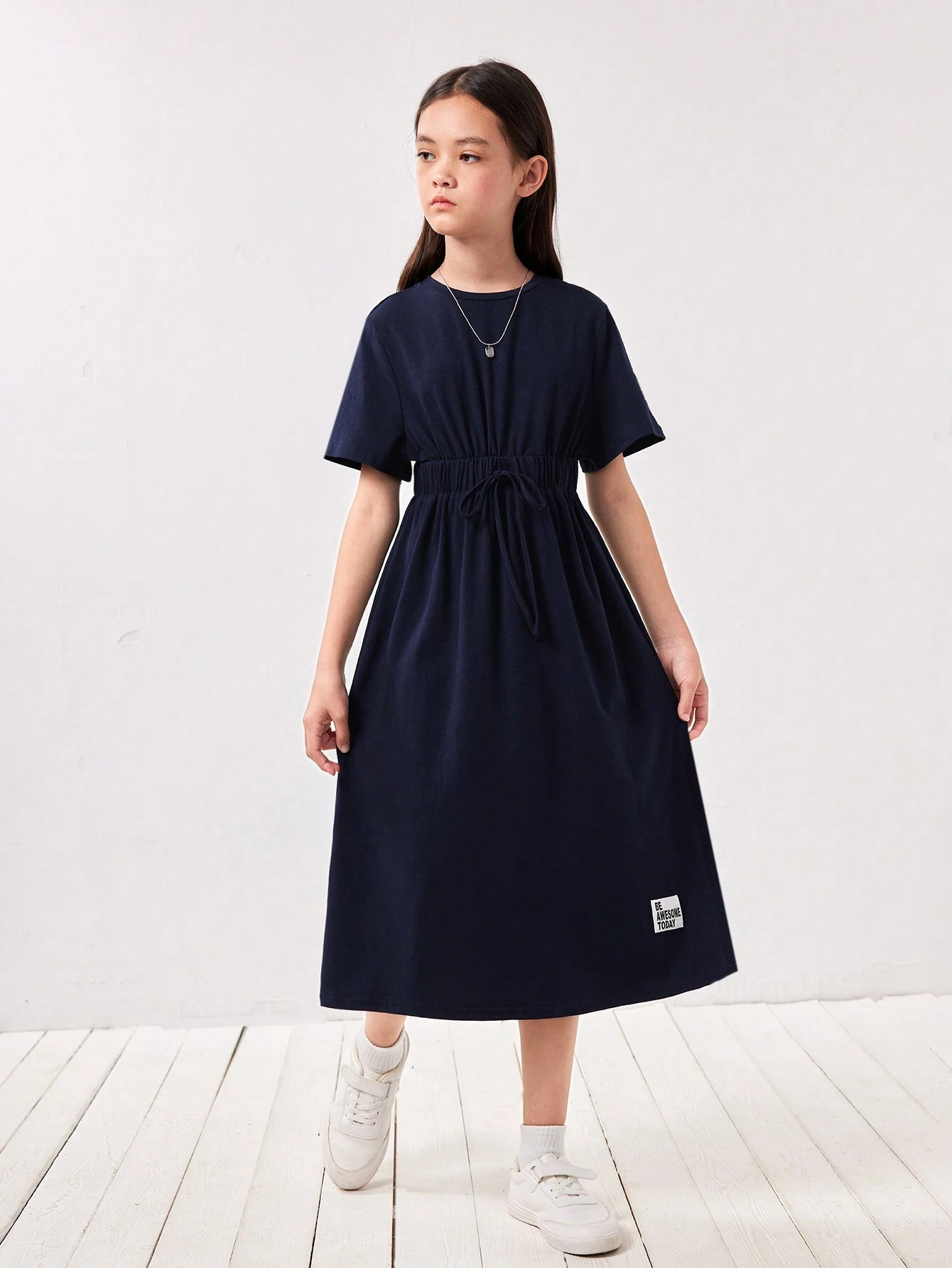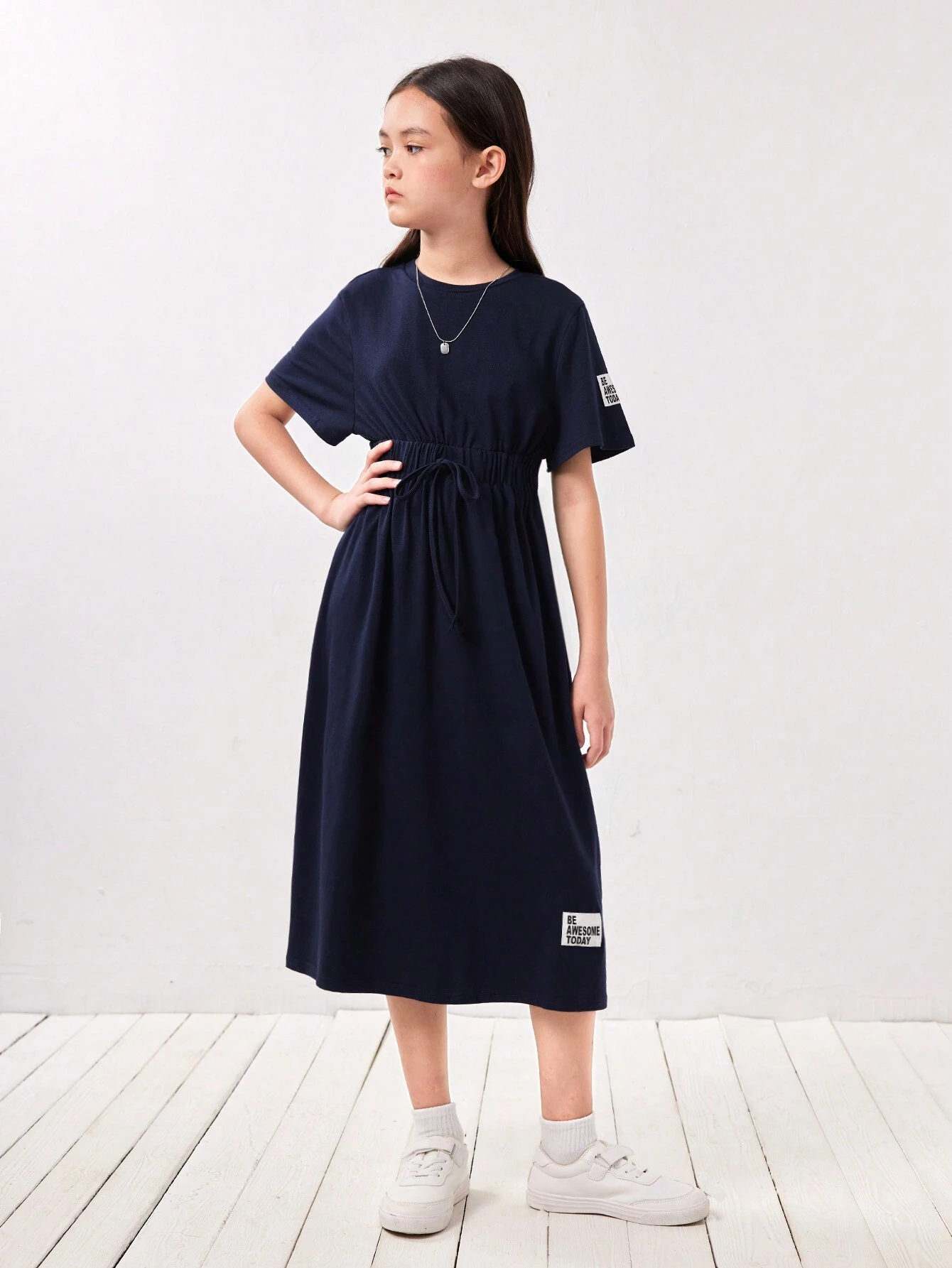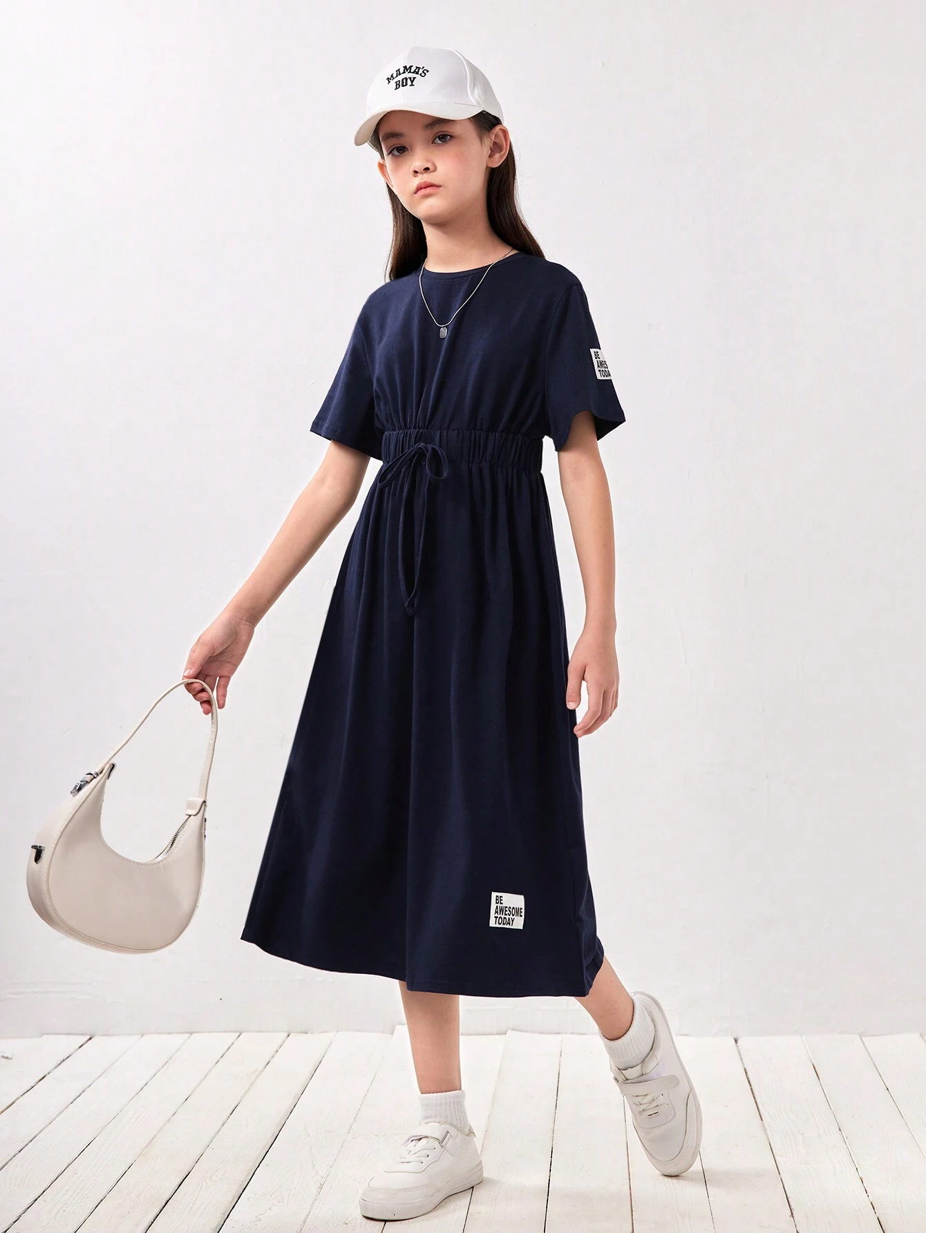 SHEIN Tween Girls’ Loose Vintage Check Pattern Drawstring Waist Bowknot Patch Decorated Dark Blue Midi Dress