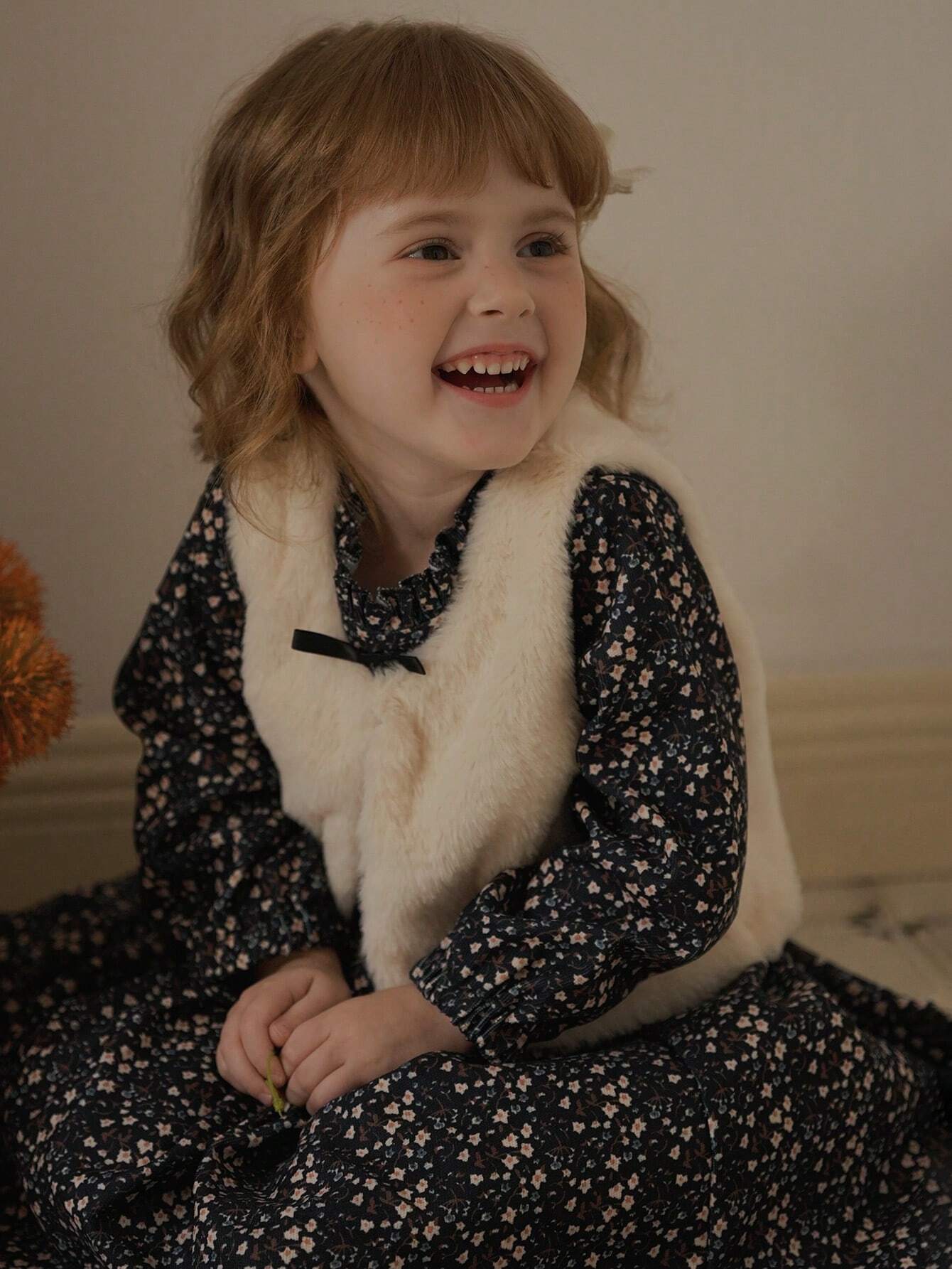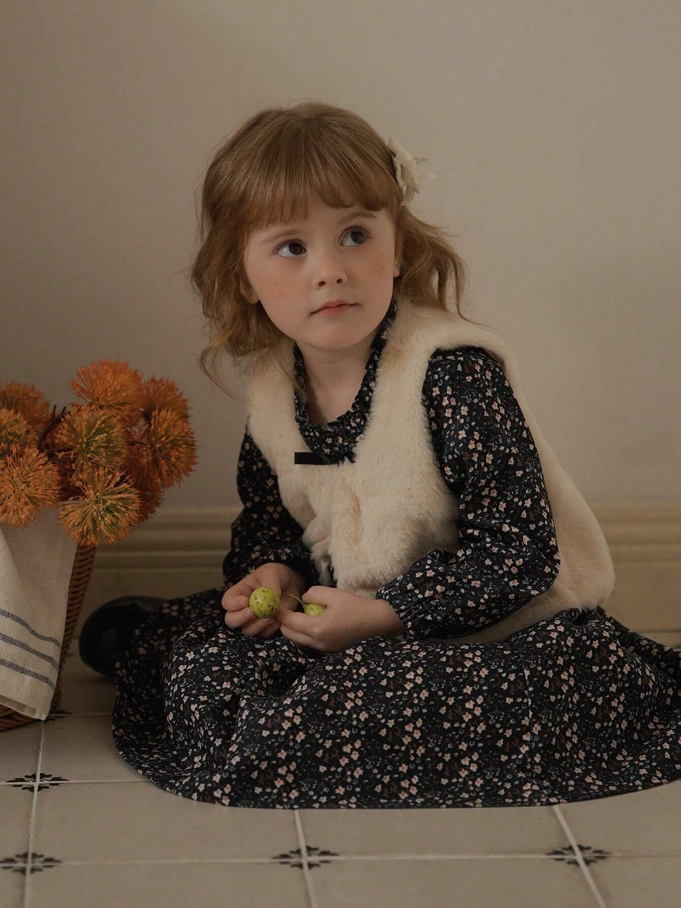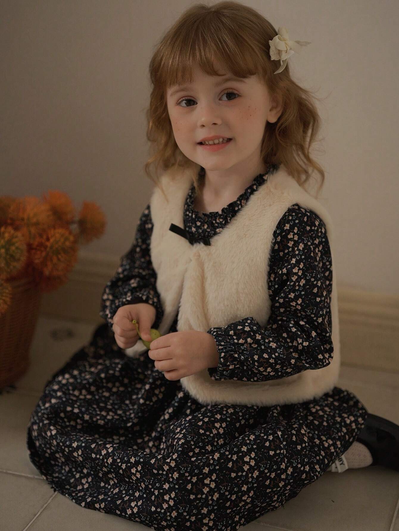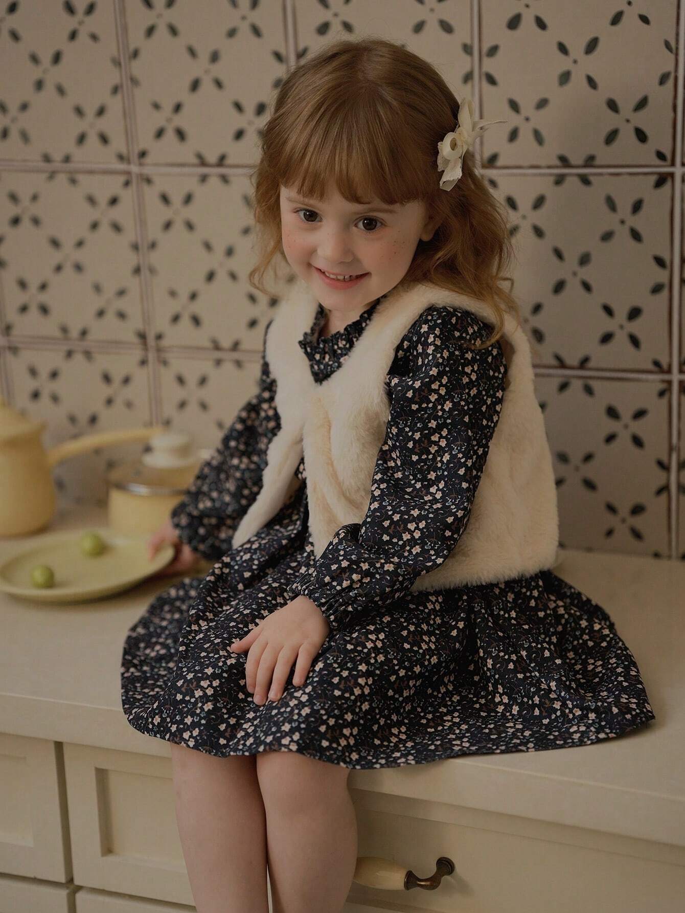 SHEIN Vintaside Kids 2pcs Young Girl Fashionable Casual Sporty Fluffy Faux Fur Vest Jacket And Letter Print Corduroy Dress Set, Sweet And Warm Outfit For Party, Holiday, Daily Wear Suitable For Spring, Autumn And Winter