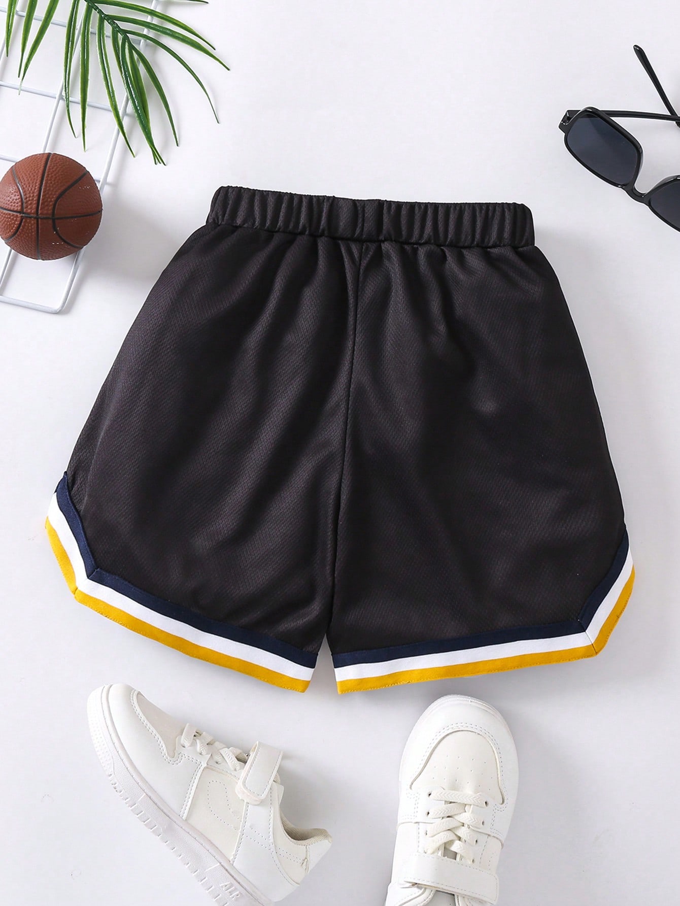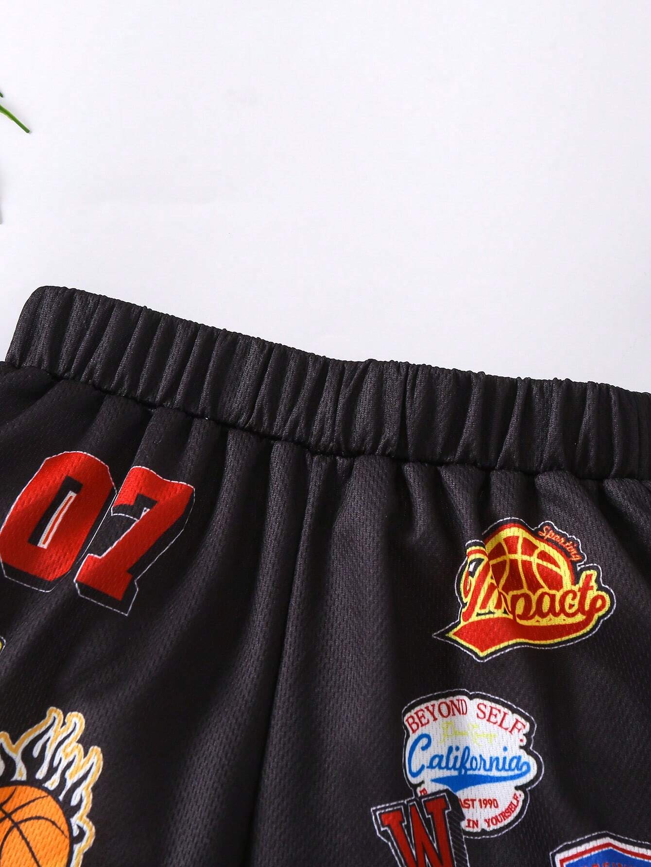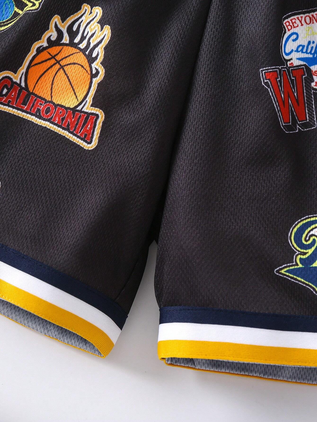 SHEIN Young Boy Casual Sports Basketball-Themed Logo Printed Shorts, With Striped Woven Tape On Cuffs, Suitable For Summer And Various Occasions, Looks Handsome