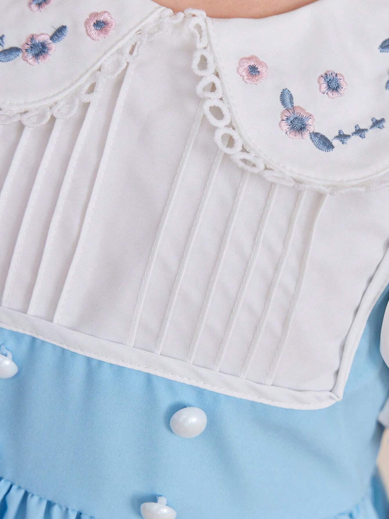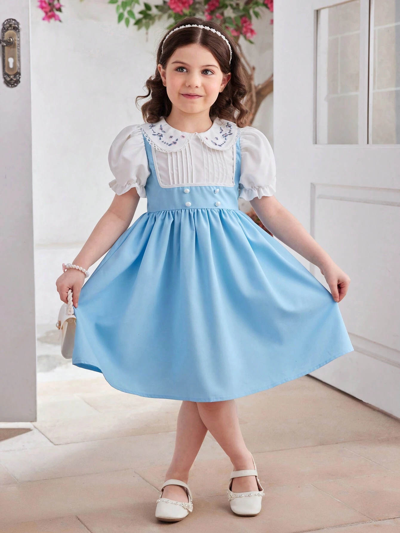 SHEIN Young Girl Elegant And Princess Style College Color-Block Lace Embroidery Peter Pan Collar Puff Sleeve Two-Piece Spliced Blue Square Neckline A-Line Knee-Length Toddler Young Girl Dress, Suitable For Summer, Going Back To School, Parties, Performances, And Family Gatherings