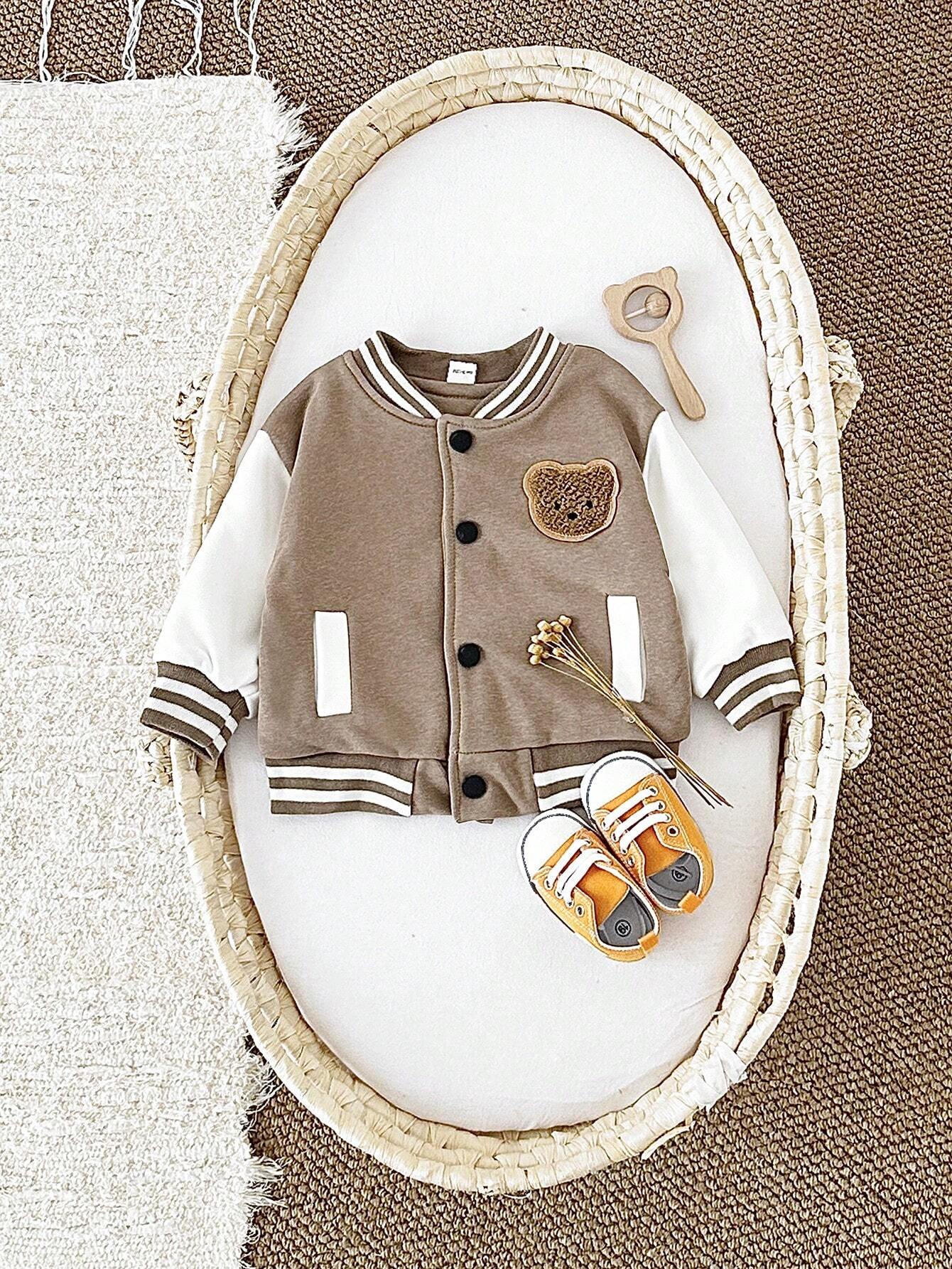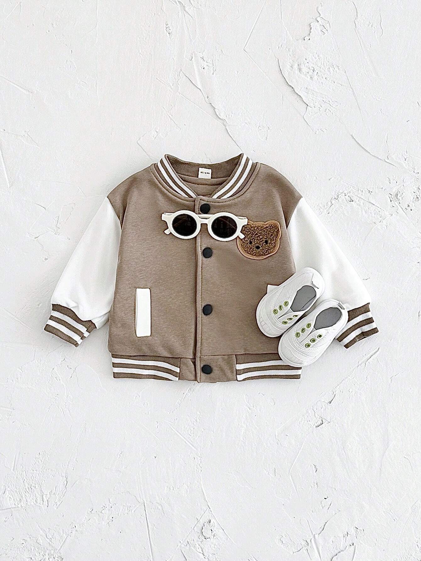 Toddler Boys’ Casual Bear Embroidered Long Sleeve Jacket Baseball Coat, Autumn