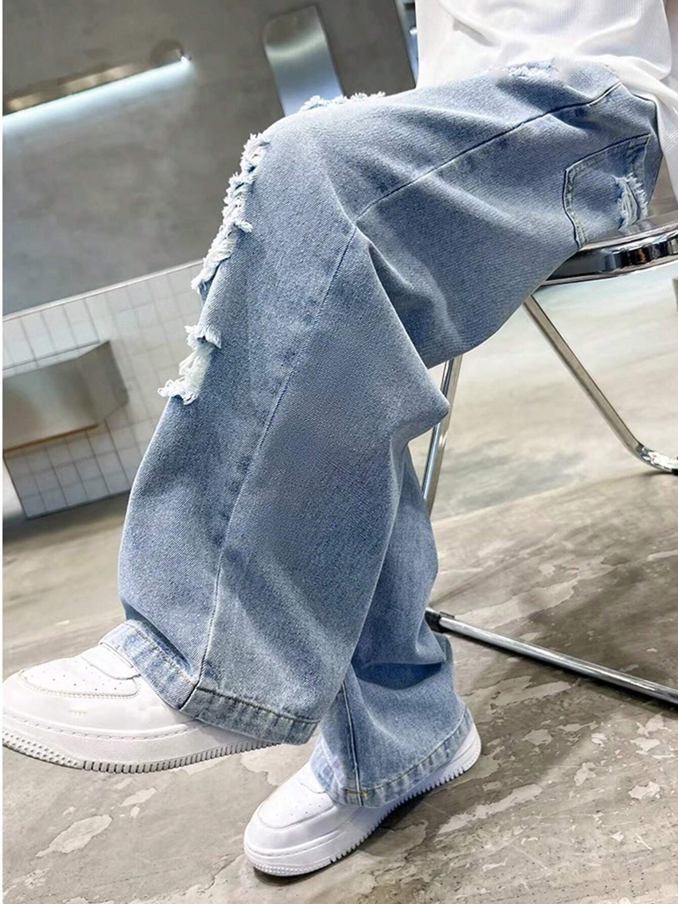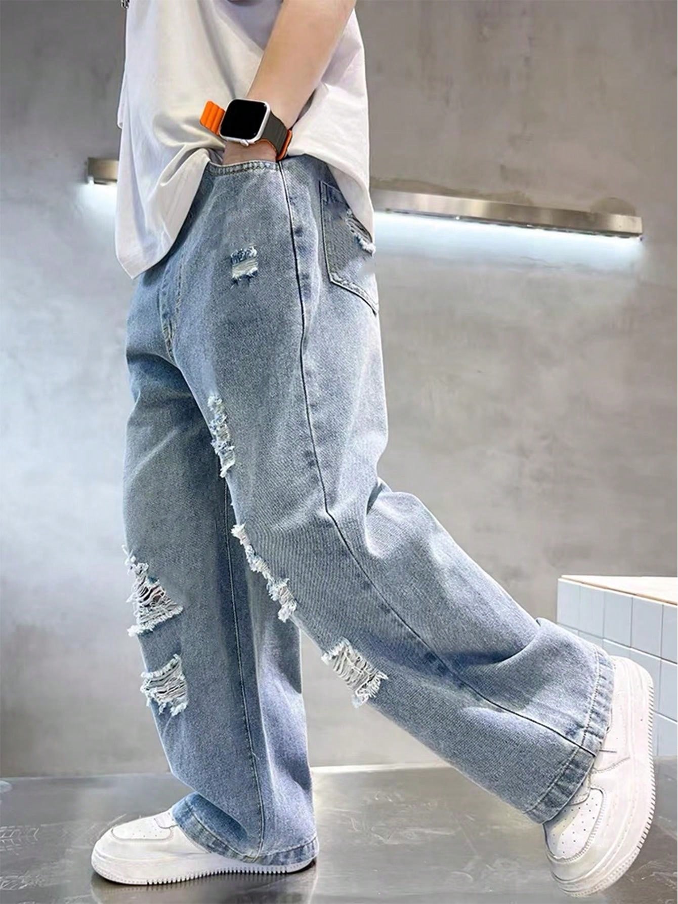 Tween Boy Ripped Straight-Leg Jeans, Casual Loose-Fit High Waist Teenage Denim Long Pants