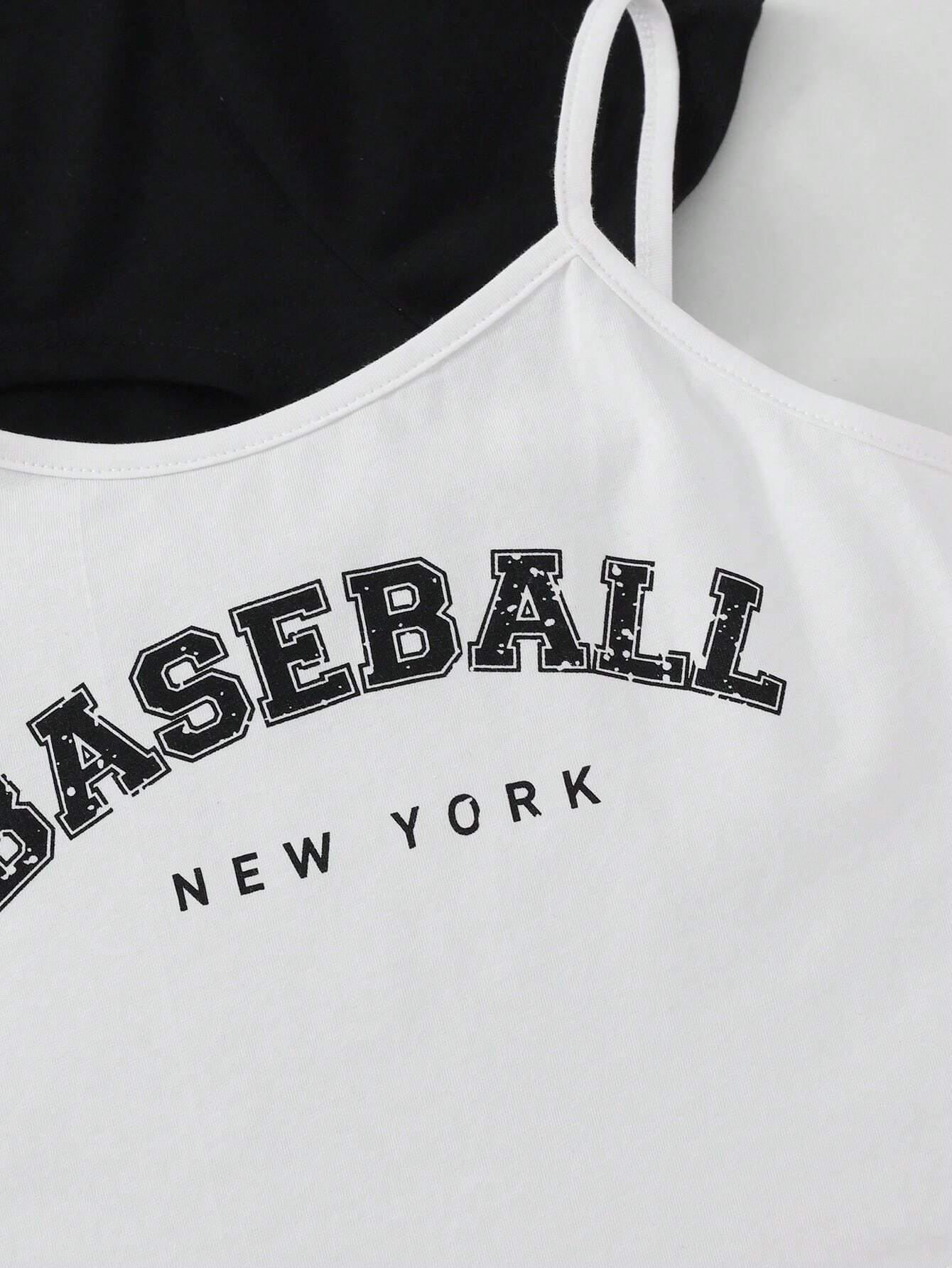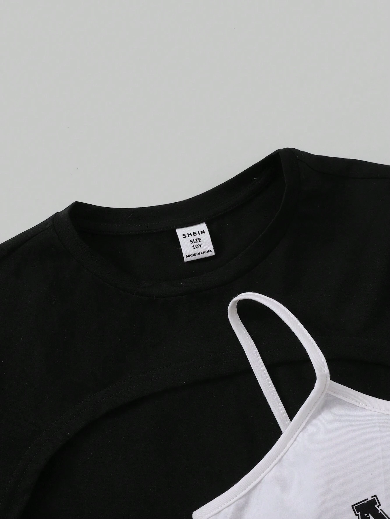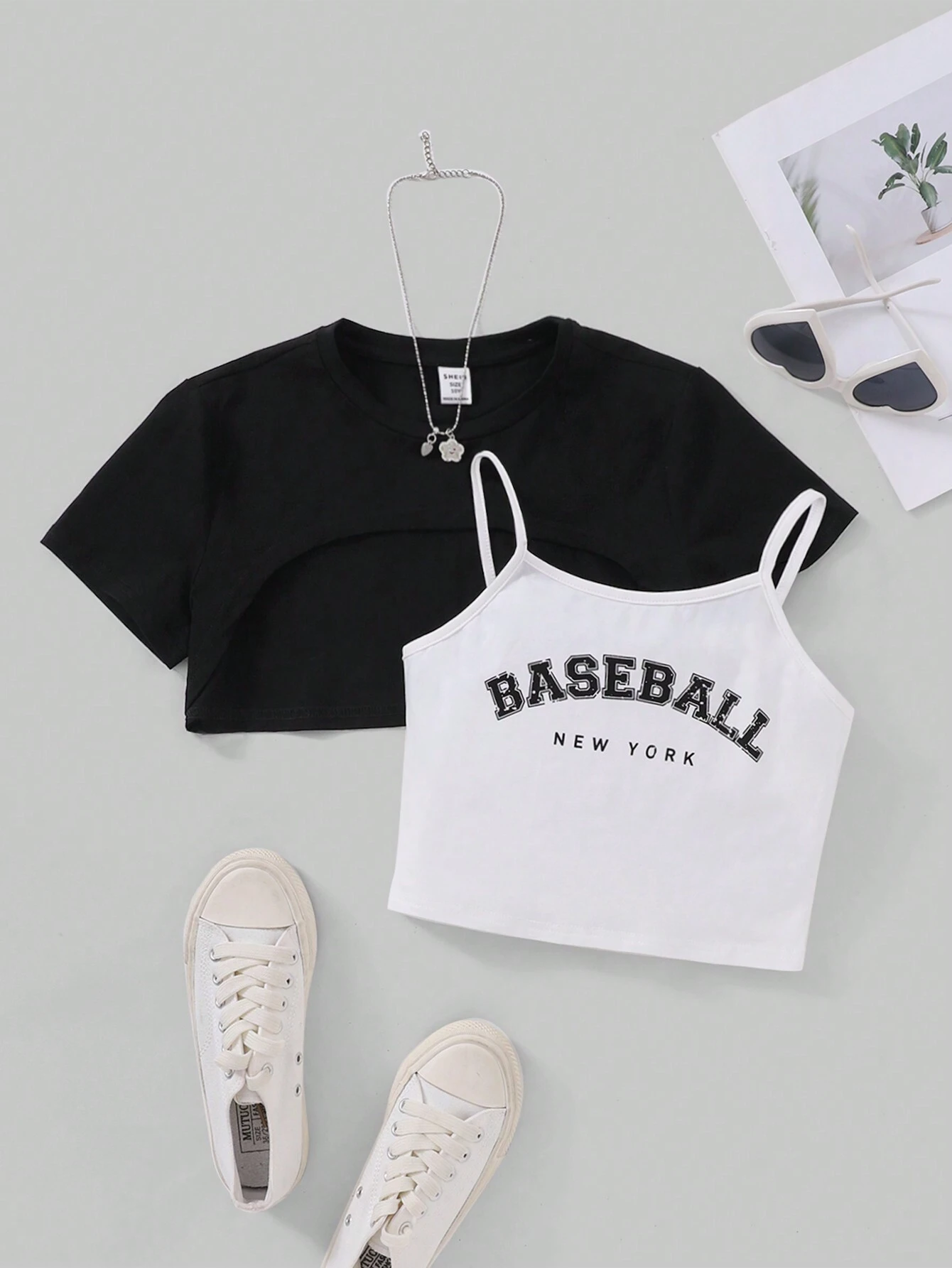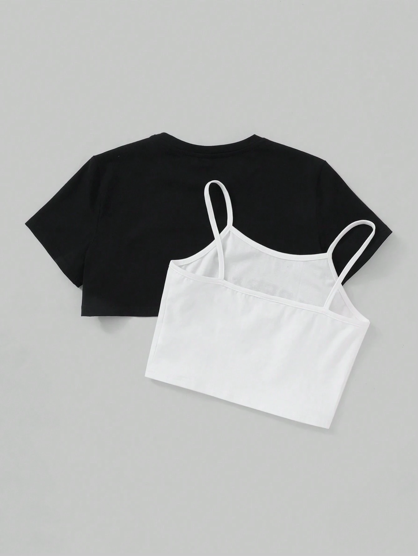Tween Girl Fashionable Athletic Knitted Short Sleeve T-Shirt And Camisole Top 2pcs Set