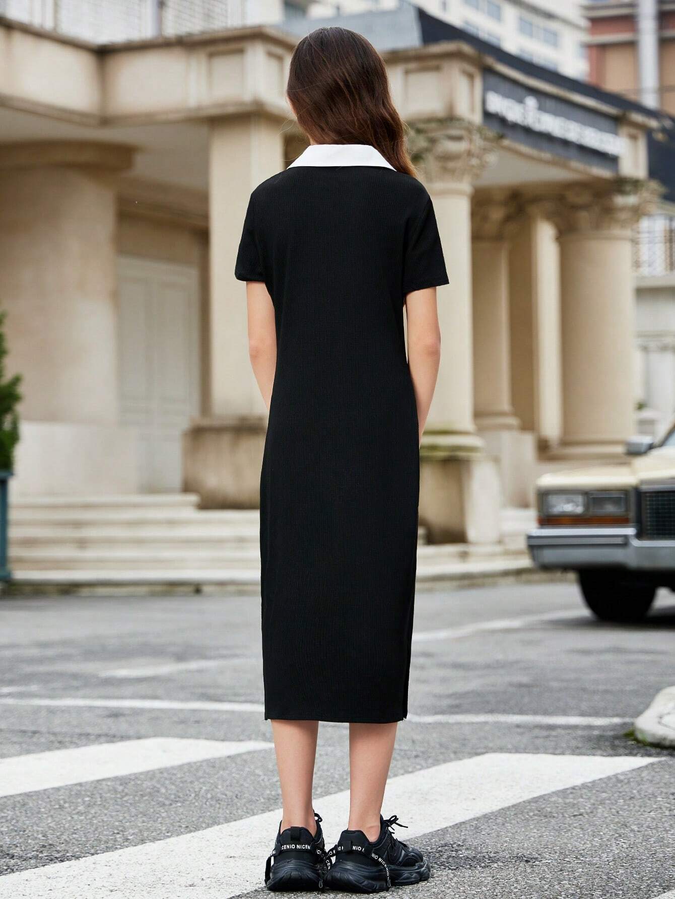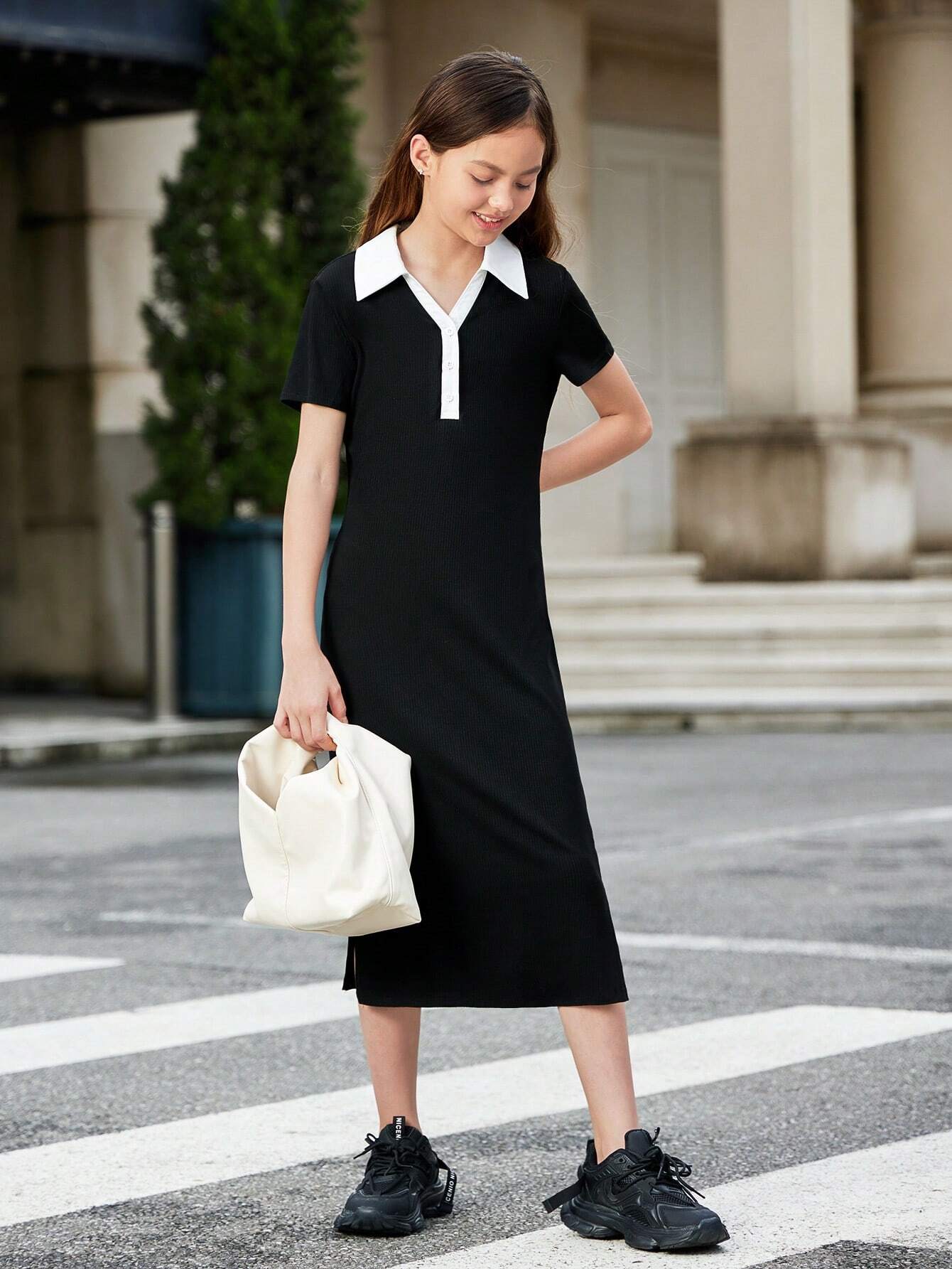 Tween Girl Loose And Elegant Color Block Collar Short Sleeved Short Dress
