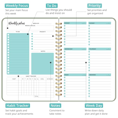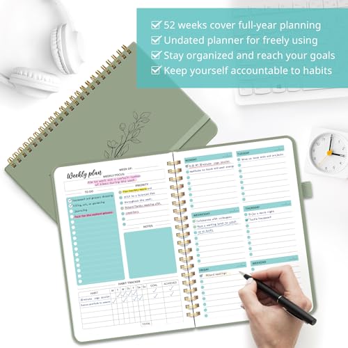 Undated Weekly Planner, Weekly To Do List Notebook with Goal & Habit Tracker Organizer, A5 Weekly Planner Notebook with Spiral Binding, 6.1″ x 8.2″ – Green