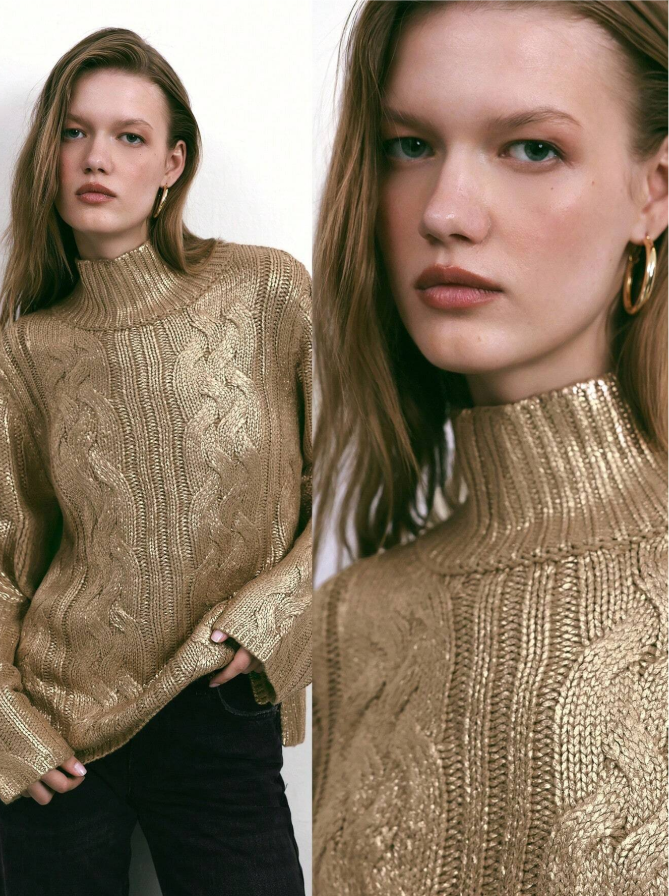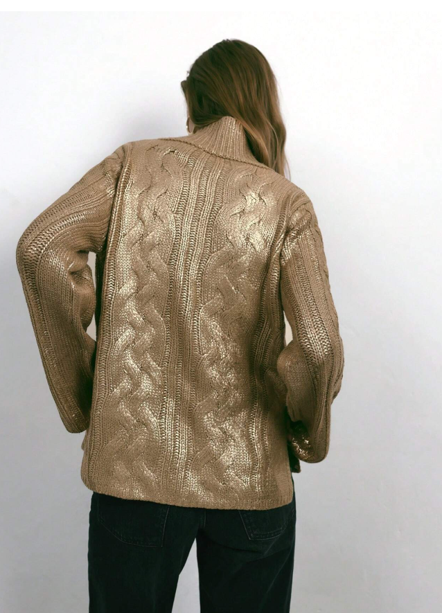 Winter New Style Golden Urban Modern Elegance Daily Casual Retro Glitter Turtleneck Metallic Woolen Cable Tie Old Money Style Party Holiday Elegant
