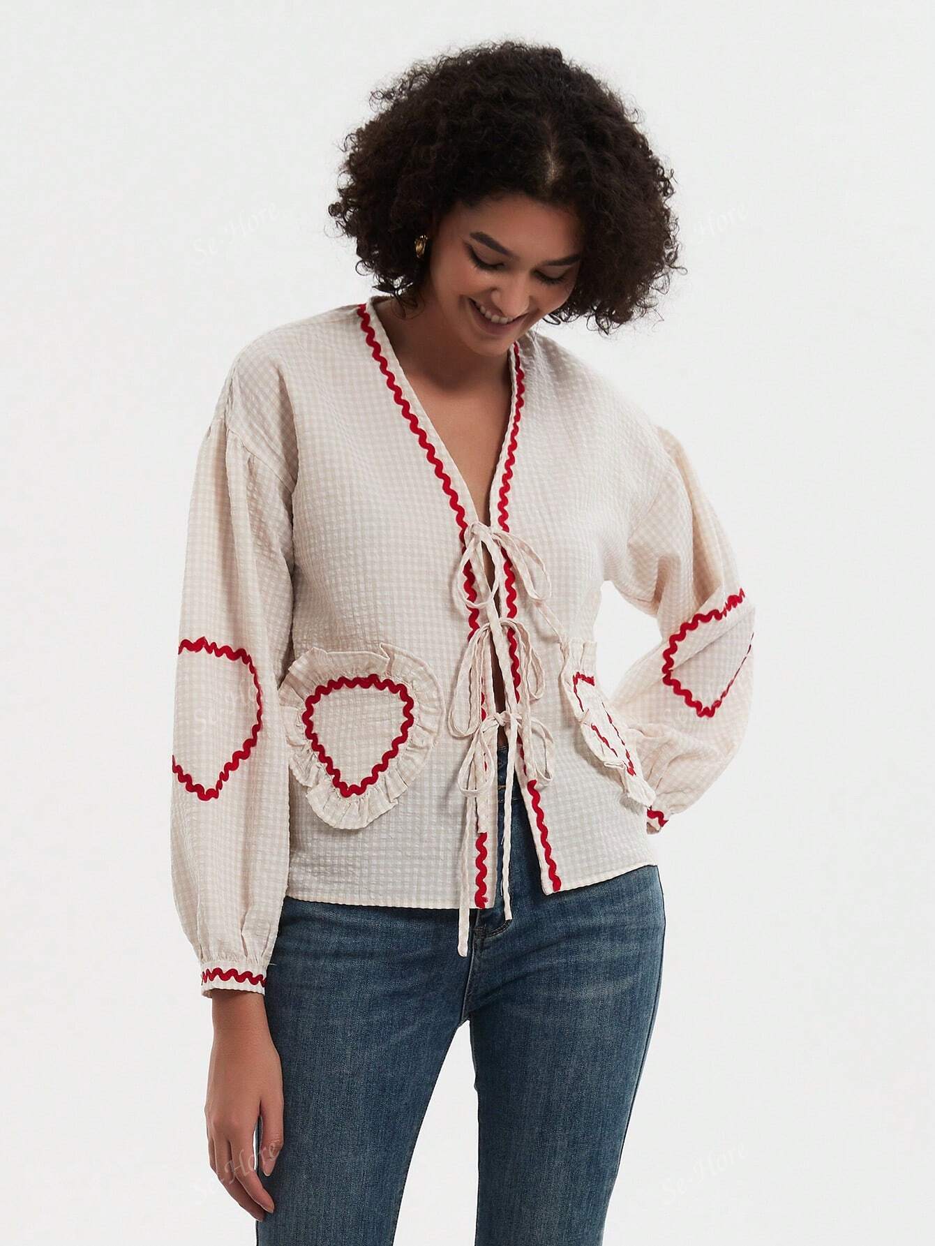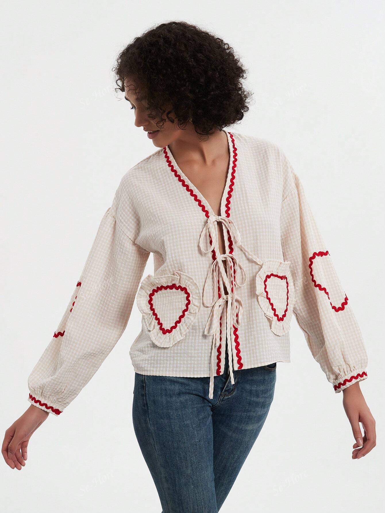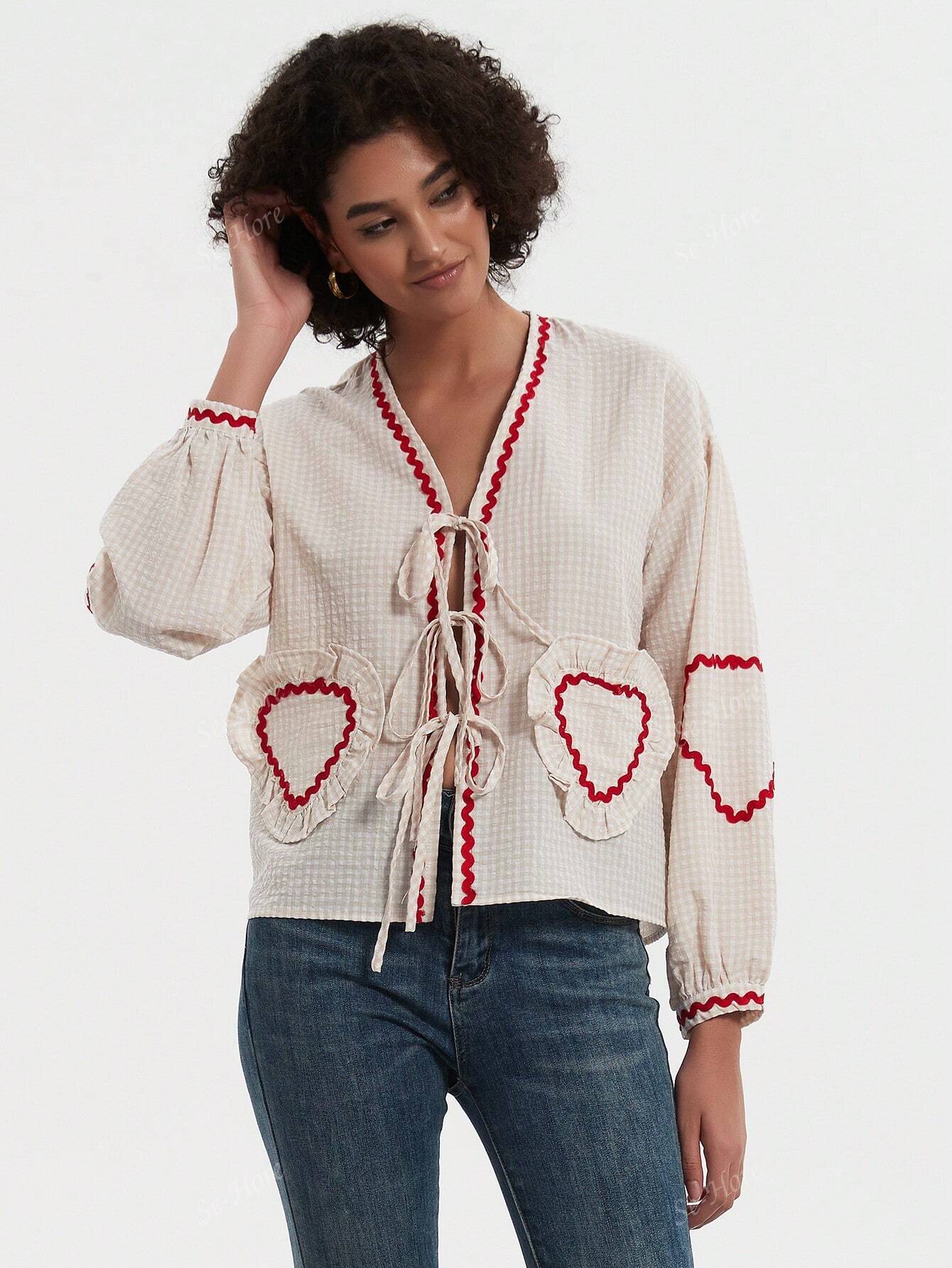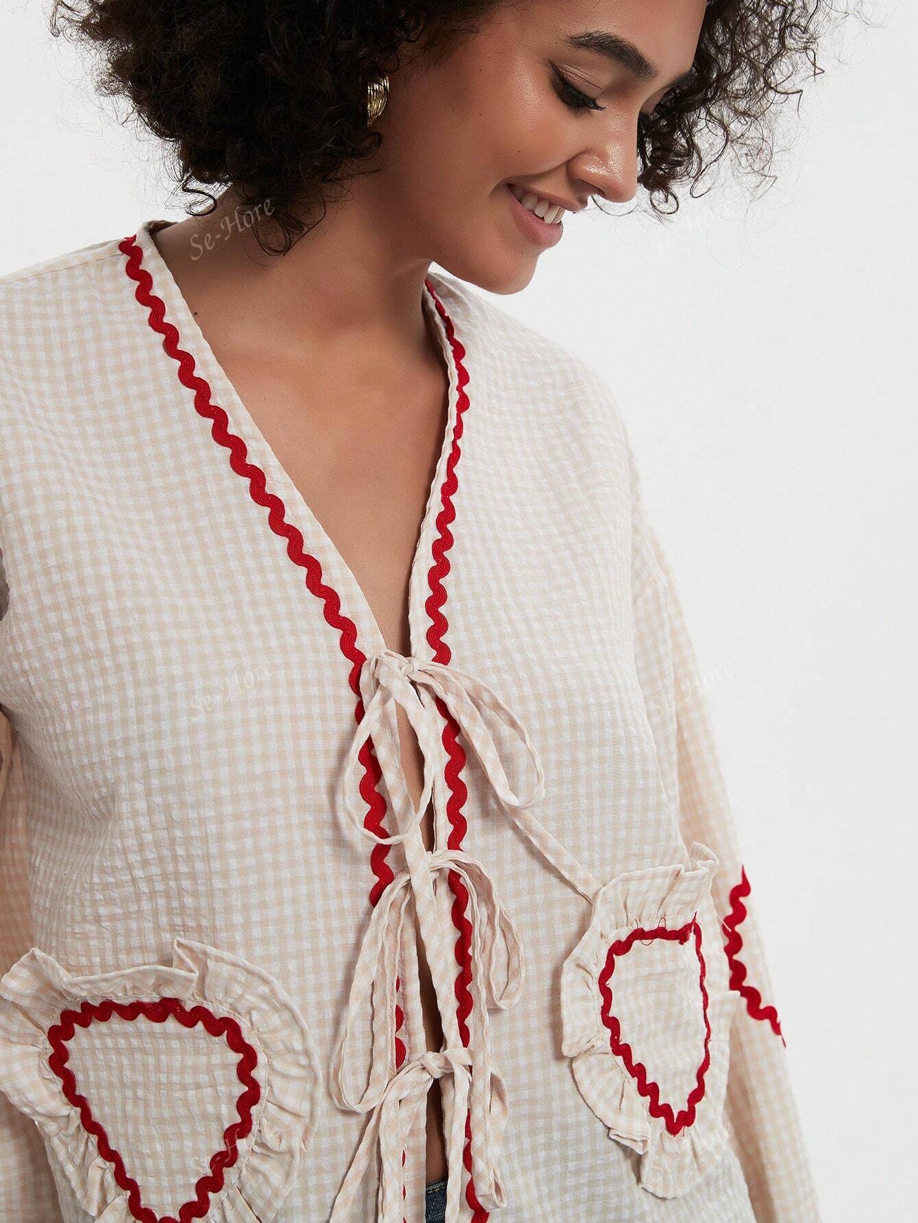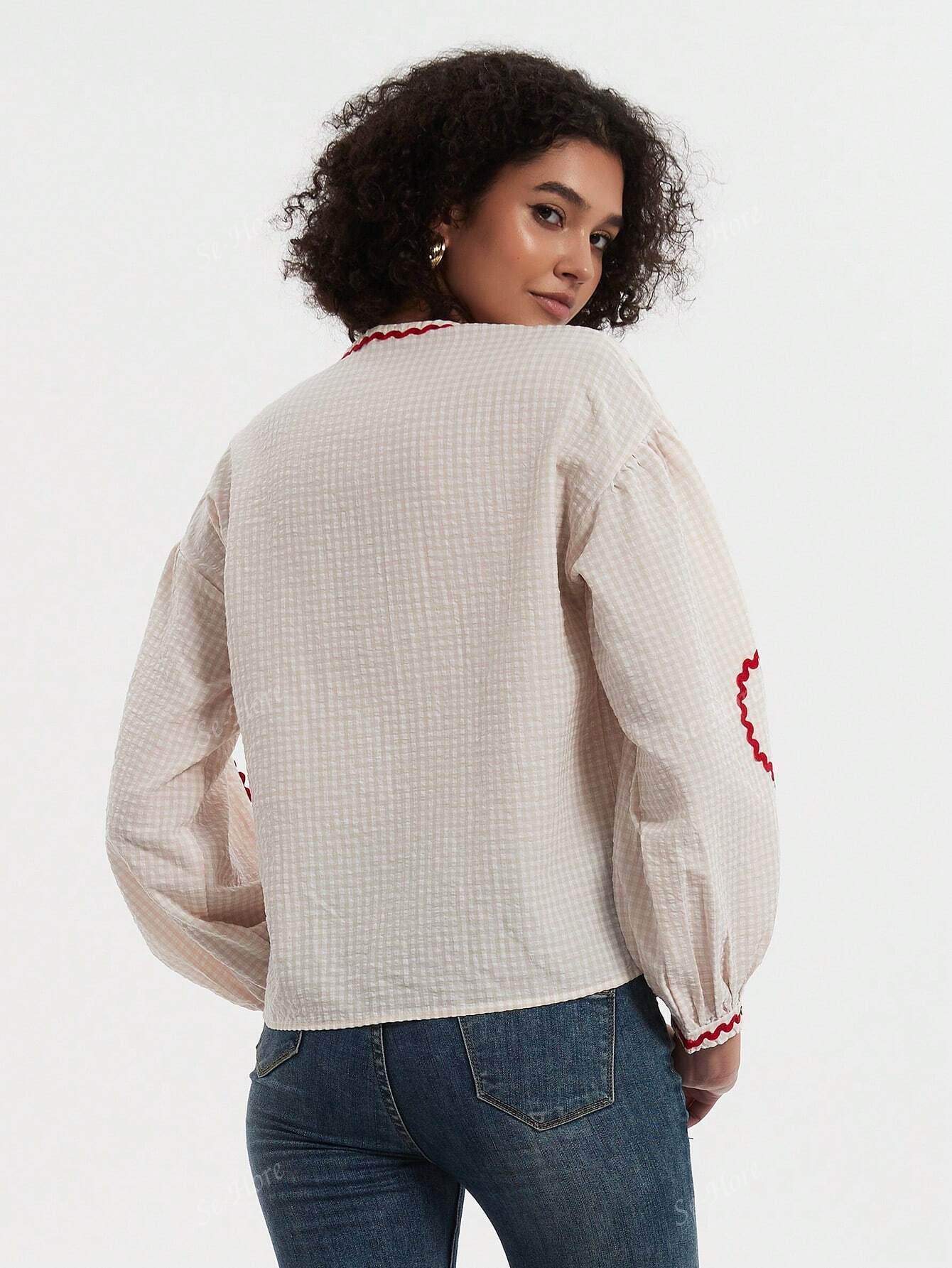 Women Spring And Summer Sweet Lace-Up Contrast Plaid Lantern Sleeve Shirt