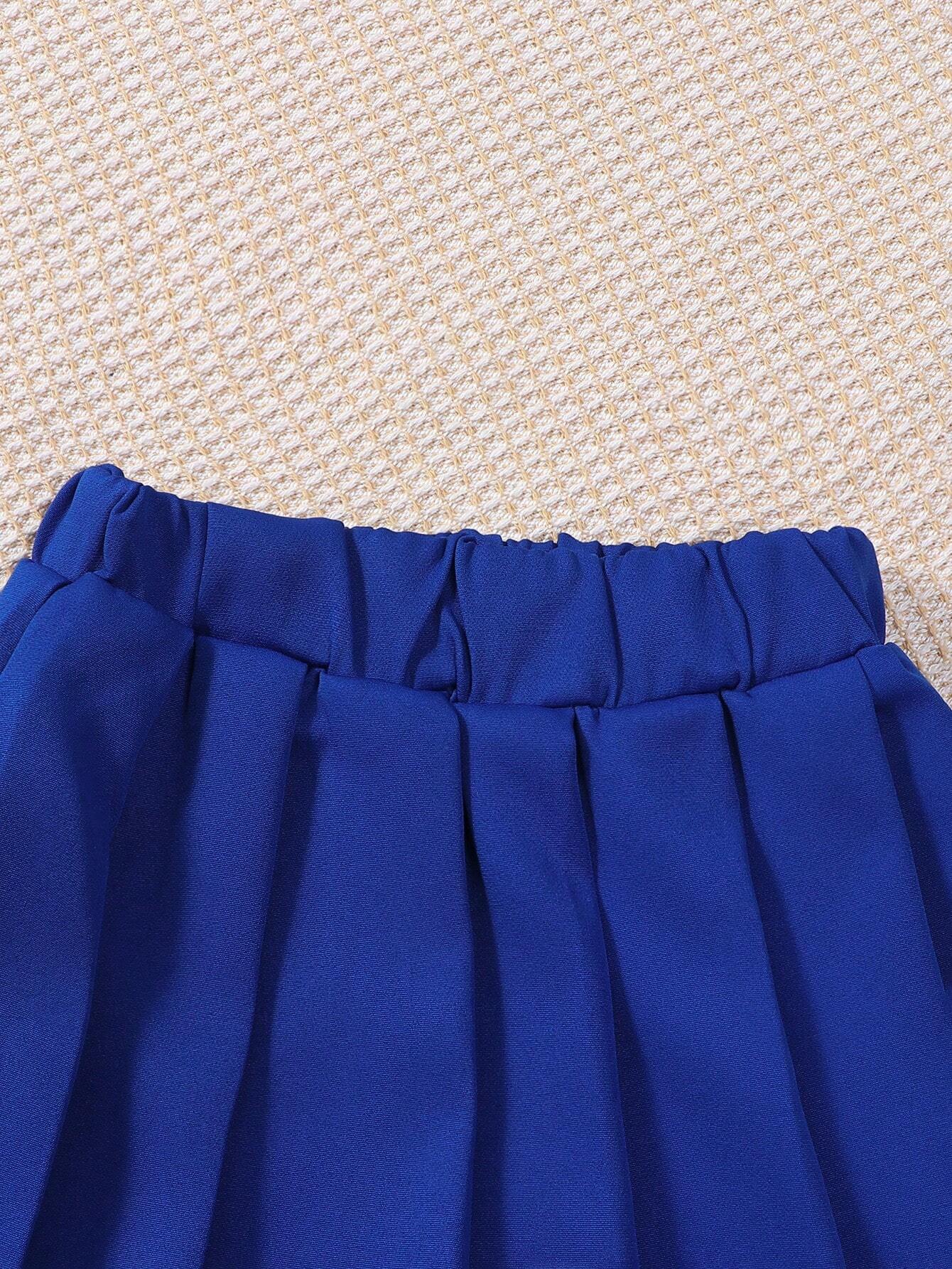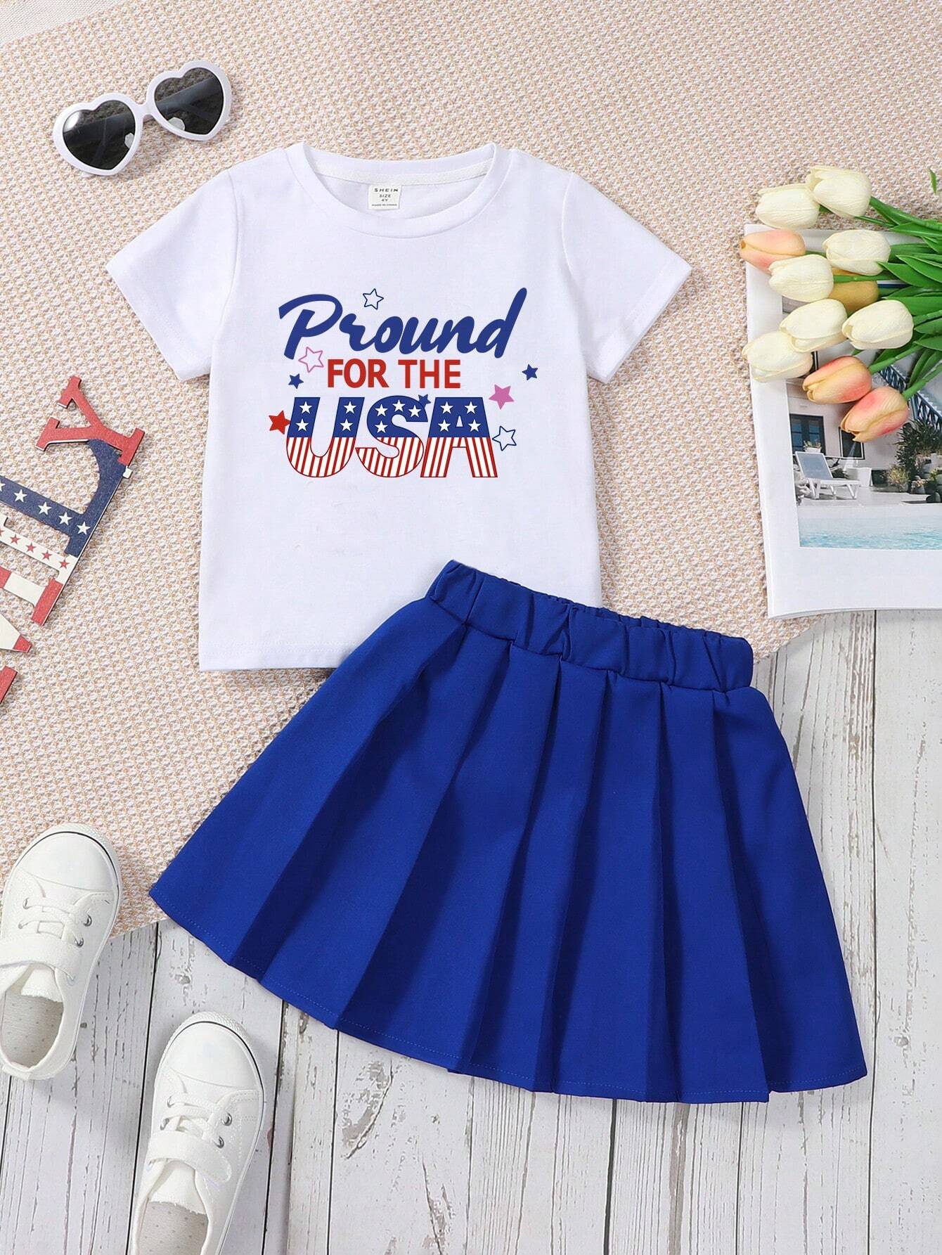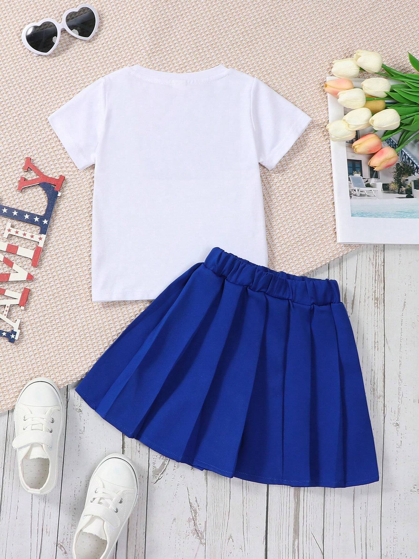 Young Girl American Independence Day White Letter Printed Fashionable Round Neck Short Sleeve T-Shirt And Blue Pleated Skirt 2pcs Matching Mommy And Me Outfits (3 Pieces Sold Separately)