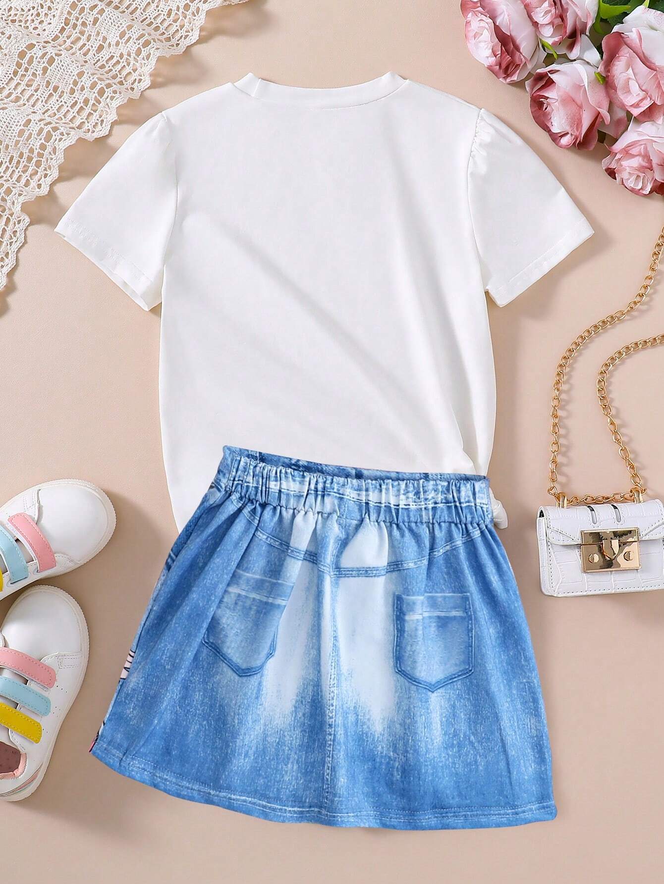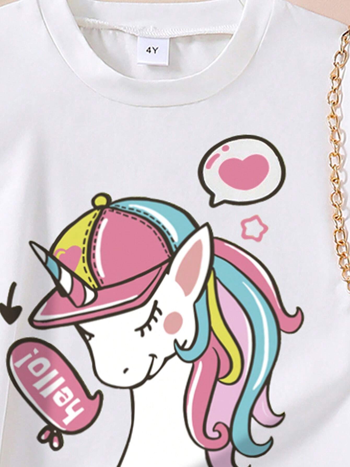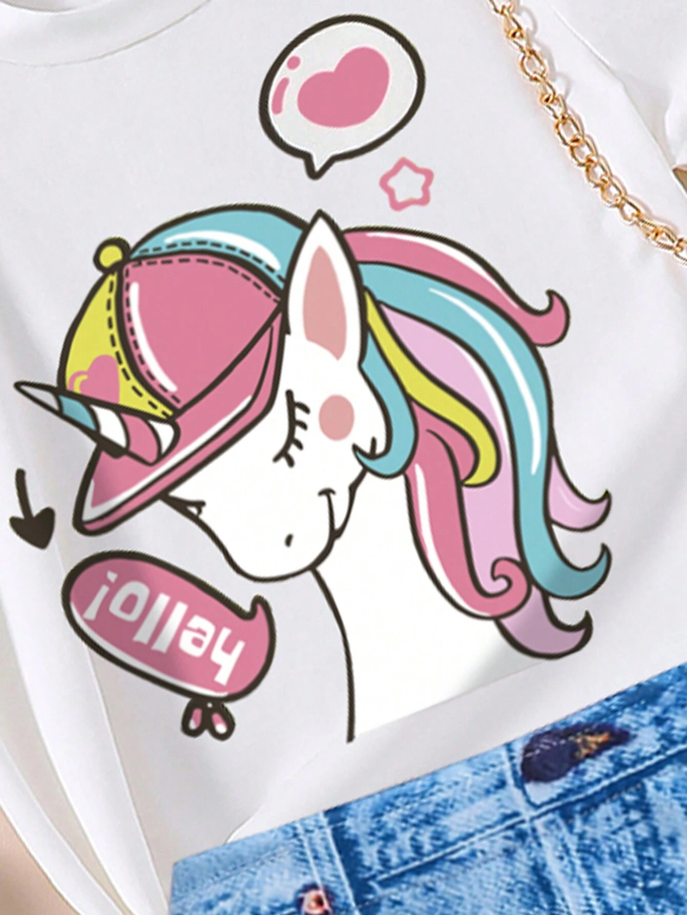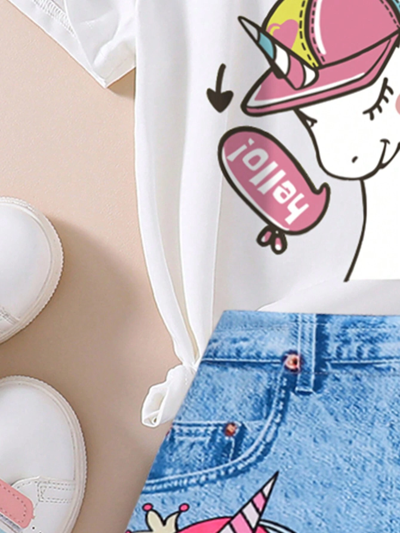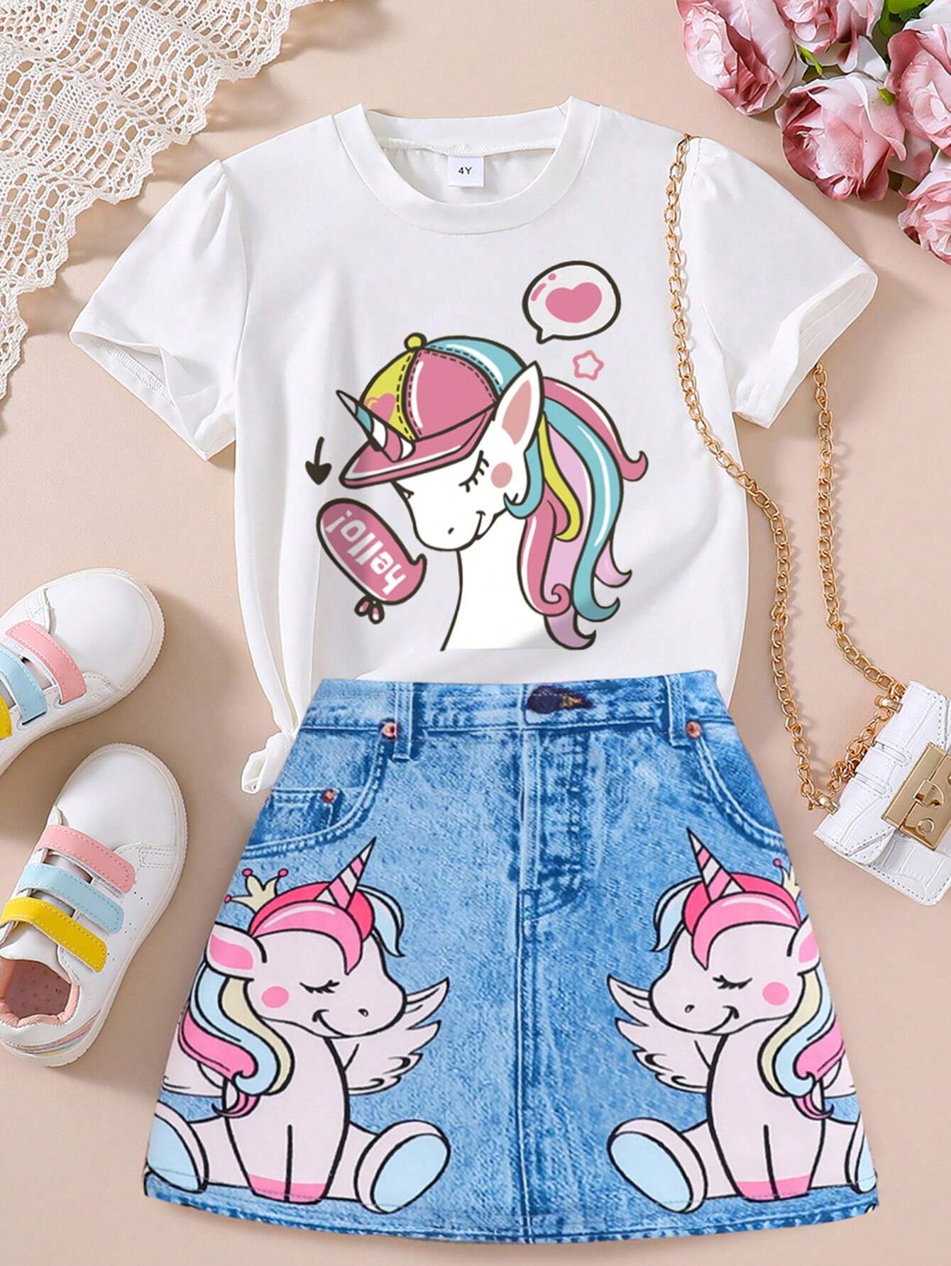 Young Girl Unicorn Pattern Printed Short Sleeve Top And Denim Print Skirt